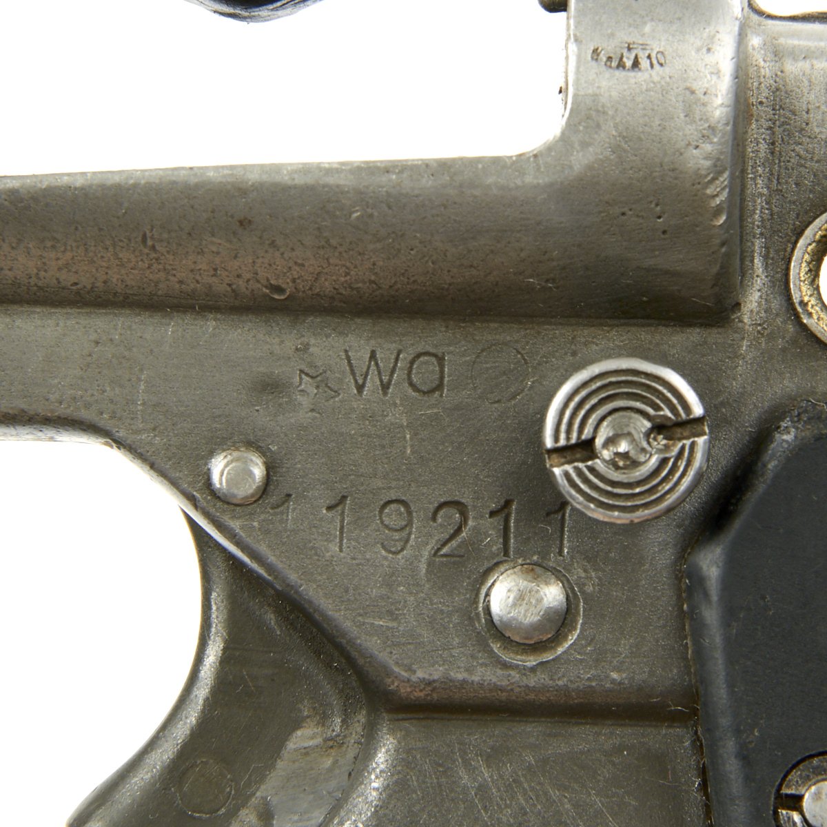 These Leuchtpistole 42 are of zinc-finished steel construction, 26.5 mm caliber, and bear the original German maker code; wa, which stands for Hasag, Hugo Schneider AG, Abteilung Lampenfabrik, Leipzig.