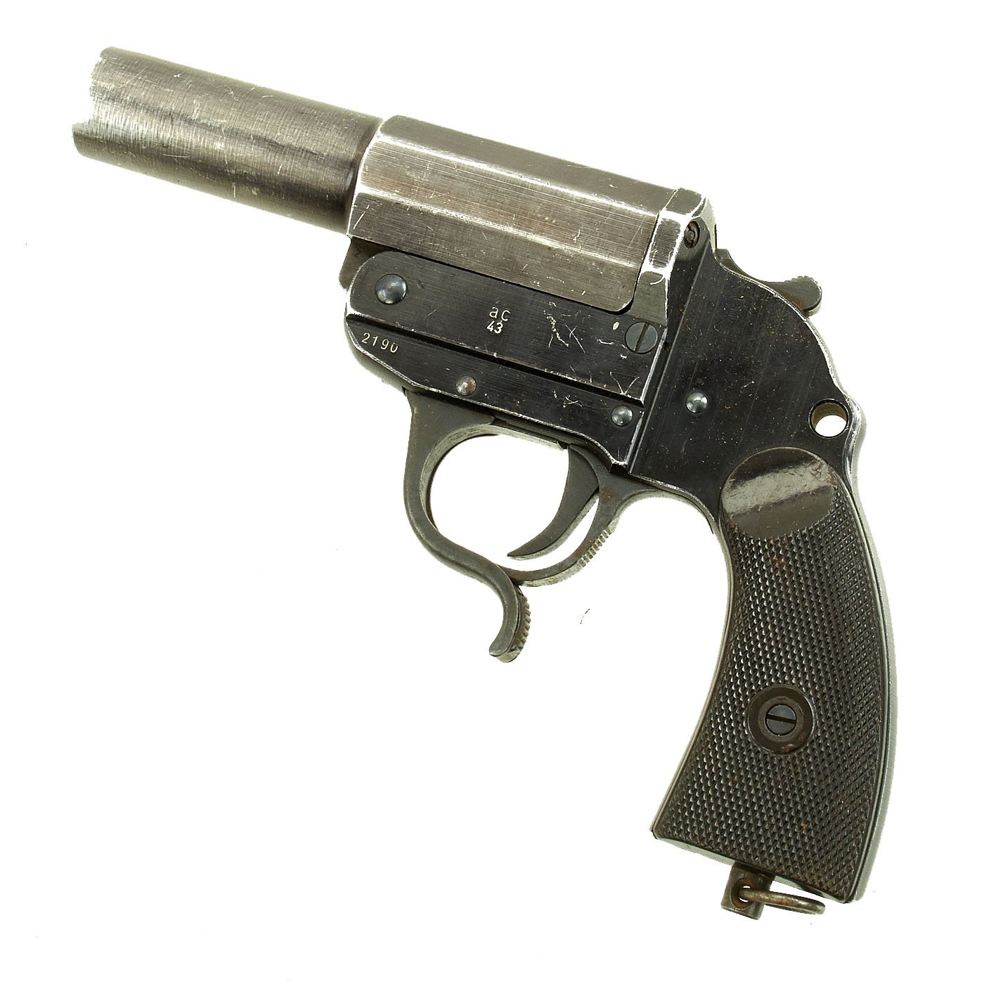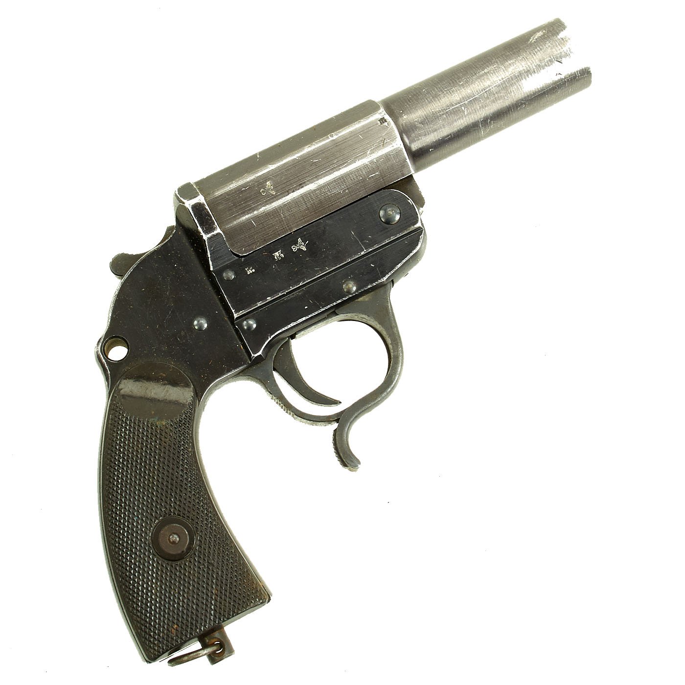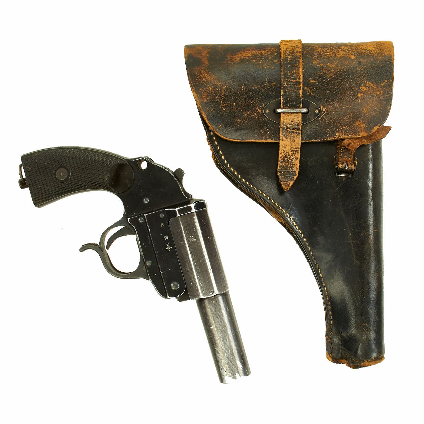 Original item: Only One Available. This is a very nice example of the classic German Wehrmacht LP-34 signal flare pistol, complete with an original period German holster. The Leuchtpistol 34, which was designed in 1934, has an aluminum alloy frame and barrel with steel moving components, uses 26.5 mm flares, and was finished in black anodized aluminum. Steel components were blued. It superseded the previous LP28, which was made of all steel, as part of a continuing evolution of Walther-designed flare pistols.