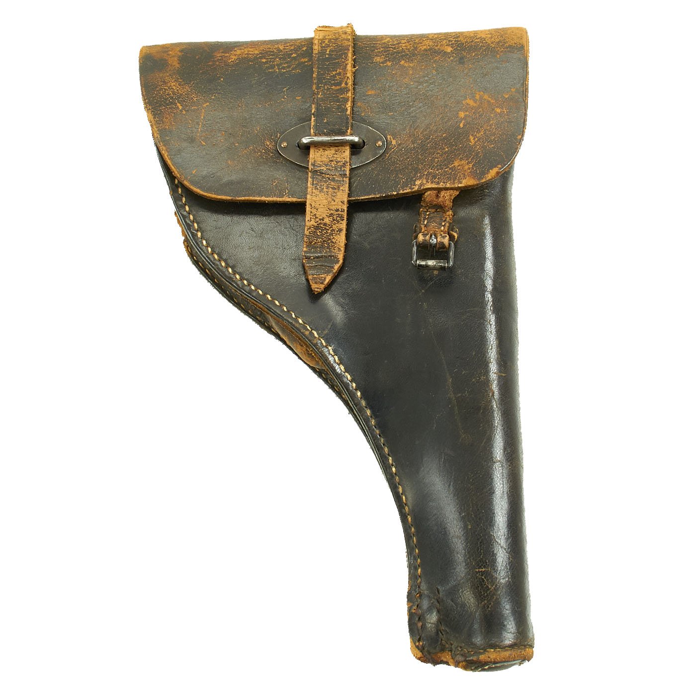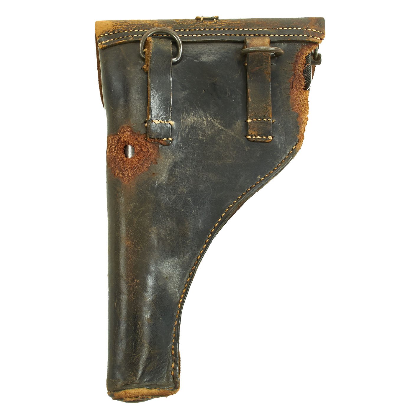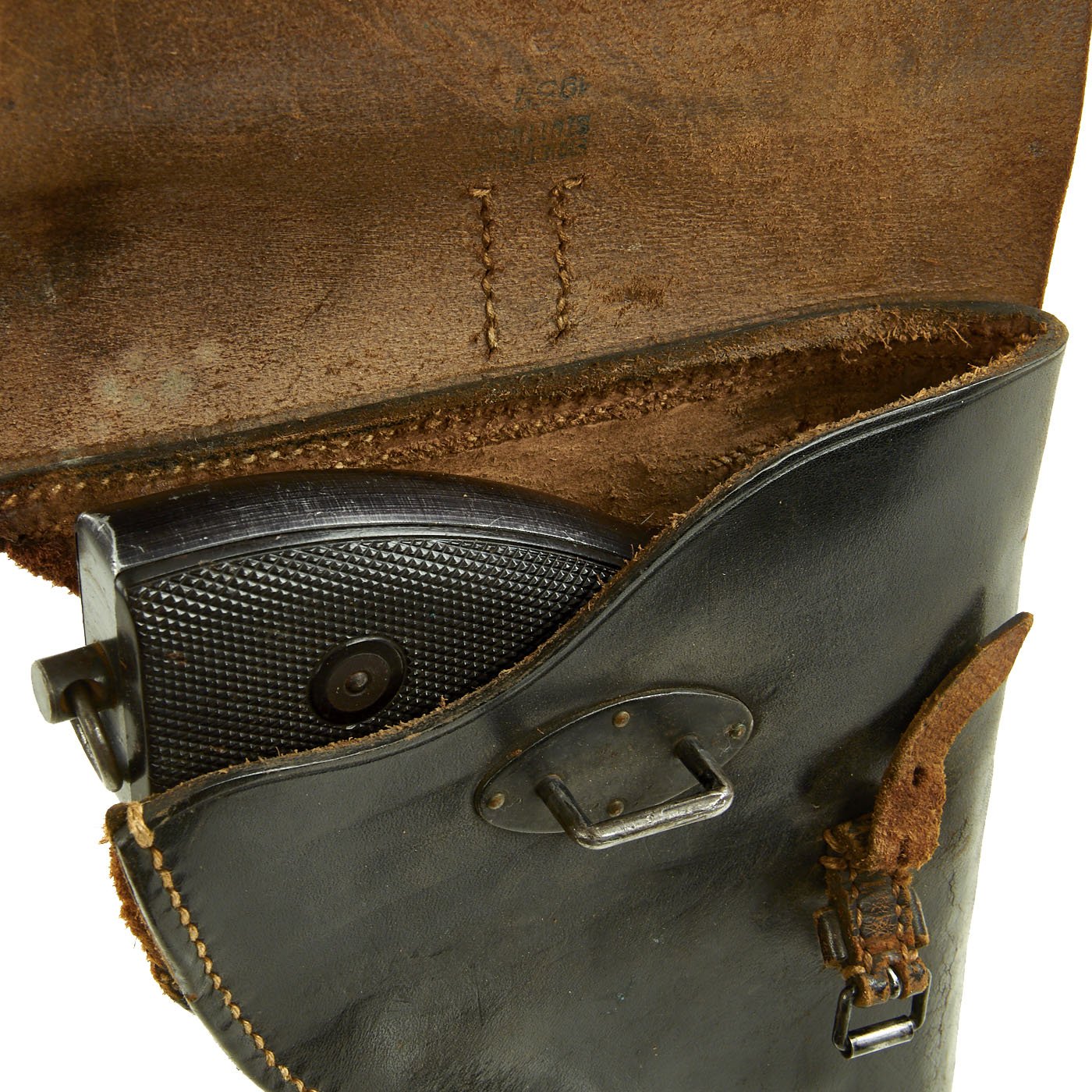 The holster is in solid condition, but is used and worn through the leather in places. It still has both belt loops and shoulder strap rings attached, and the closure strap is still in place. It has the retaining strap for the cleaning rod, however the bottom "cup" that holds it has torn off, and there are some stitched repairs at the bottom of the holster. The leather is worn through in two places on the back of the holster, probably from rubbing against the belt of the soldier who wore it. There is a faded maker mark on the inside of the top flap, which is only partly legible, indicating manufacture in the German City of STUTTGART in 1937.