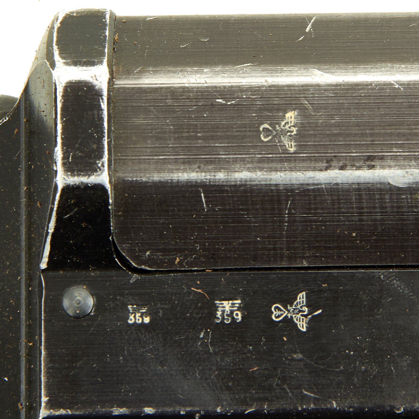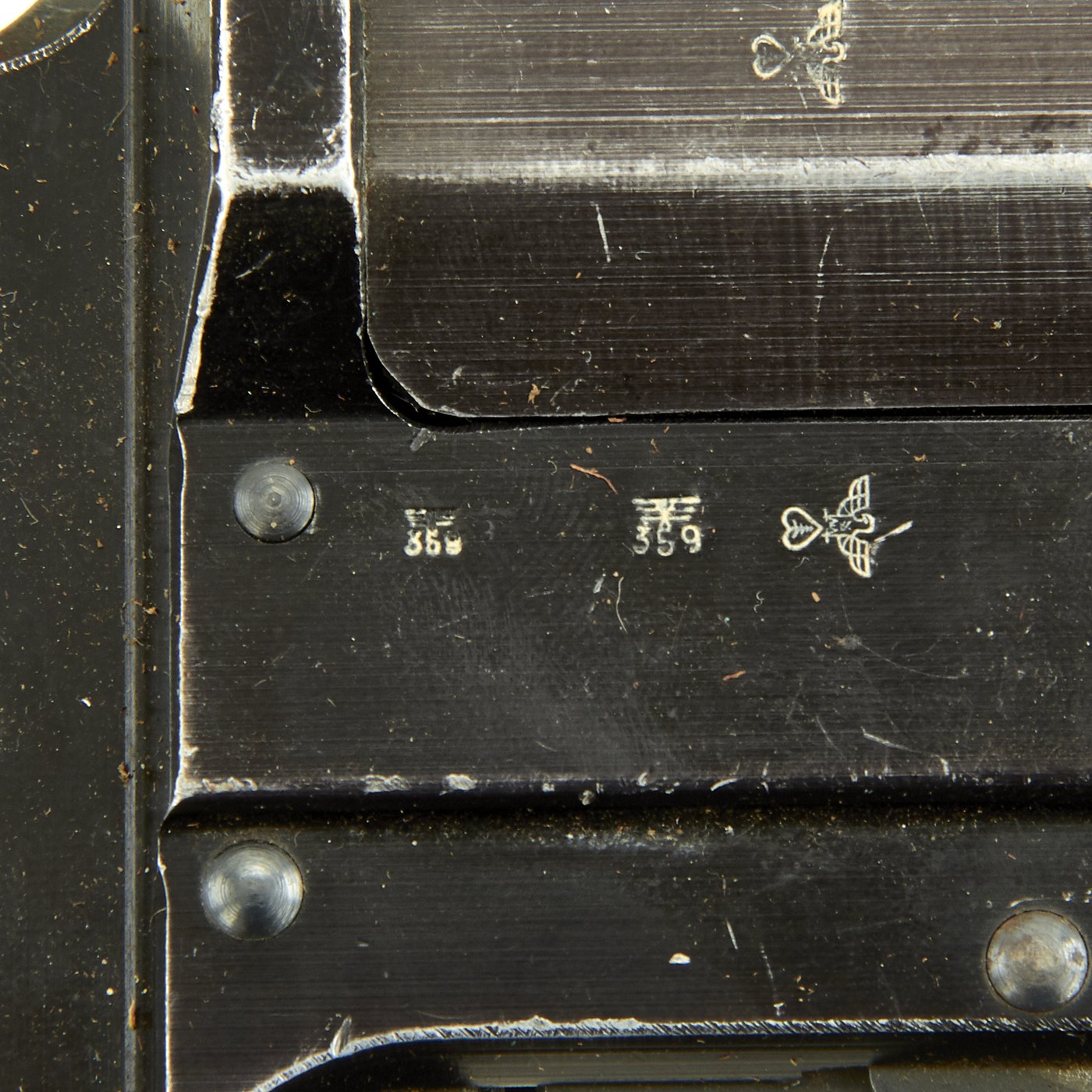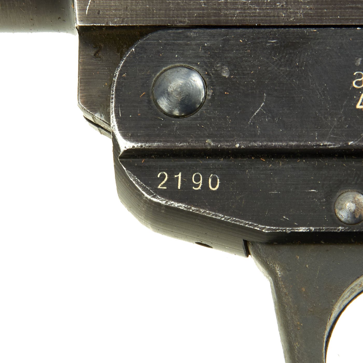 This example bears original German maker code ac, which stands for Carl Walther AG, located in Zella-Mehlis, Thuringia. Walther is the original developer of the LP 28 and 34 pistols, as well as the famous line of PP Pocket Pistols, and the P-38 Service pistol. Below this is it stamped with the manufacture date of [19]43, and it has serial number 2190 above the trigger guard and on the barrel hinge. It is nicely Waffenamt marked on the right side of the frame and barrel, with inspector number 359. It also has the interesting Eagle over a "Tree inside Inverted Heart" stamping, which is apparently for Thuringia, the "Green Heart" of Germany.