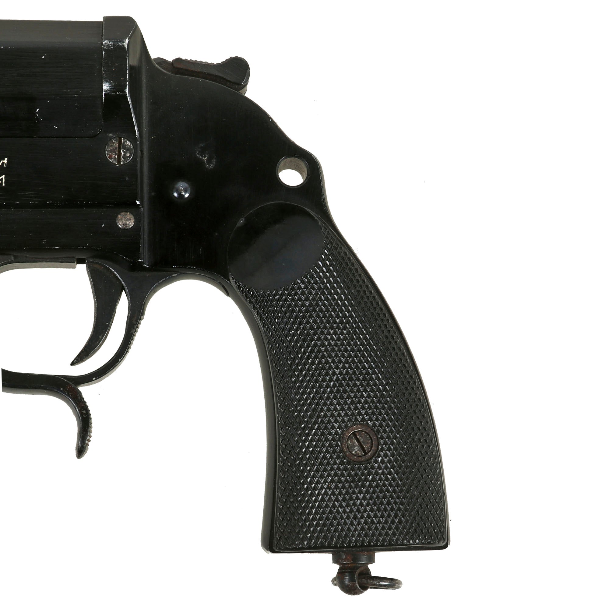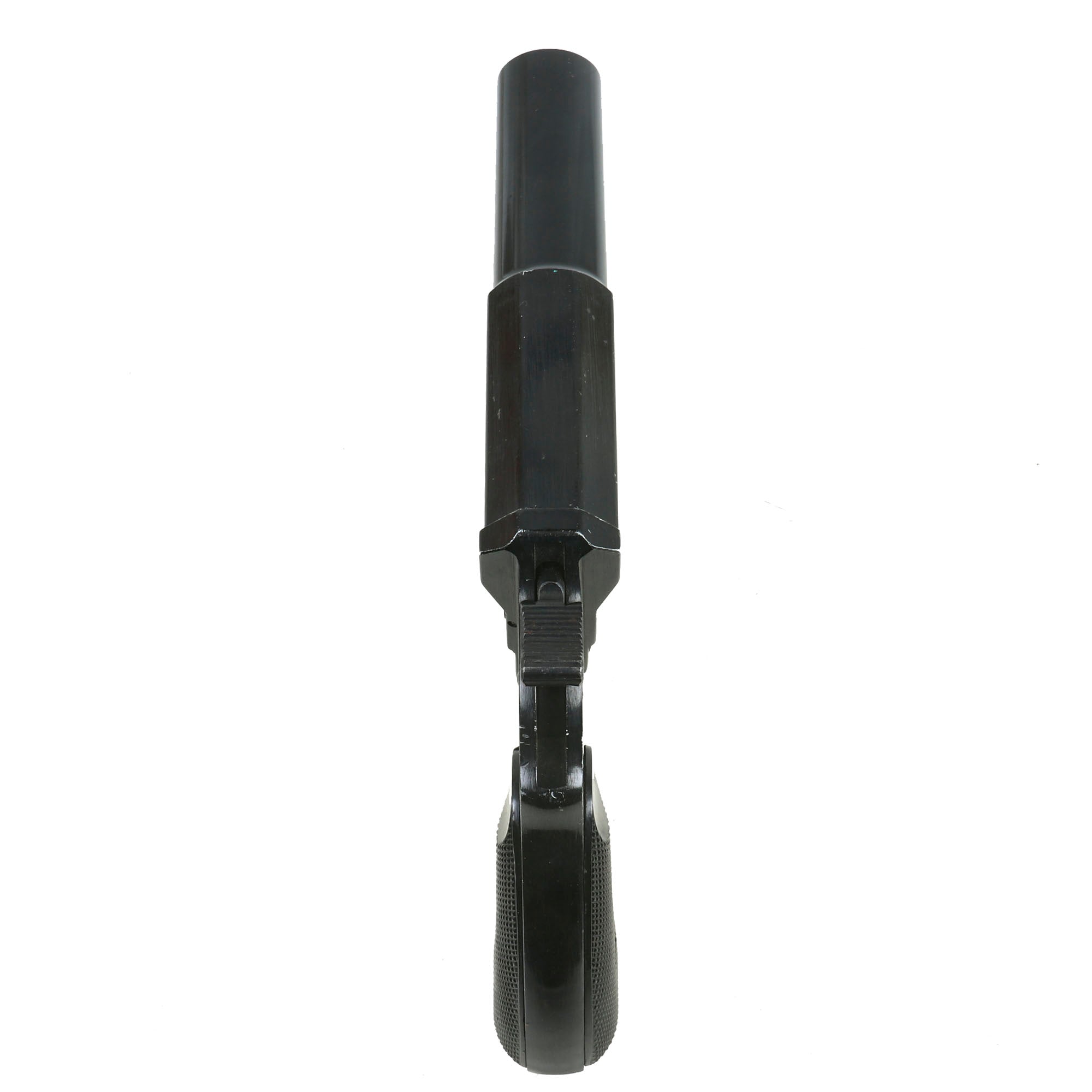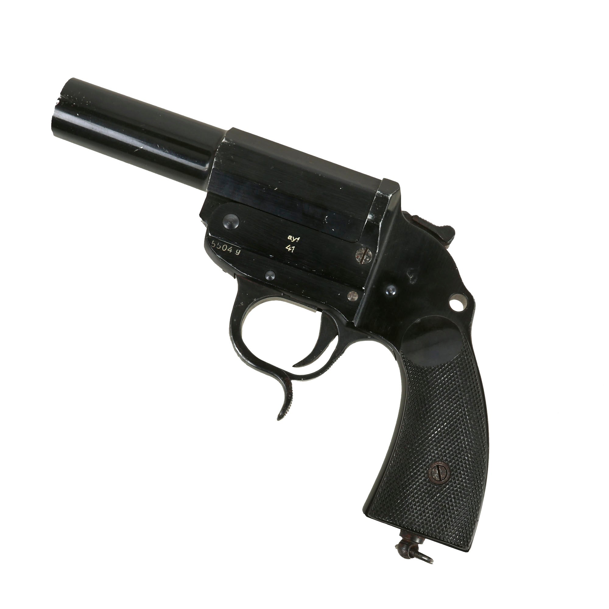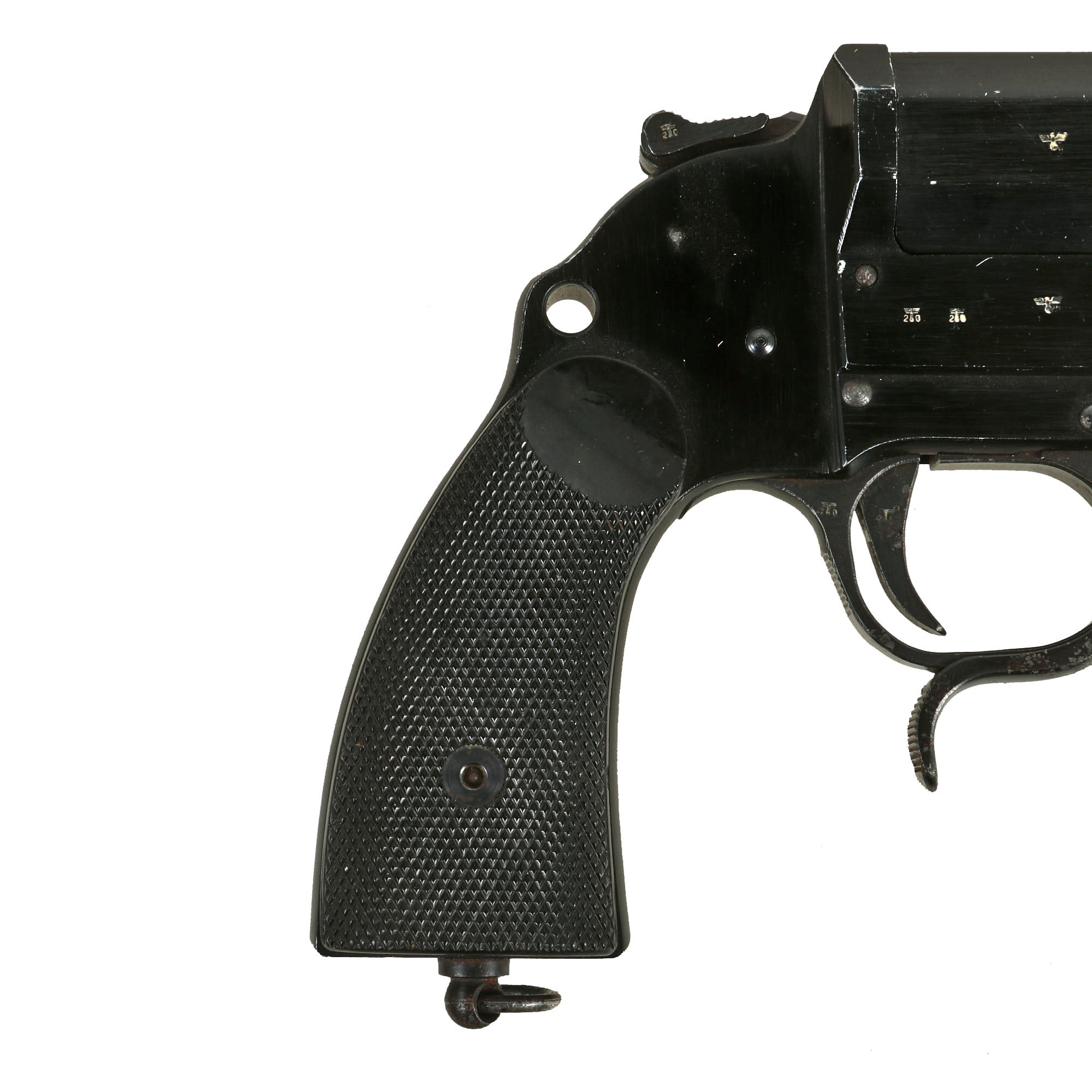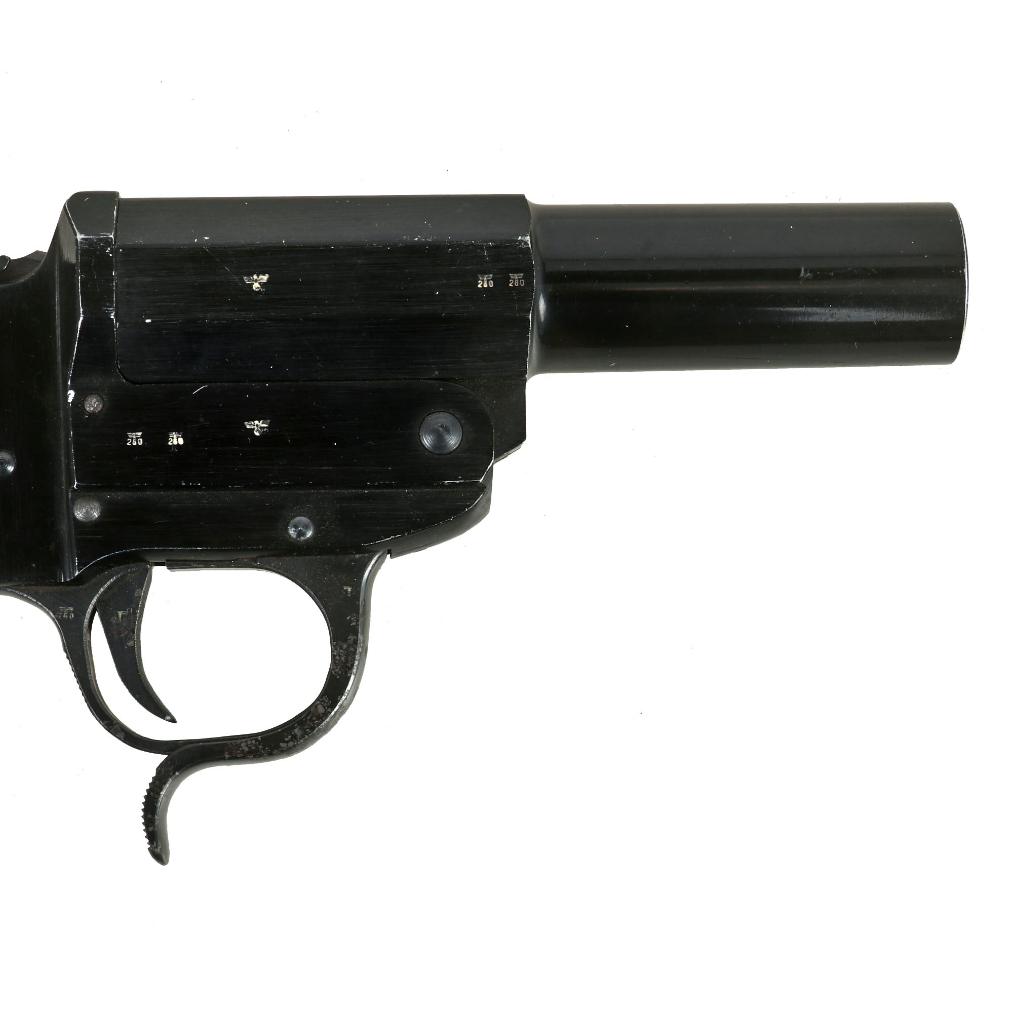 Original item: Only One Available. This is a wonderful example of the classic German Wehrmacht LP-34 signal flare pistol, which was designed in 1934. The Leuchtpistol 34 has an aluminum alloy frame and barrel with steel moving components, uses 26.5 mm flares, and was finished in black anodized aluminum. Steel components were blued. It superseded the previous LP28, which was made of all steel, as part of a continuing evolution of Walther-designed flare pistols.