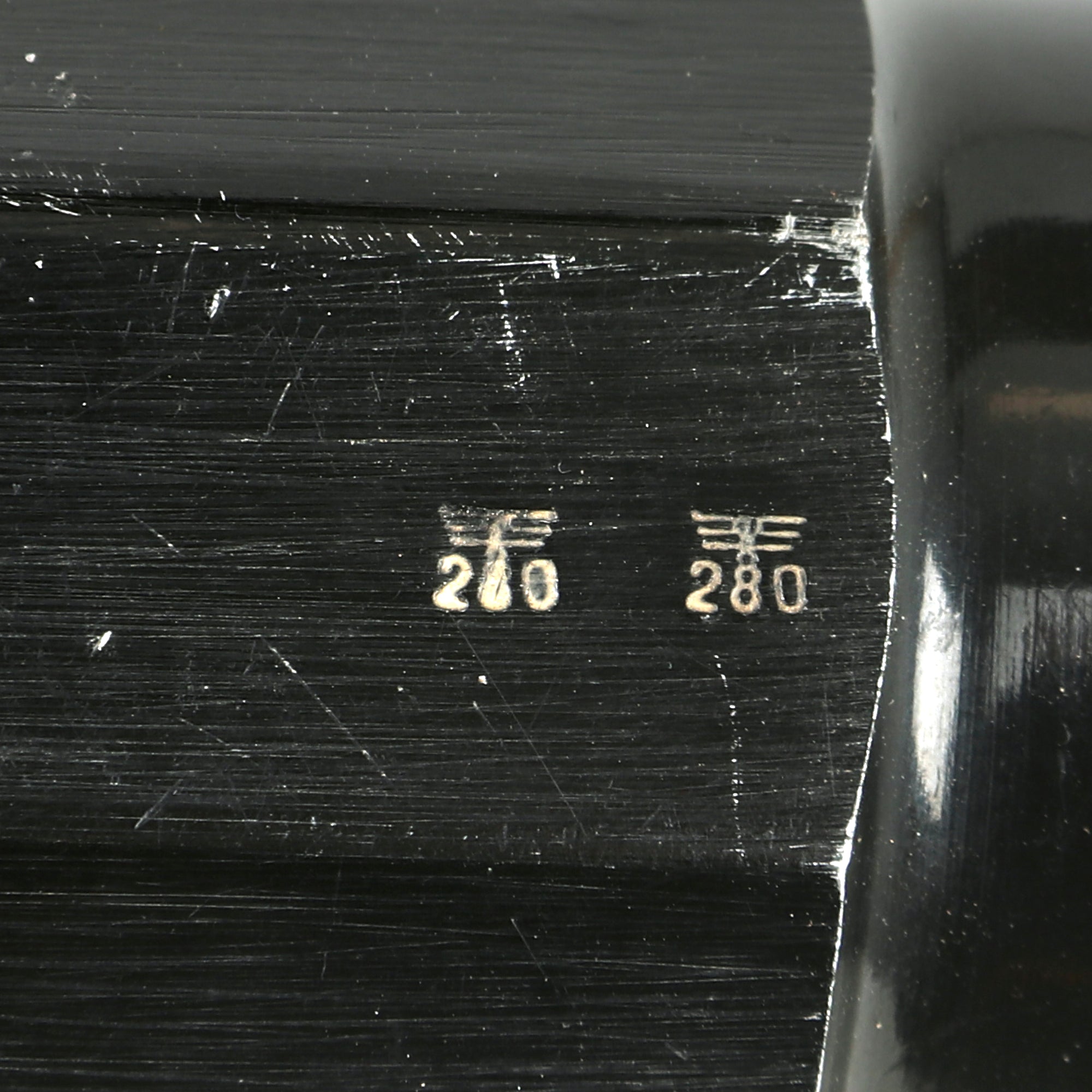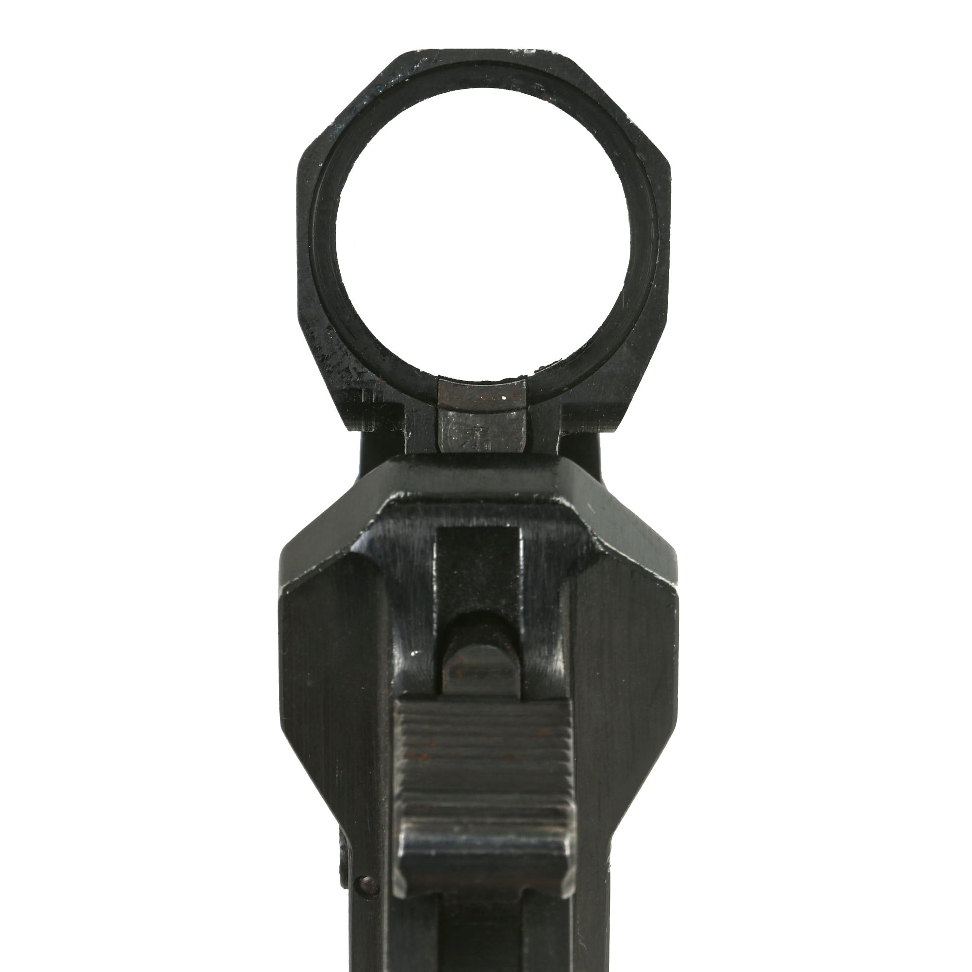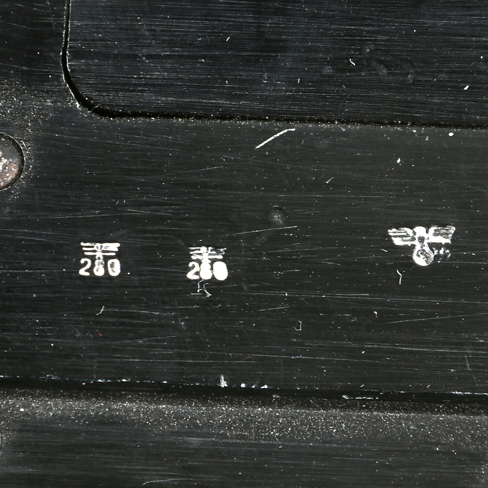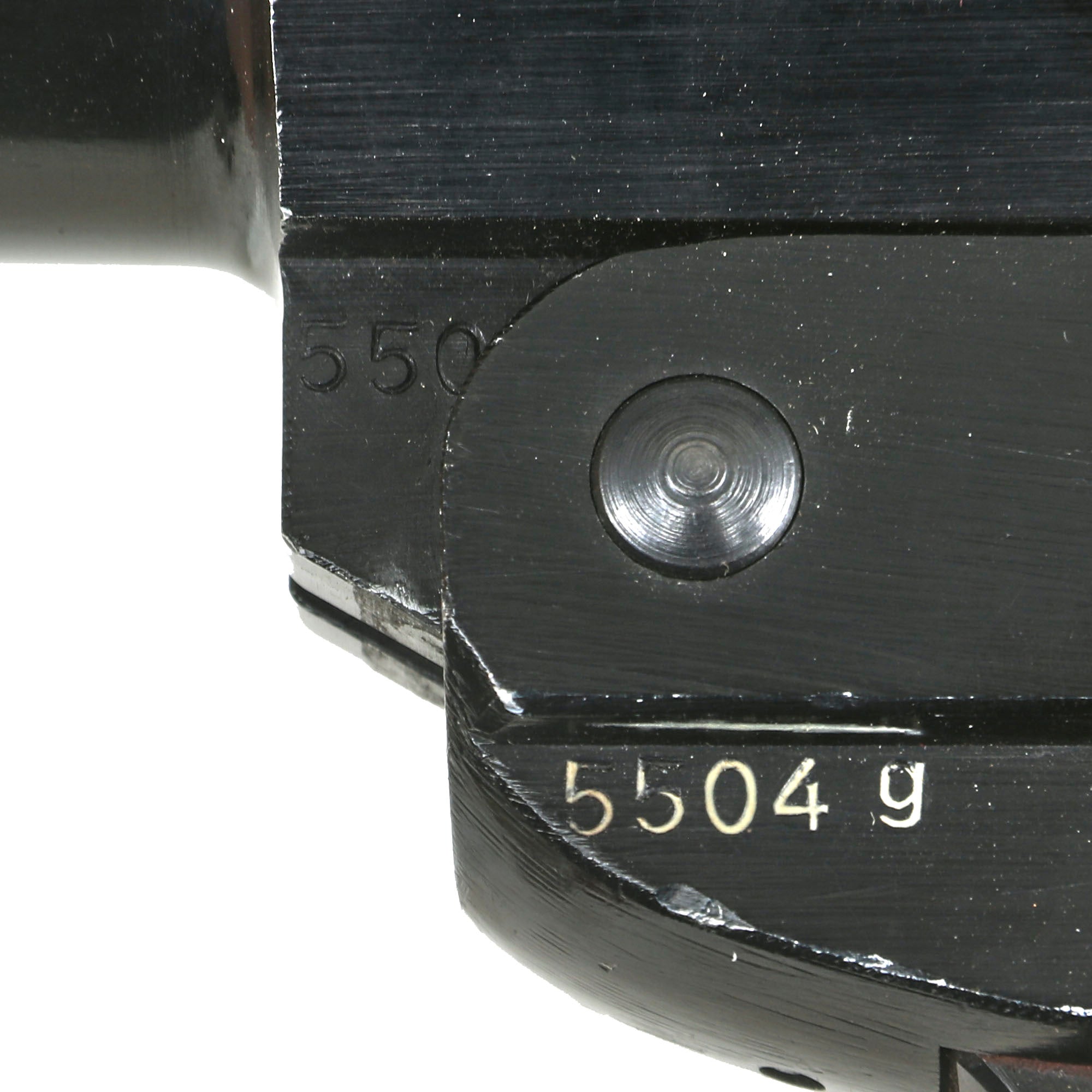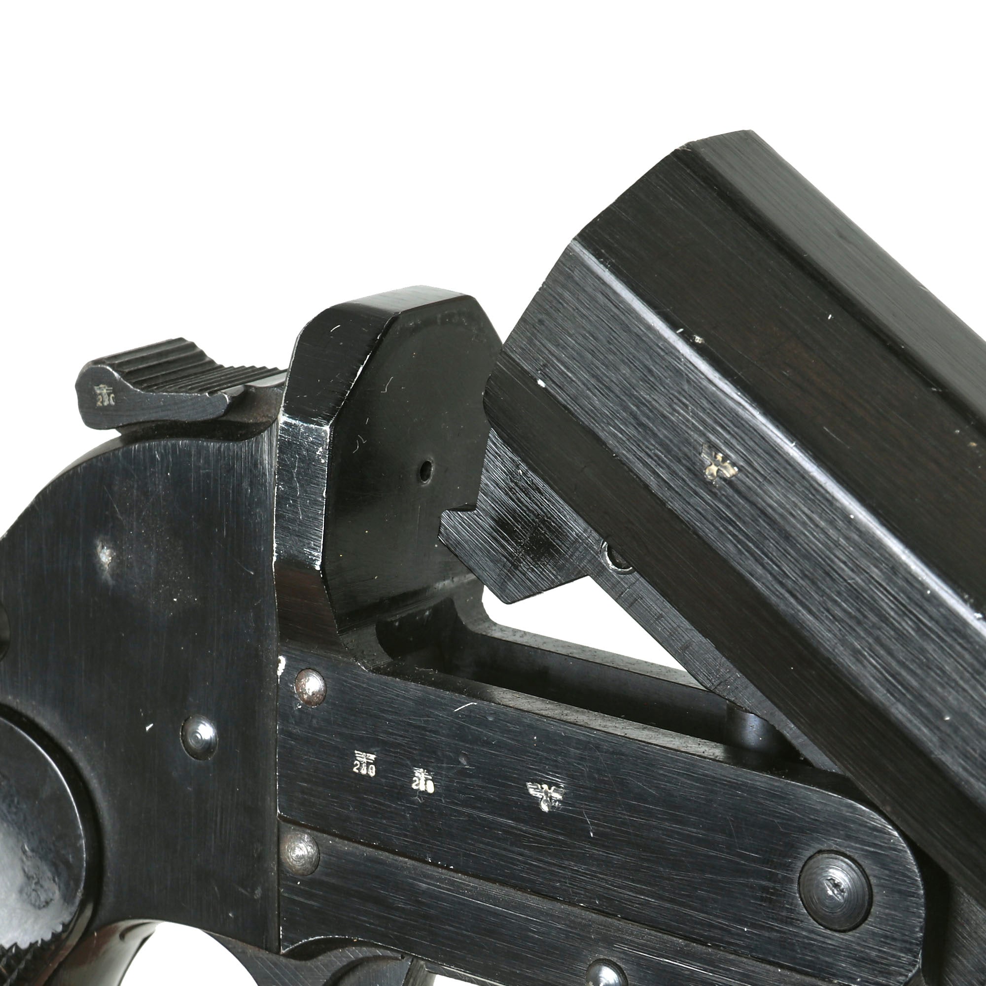 This example bears original German maker code ayf / 41, which stands for 1941 manufacture by the legendary ERMA-Erfurter Maschinenfabrik B. Geipel GmbH of Erfurt, a German weapons manufacturer founded in 1922 by Berthold Geipel. Prior to and during World War II it manufactured many firearms, including the Karabiner 98k, the MP40 and other submachine guns. Below this is it stamped with the manufacture date of [19]43, and it has serial number 5504g above the trigger guard and on the barrel by the hinge. It is nicely Waffenamt marked on the right side of the frame and barrel, with inspector number 280, correct for ERMA.