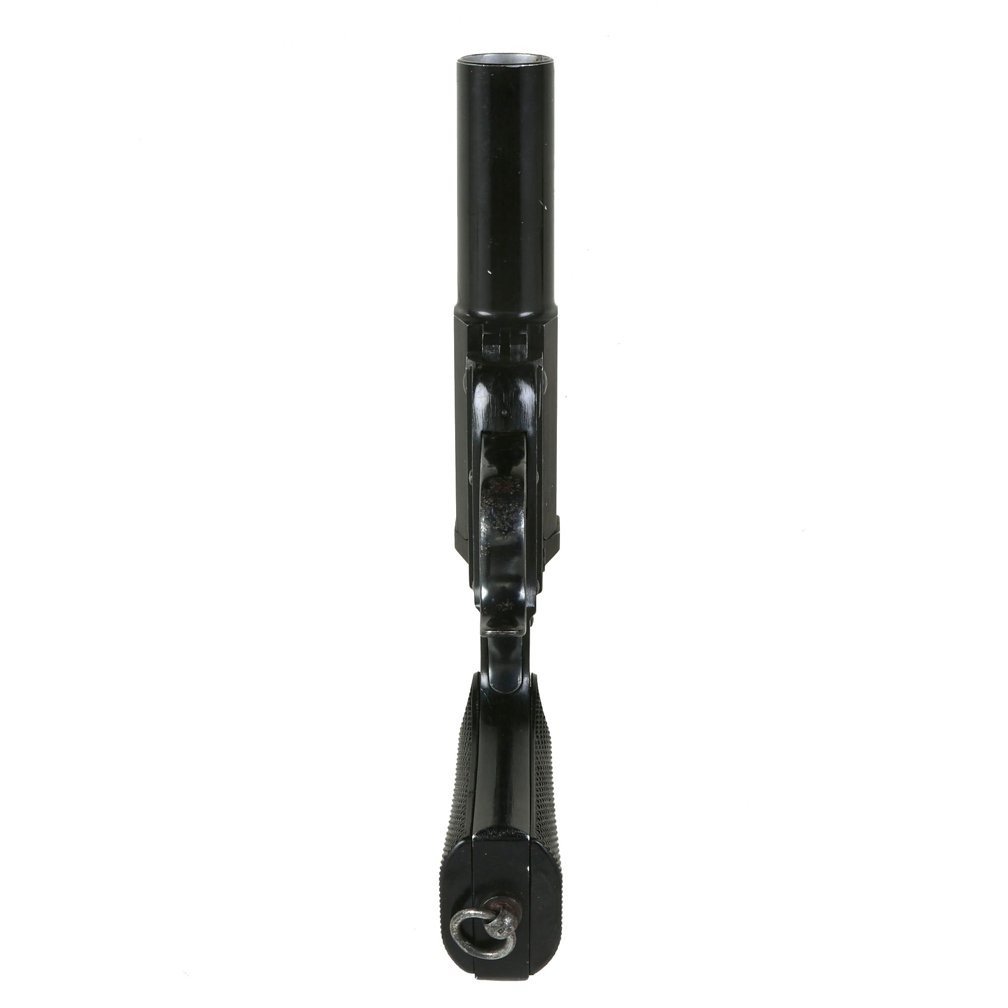 Completely Original German WW2 manufacture in very good complete condition with later war flat-sided black bakelite checkered grip panels. The pistol is very clean, and still has almost all of the original anodized finish on the aluminum components. Also, the color has not faded to green, as it would if subjected to a lot of wear. The steel components still have their original heavy blued finish. It still has the original lanyard ring, though it is a later war revision, so the ring is not removable. It also has a small indicator to show when a cartridge is loaded on the left rear breech.
