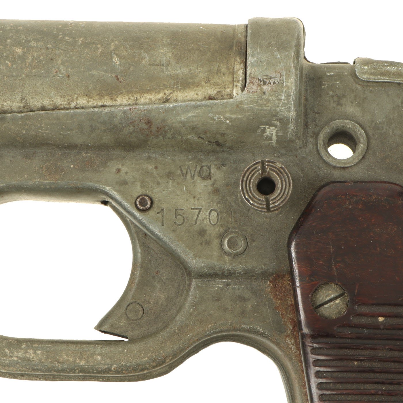 Original item: One of a Kind: This is a wonderful example of the classic German Wehrmacht LP-42 signal flare pistol, which entered service in 1943. The Leuchtpistole 42 is of all steel construction, uses 26.5 mm flares, and was available in zinc or black painted finish. It superseded the previous LP34, which was made of aluminum, and took longer to make than the stamped steel body of the LP42. This example bears original German maker code wa, which stands for HASAG-Eisen- & Metallwerke GmbH, previously known as Hugo Schneider AG, Abteilung Lampenfabrik, Leipzig. Below this is it stamped with serial number 1570, and is nicely Waffenamt WaAA10 marked on the left side of the breech.
