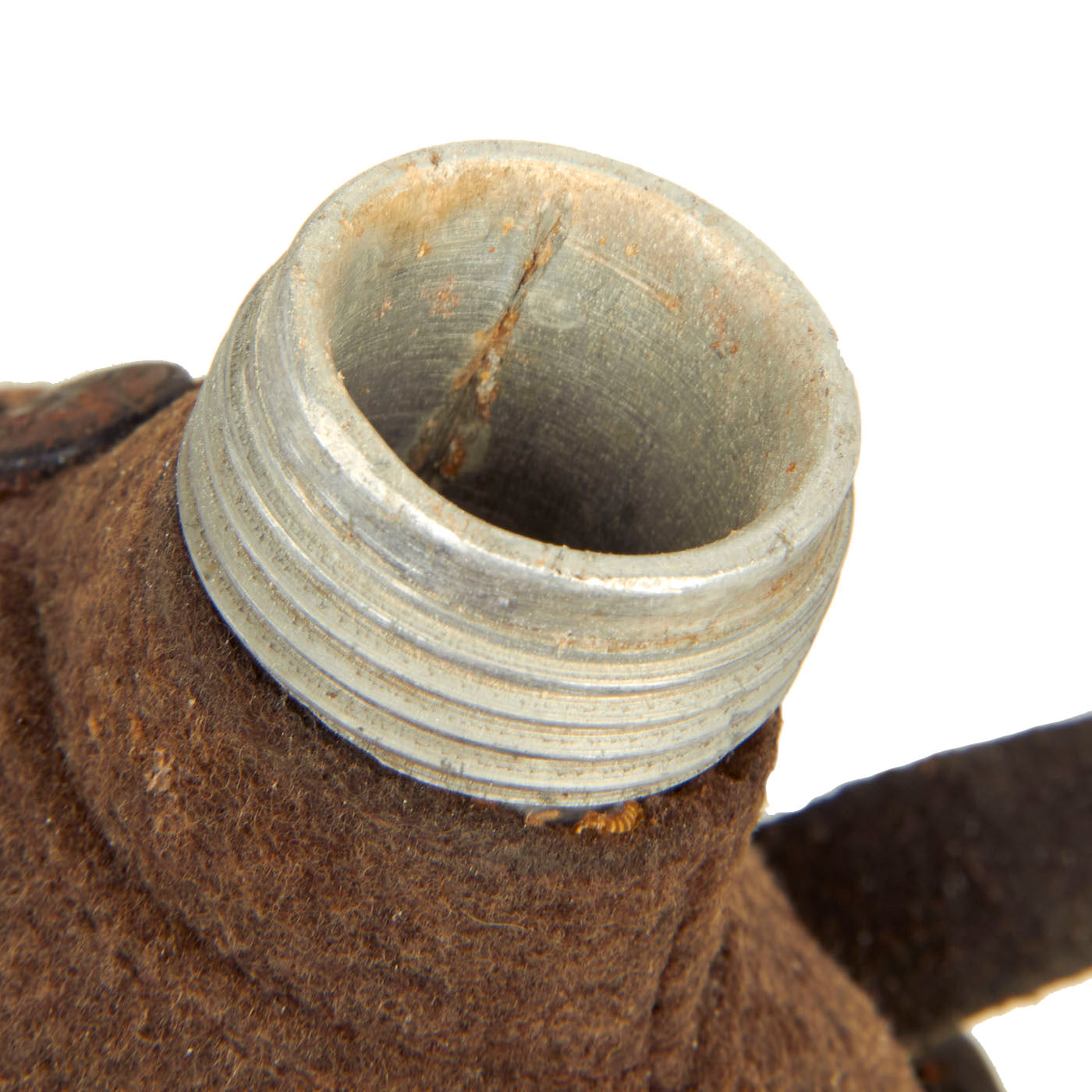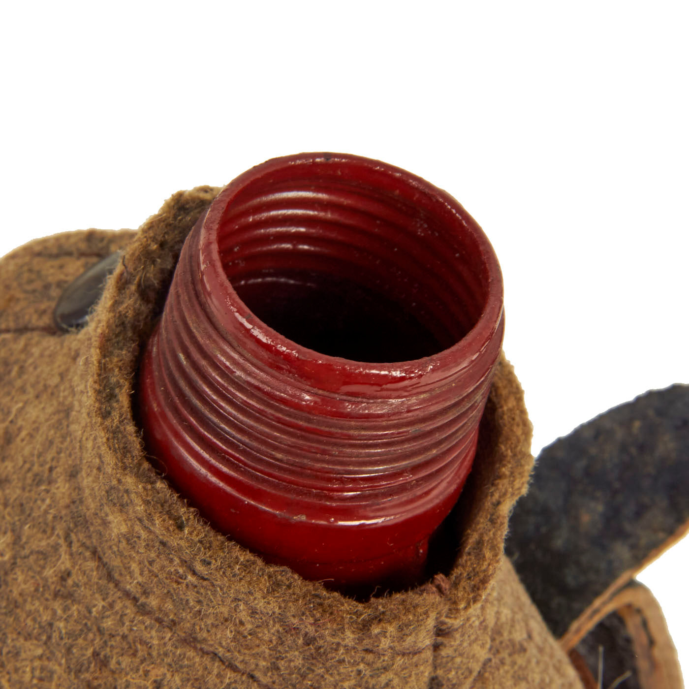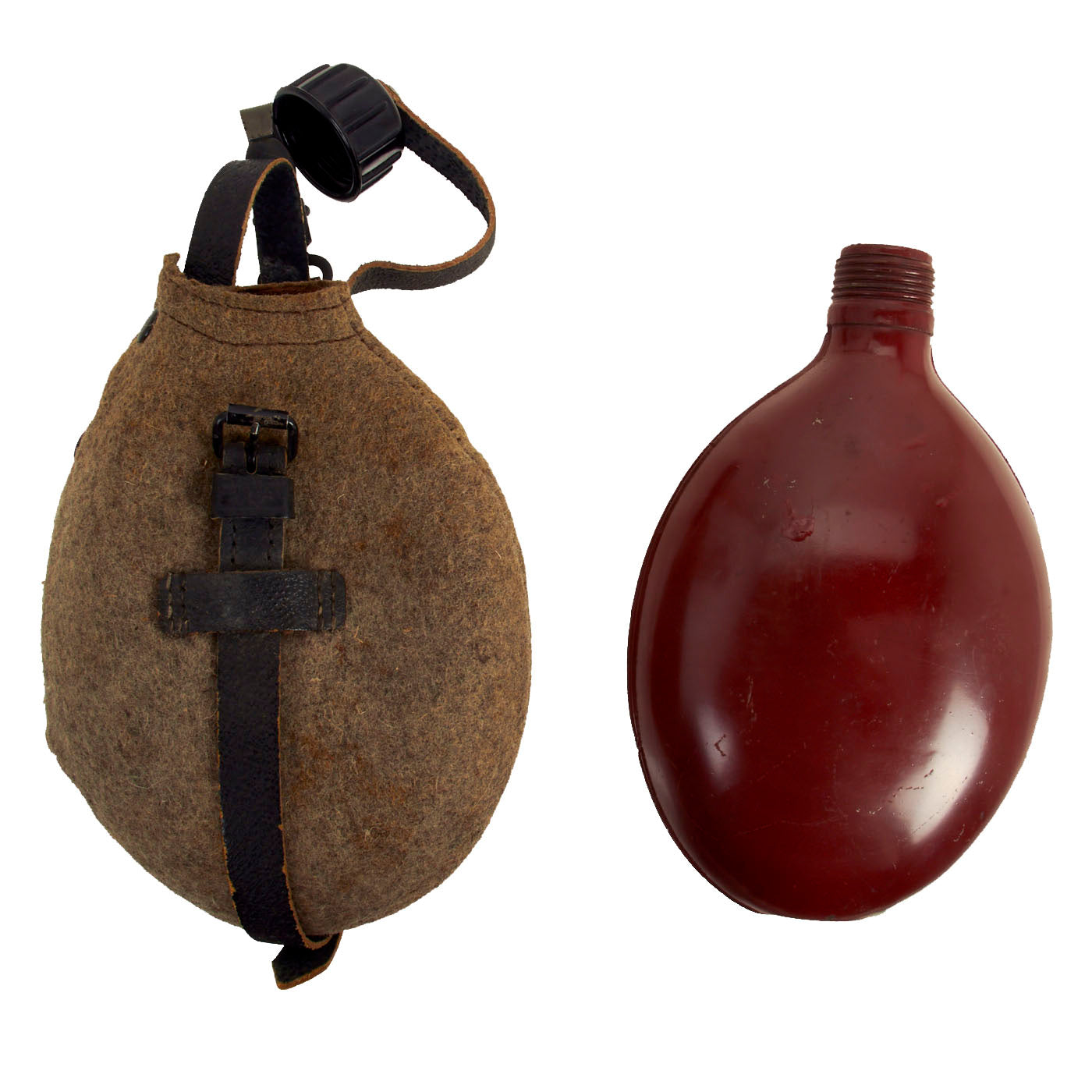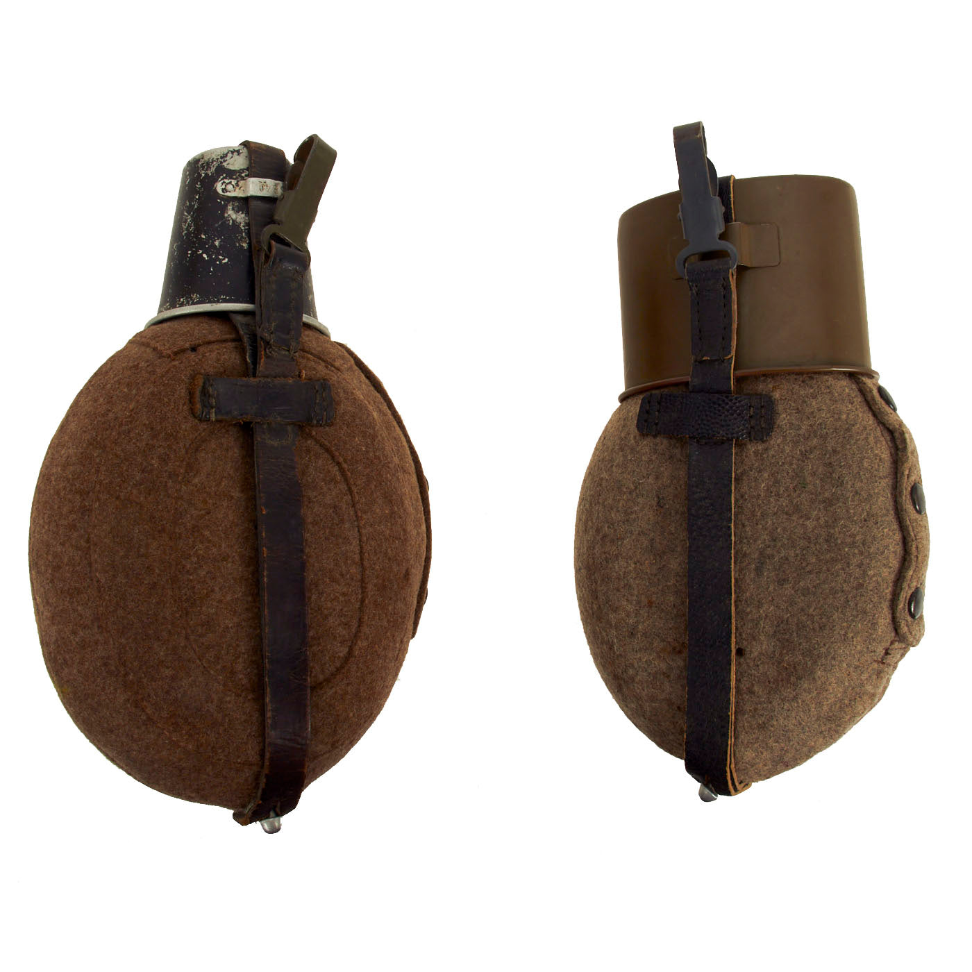 Original Item: Only One Set of Two Available. These are two very nice German WWII Issue M31 canteen water bottle rigs, with one representing the typical early war (circa 1940) configuration, and the other the late war (circa 1943) configuration. Material shortages during the war, particularly related to the supply of aluminum, led the M-31 to change over the war, first with the cup getting larger, and then being replaced with an enameled steel variant. The main canteen vessel itself was then replaced with enameled steel, and the two example we have here represent the end points in this change.