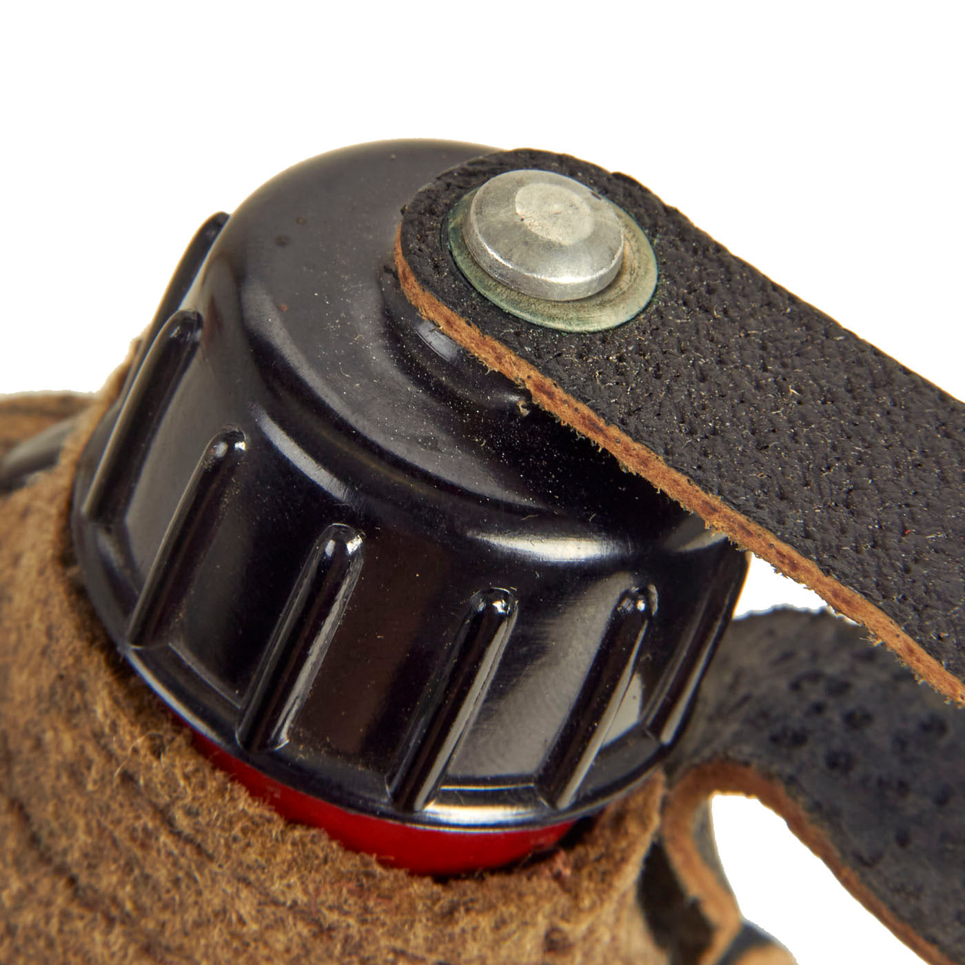 The later war example has the cover, harness, and cup marked C.F.L. 43, for 1943 production by Carl Feldhaus Aluminium-und Metallwerke of Lüdenscheid. It features an enameled steel body with a bakelite cap, and a large steel cup. The cap and canteen body have no markings, but we assume that they were also made by the same maker, as the condition is pretty much UNISSUED. There is very little service wear of any kind, with great enamel on the metal components, and solid leather.