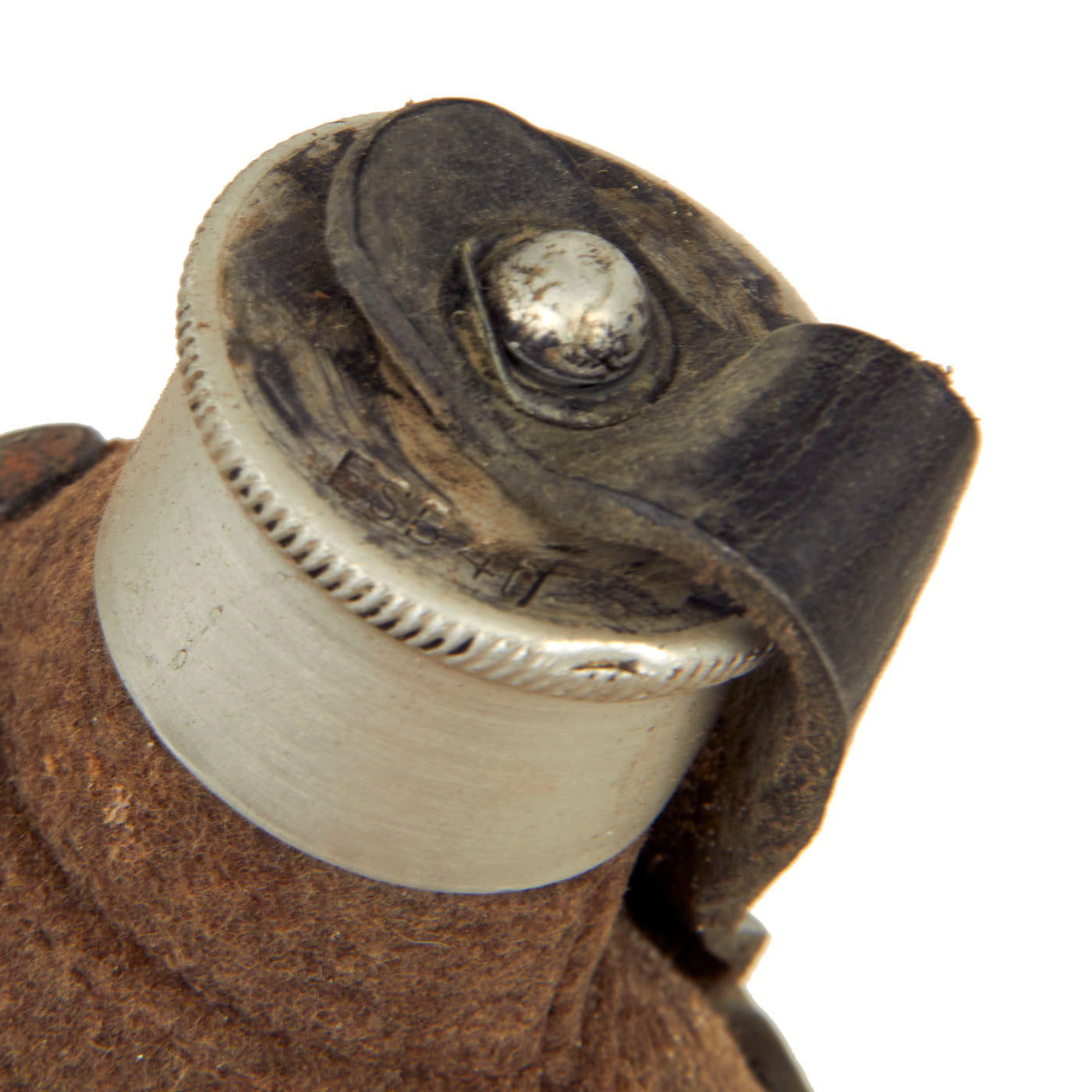 The early war example has most components marked ESB 40, indicating 1940 production by Eduard Sommerfeld of Berlin. During the war the makers of canteens and mess kits did not use the three letter code system, instead using an abbreviation. It has an aluminum bottle, screw cap, and small cup, all of which show some great period wear. The washer inside the cap is still intact, and all of the snaps on the cover are present, though some are rusted. The leather harness does show wear, but the buckle and snap are still functional, with no tears through the leather.