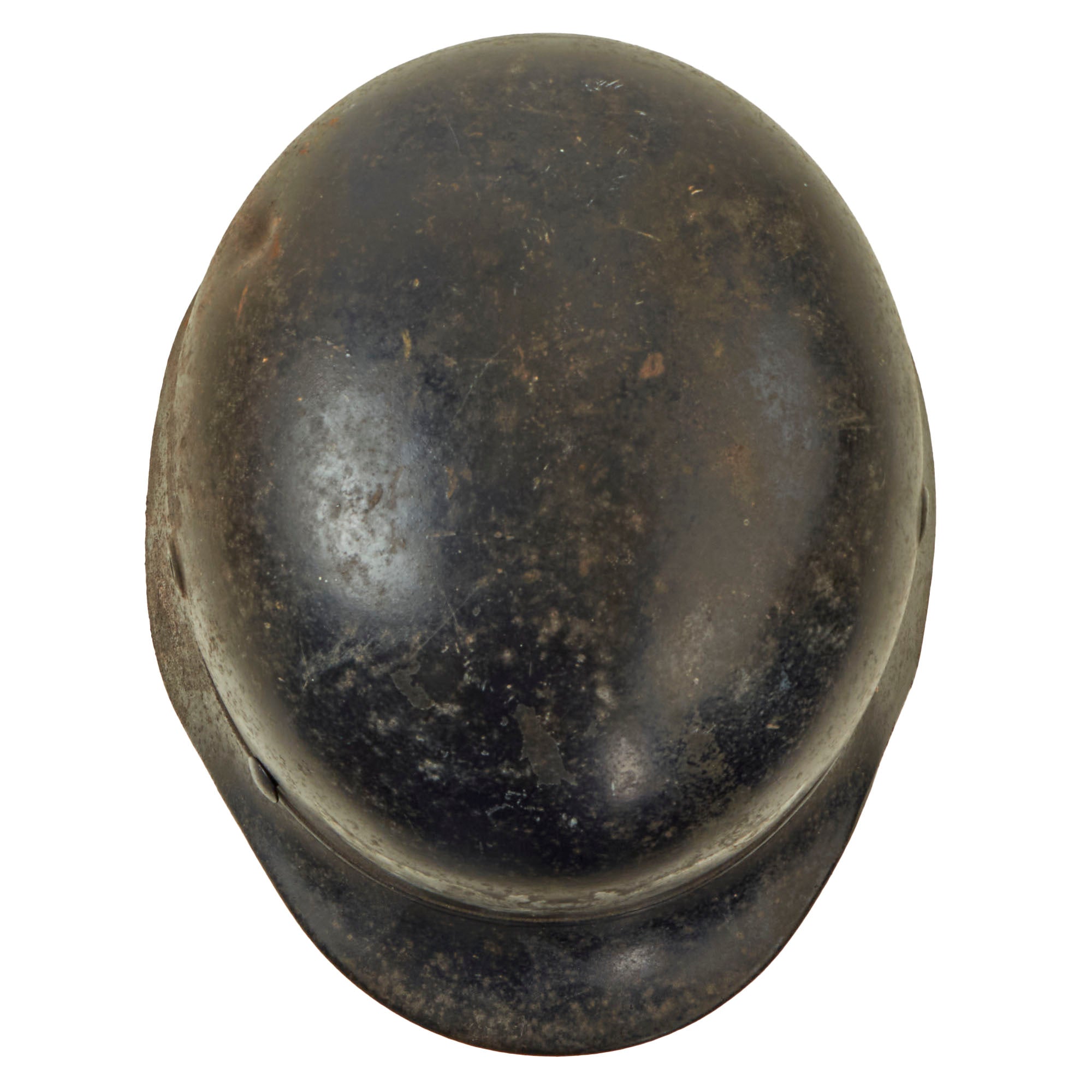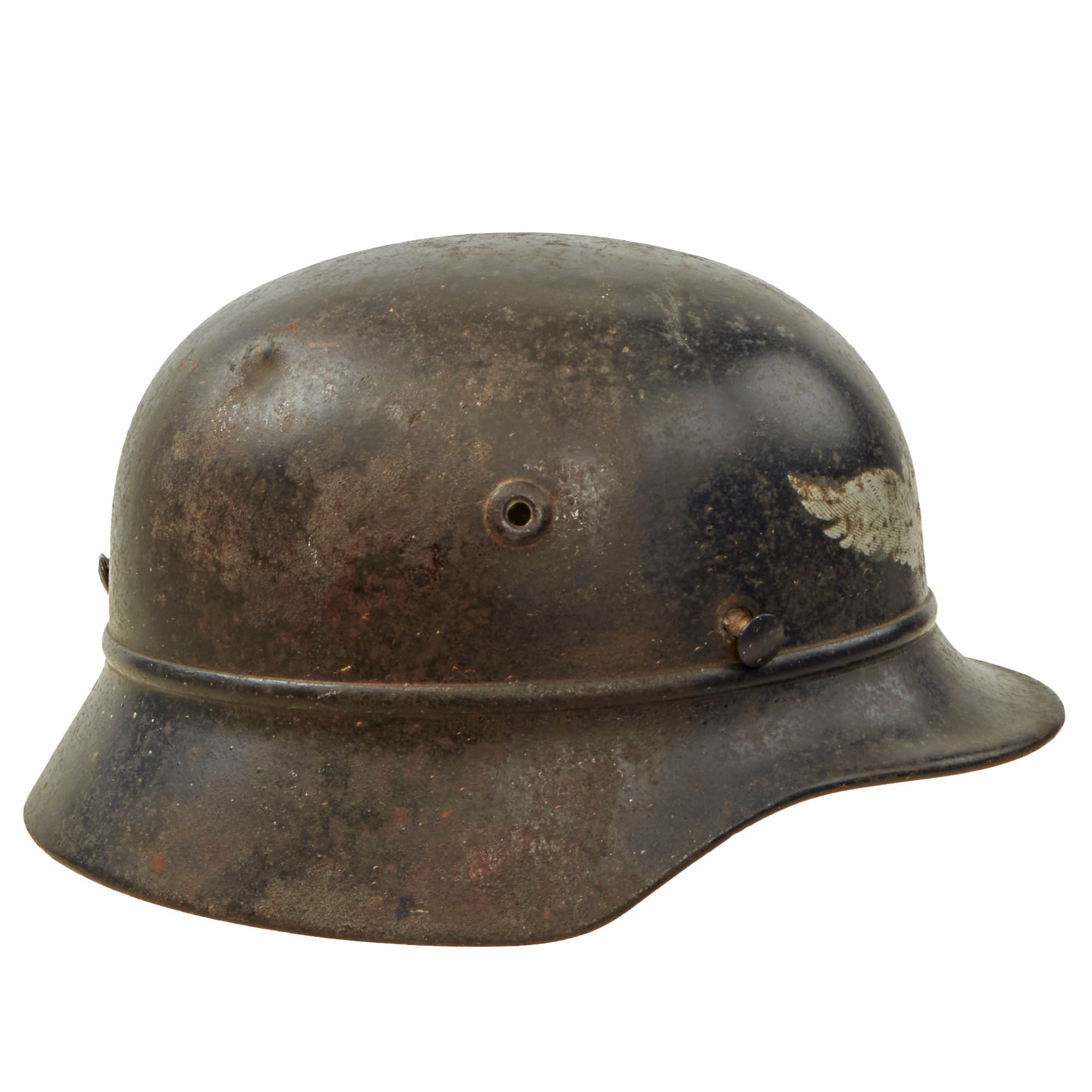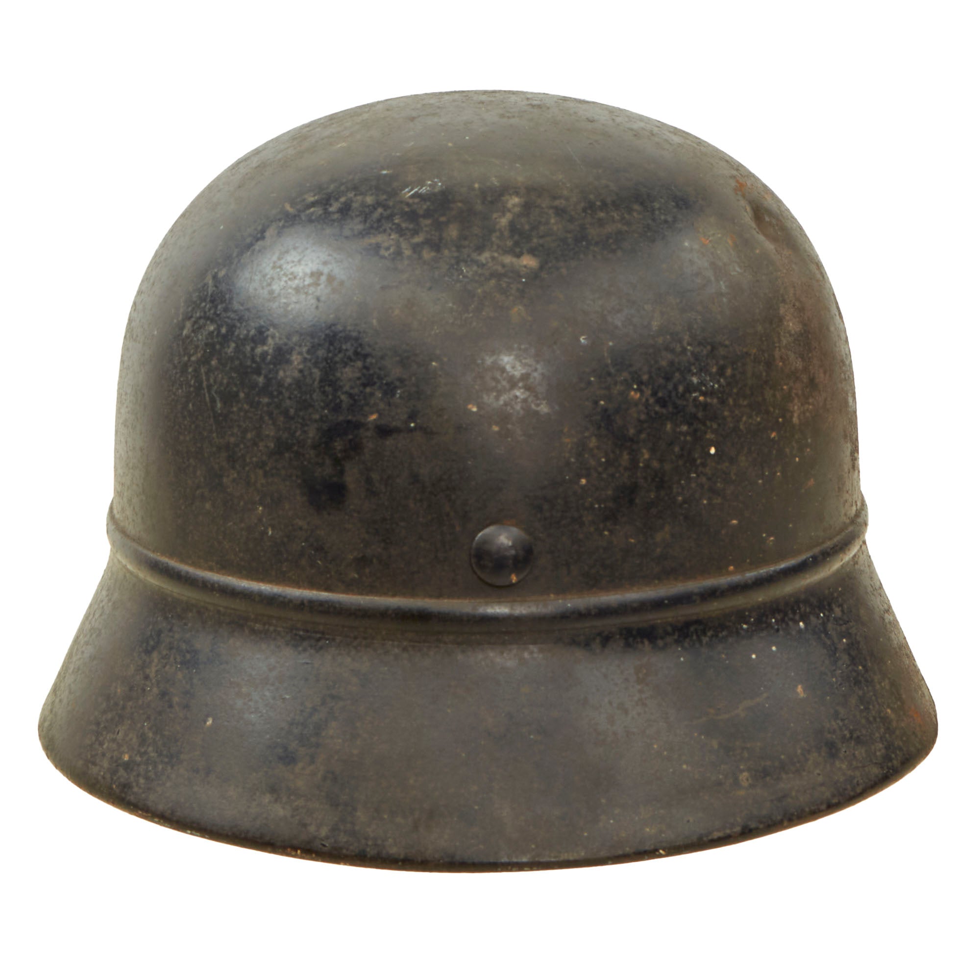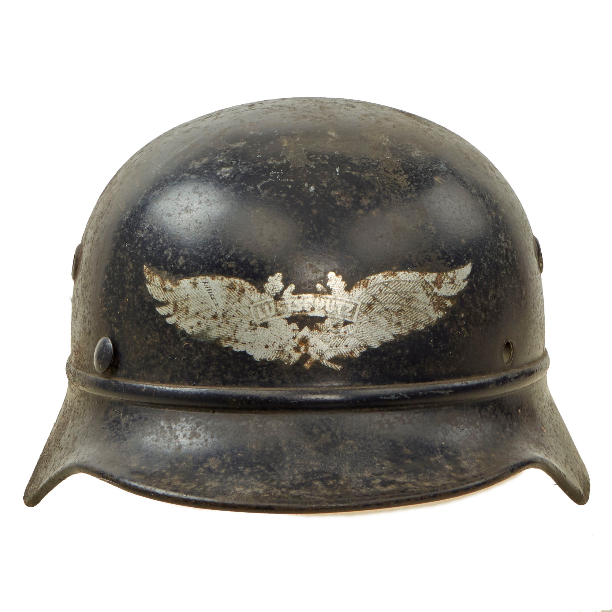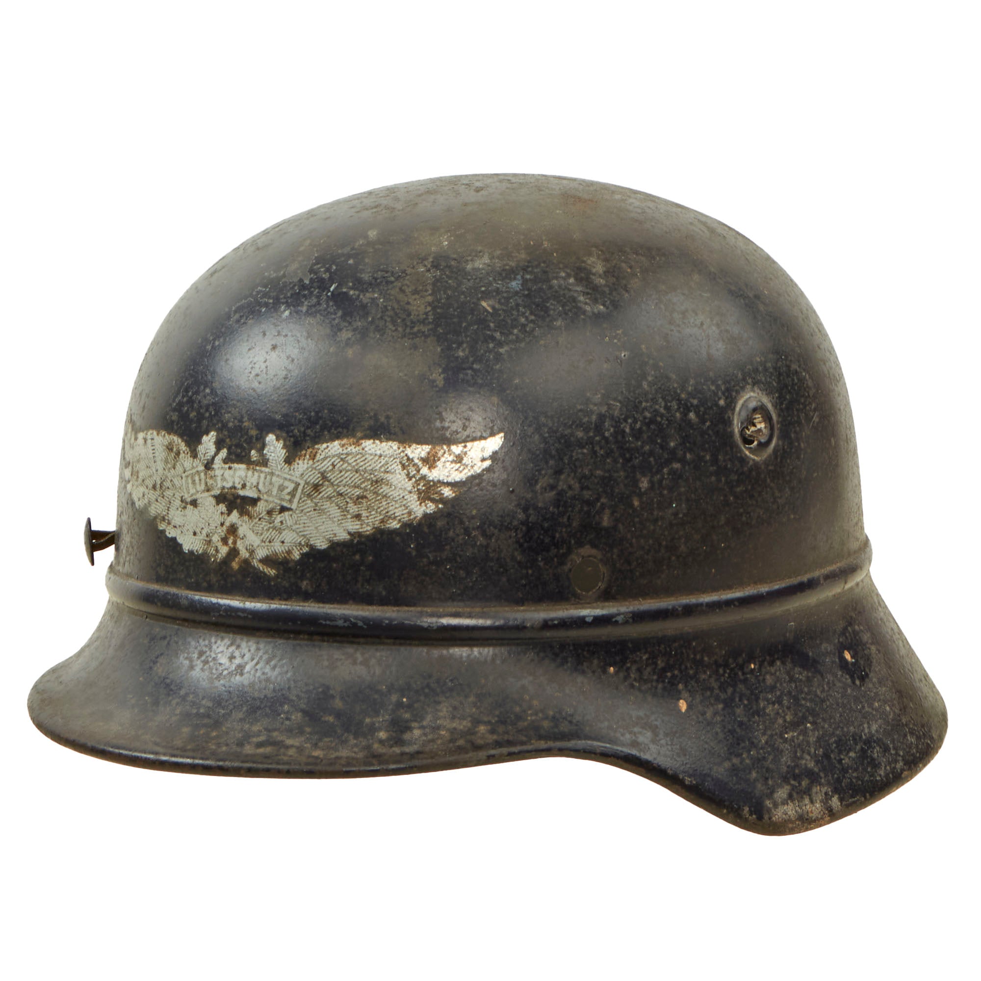 Original Item: Only One Available. This is an very good condition example of a hard to find genuine steel construction M40 "Beaded" Third Reich helmet shell, outfitted for German WWII Luftschutz Civil Air Defense use. These helmets were essentially like the Military issue, however the steel was not as thick or as high quality. They were given a "bead" around the edge, to avoid mixing them up with the military version. This example has lost the liner and chinstrap, though it still retains two of the three split pins.