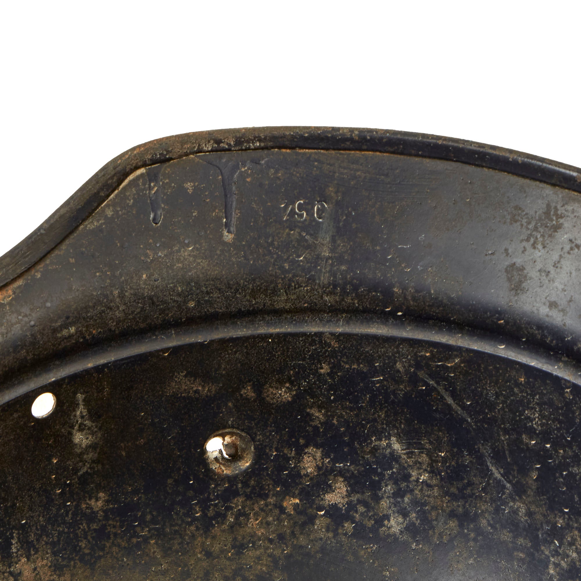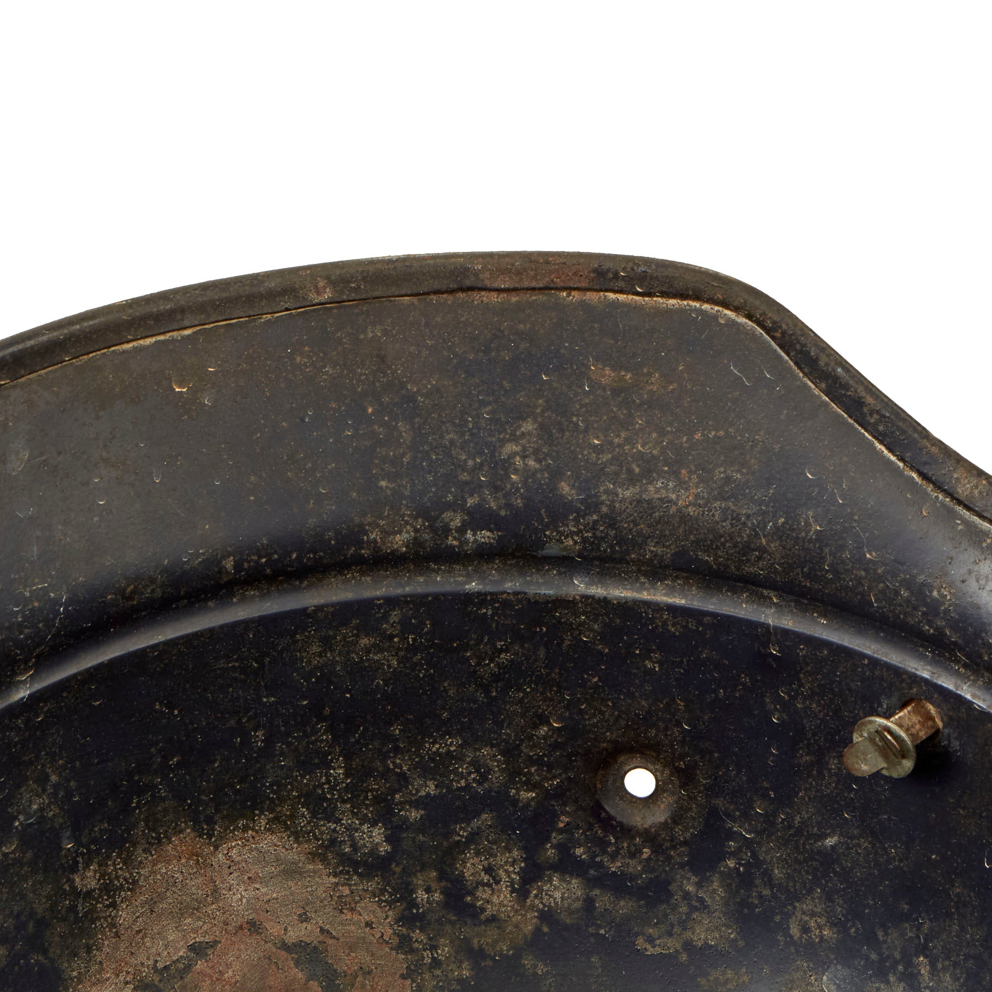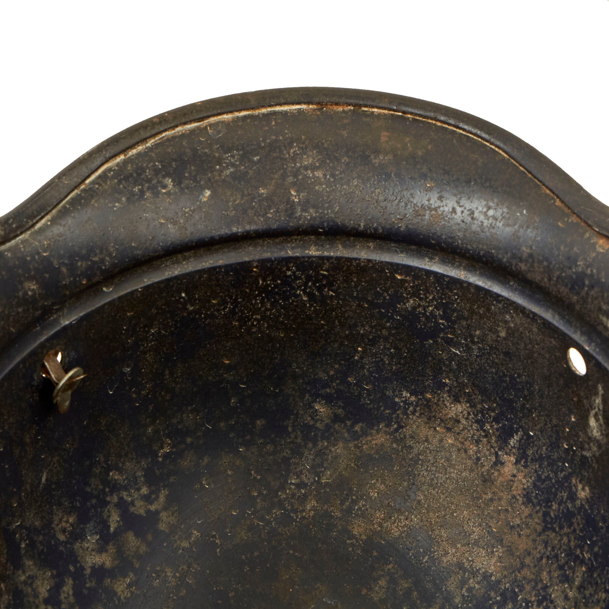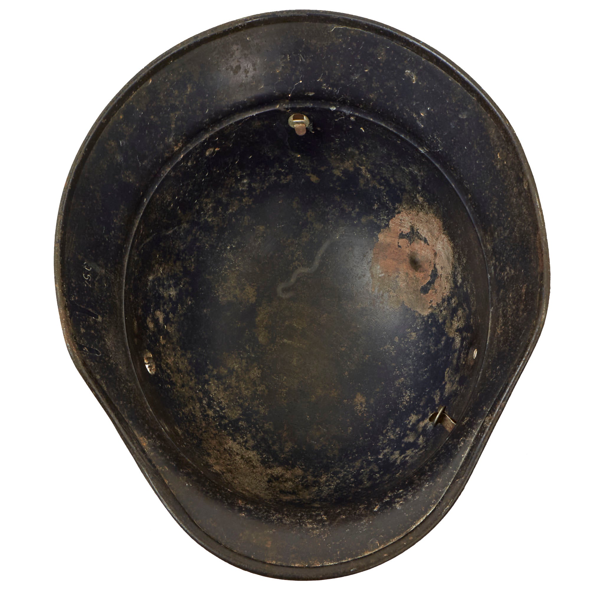 The exterior of this German helmet retains about 60% of the original dark blue paint, with overall wear, particularly on the right side. There is also a significant dent on that side, probably from something falling on the helmet while in service.. The LUFTSCHUTZ decal is still present, but shows overall wear to the top coat, which has made the design faint, while the silver under layer is still well retained. The shell overall looks to have seen a good amount of use, and has a lovely "service worn" look. Of interest is that when the helmet was made, the left vent hole was not drilled out correctly, so the hole is off to one side, and there are still remnants of the central stamp out.