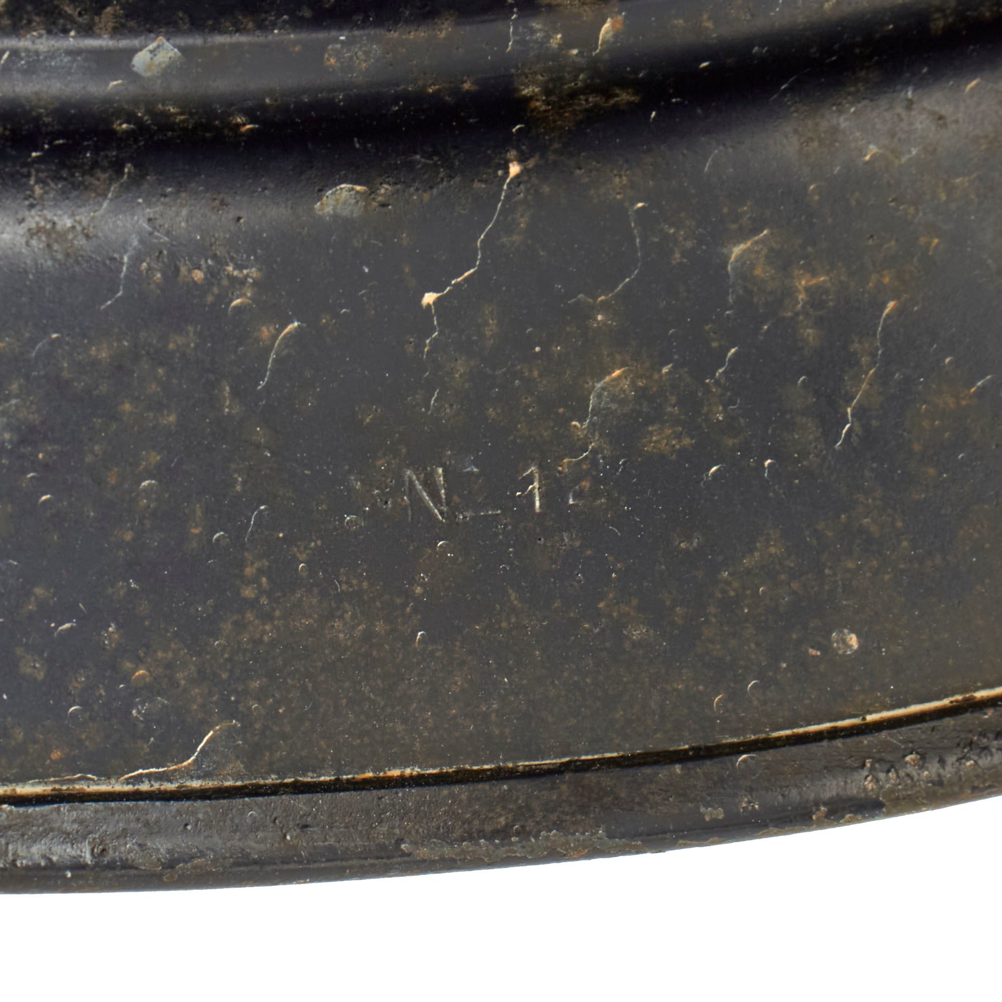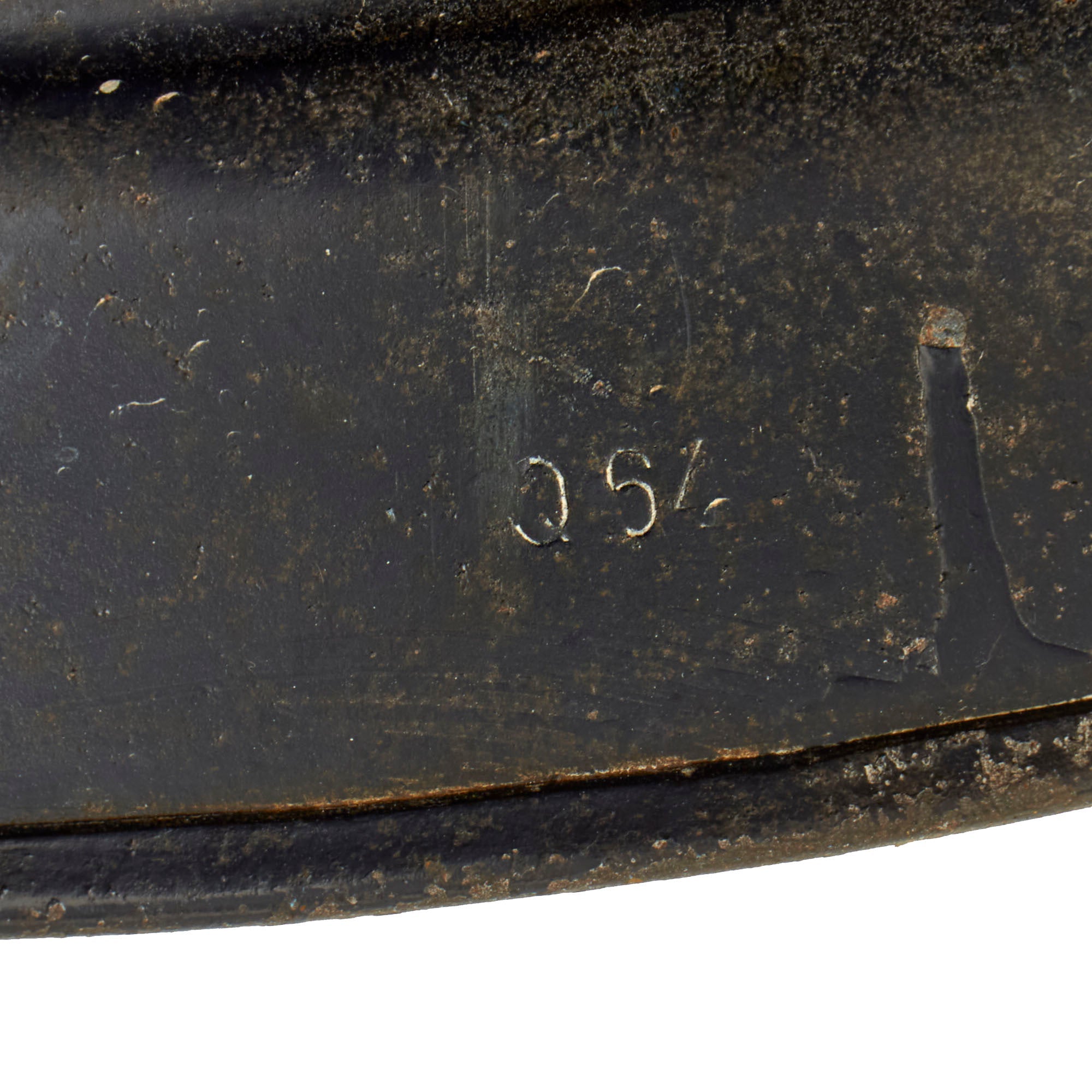 The reverse, interior, neck guard apron is serial number stamped DN212 and the interior, left side, apron has the stamped manufacturer's code and size, Q64 indicating that it was manufactured by F.W. Quist G.m.b.H. in the German city of Esslingen. Size 64 is a nice smaller size that can accommodate liners from 56cm to 57cm or US 7 to 7 1/8. Size 64 shells are harder to find and are therefore more valuable to a collector.