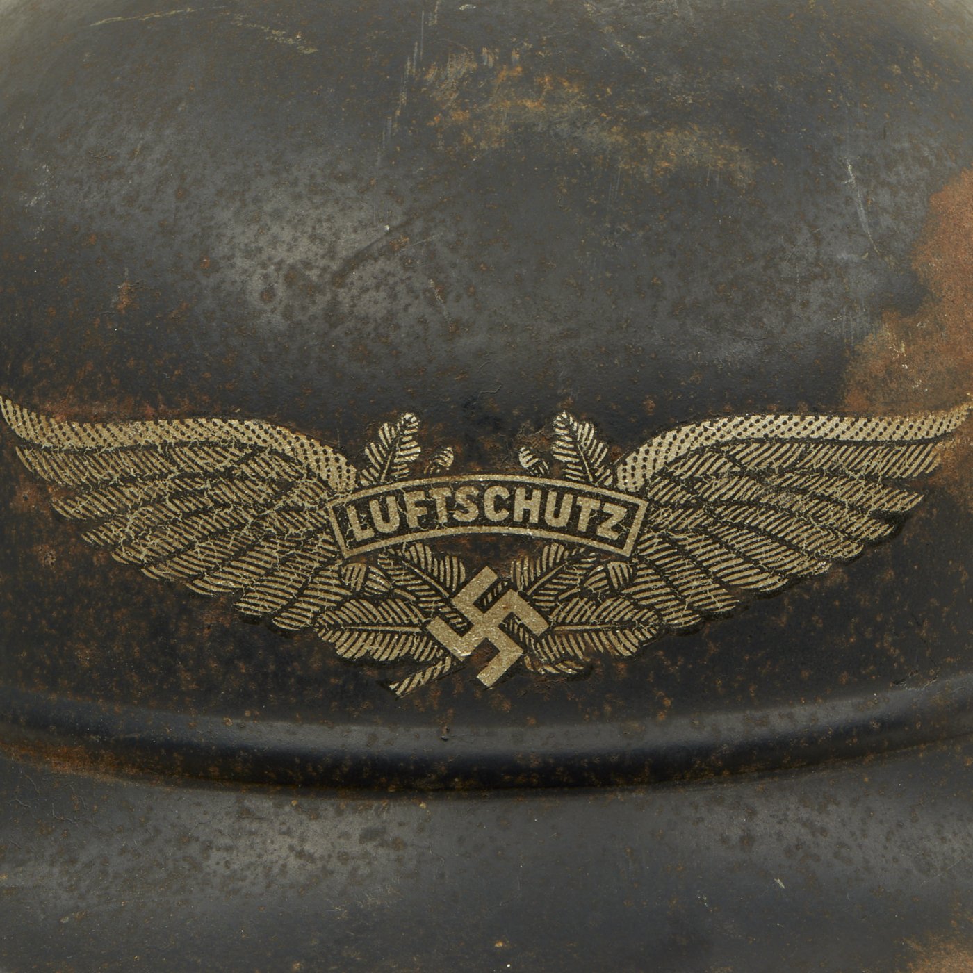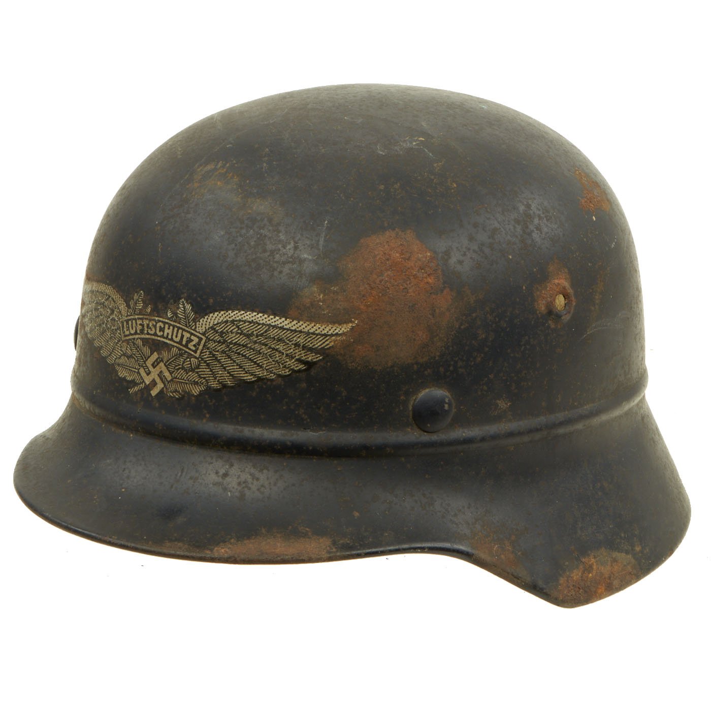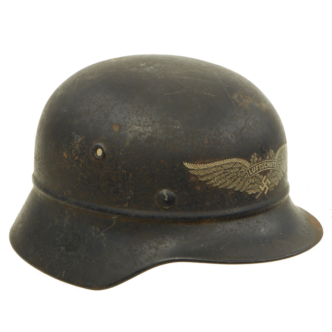 Original Item: Only One Available. This is a very nice and somewhat rare genuine steel construction M40 "Beaded" Third Reich helmet, outfitted for German WWII Luftschutz Civil Air Defense use. These helmets were essentially like the Military issue, however the steel was not as thick or as high quality. They were given a "bead" around the edge, to avoid mixing them up with the military version.