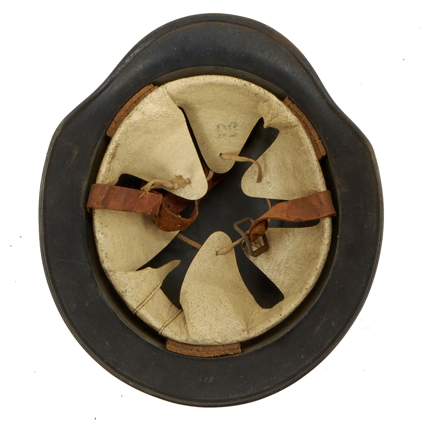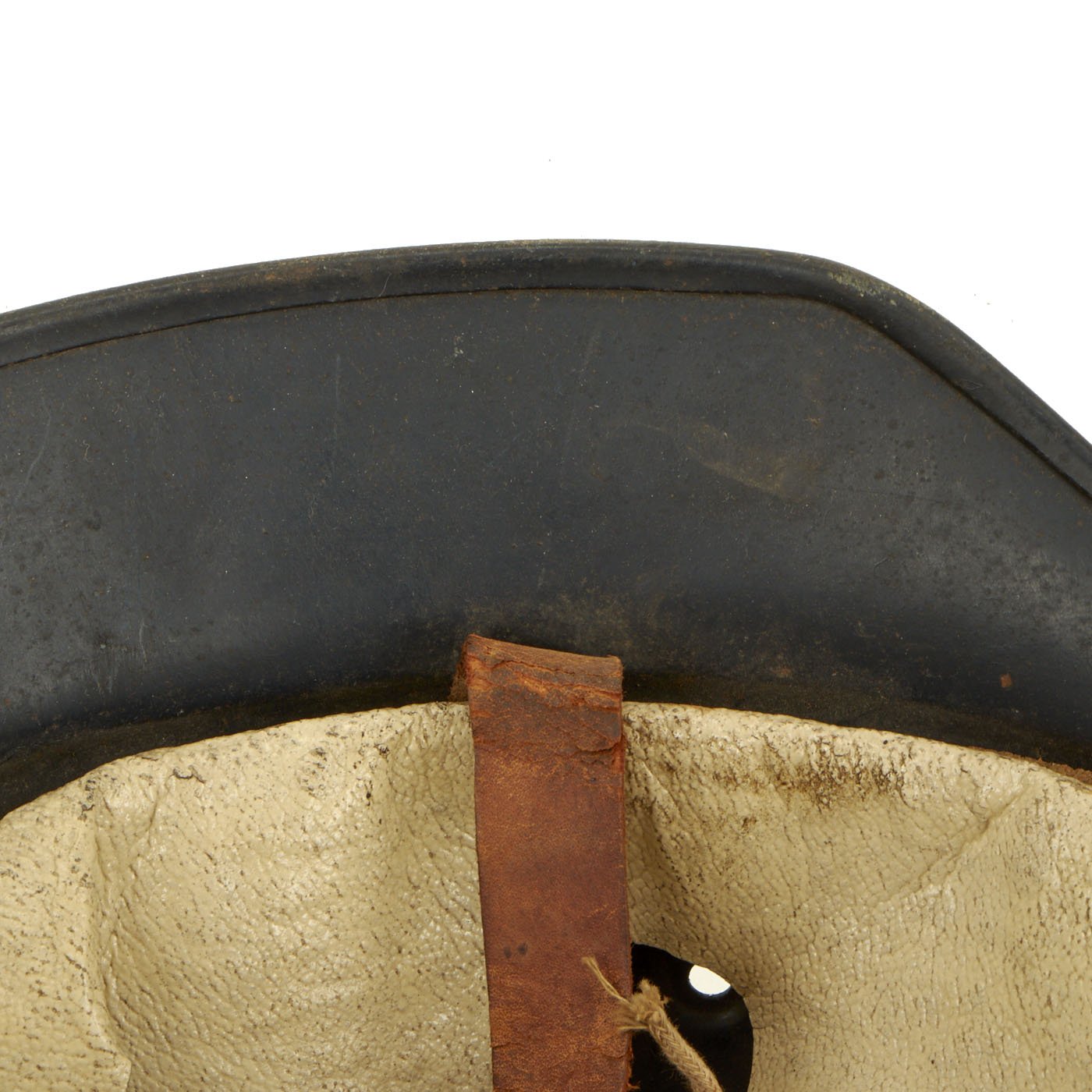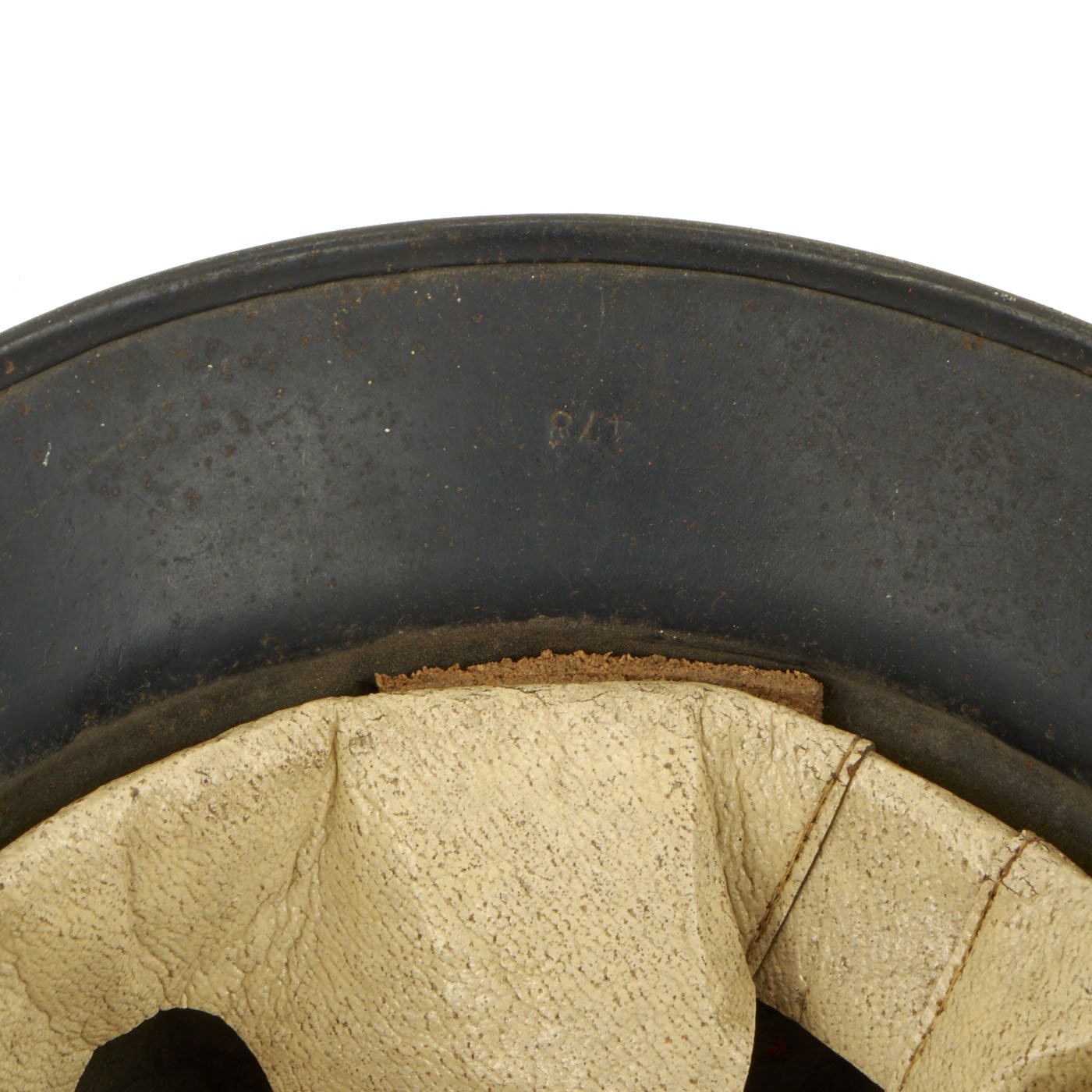 The exterior of this German helmet retains about 80% of the original dark blue paint, with light overall wear, and some areas of paint loss and oxidation on the left side. The Luftschutz decal is clean and about 95% complete, with only a few small scuffs, though it has checking and splitting overall. This gives it a great aged look.