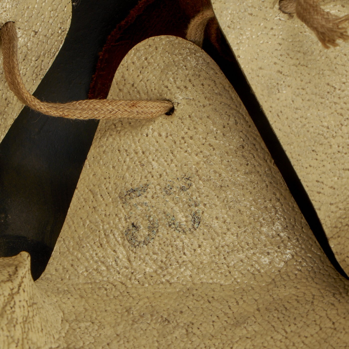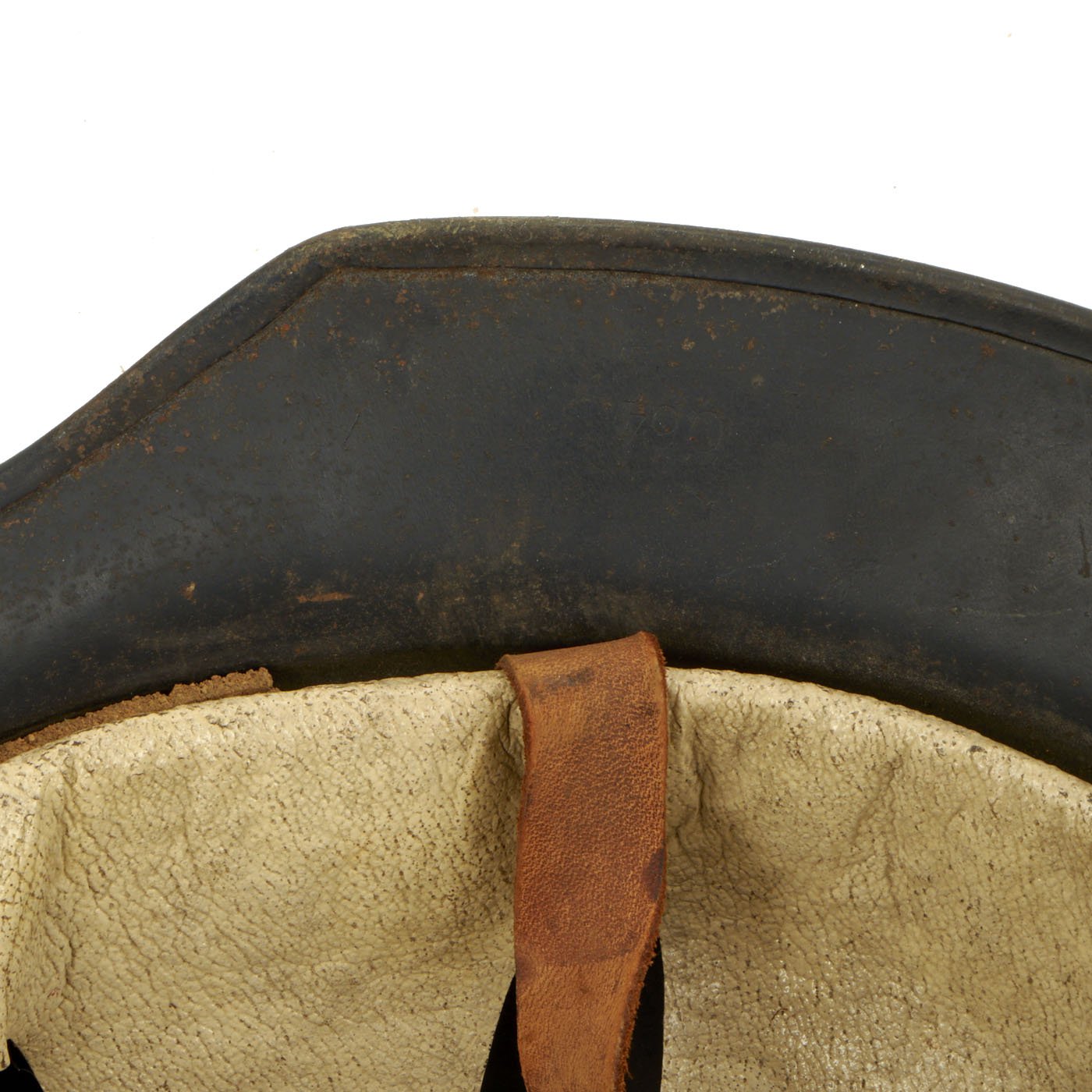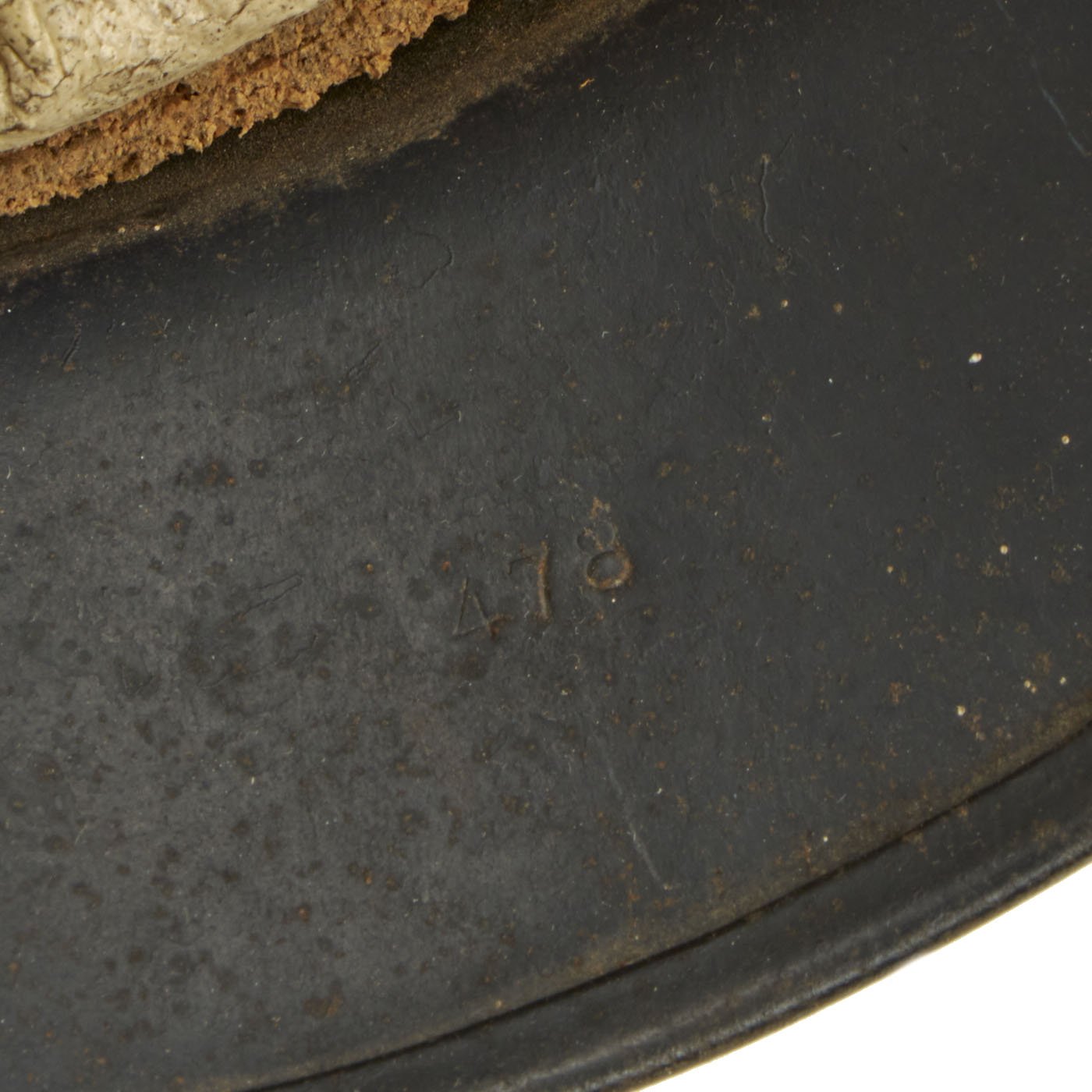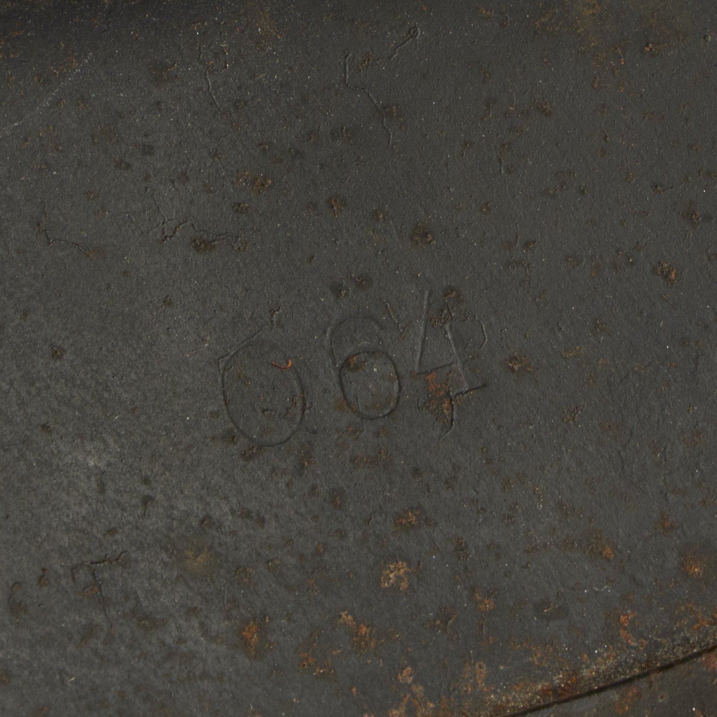 The reverse, interior, neck guard apron is serial number stamped 478 and the interior, left side, apron has the stamped manufacturer's code and size, Q64 indicating that it was manufactured by Quist in the German city of Esslingen. Size 64 is a nice smaller size that can accommodate liners from 56cm to 57cm or US 7 to 7 1/8. Size 64 shells are harder to find and are therefore more valuable to a collector.