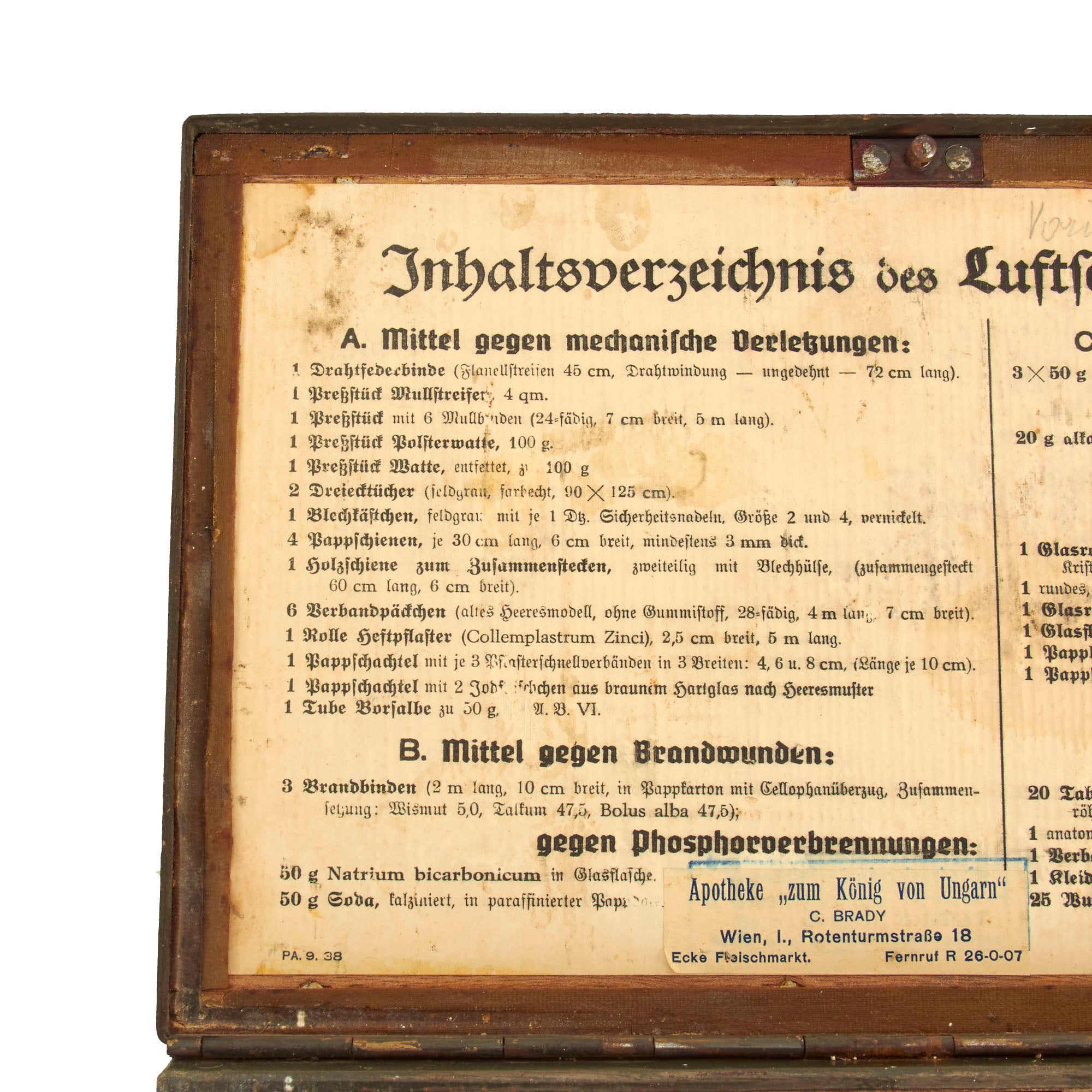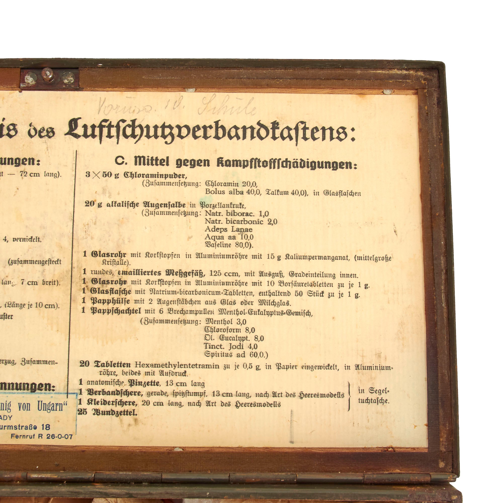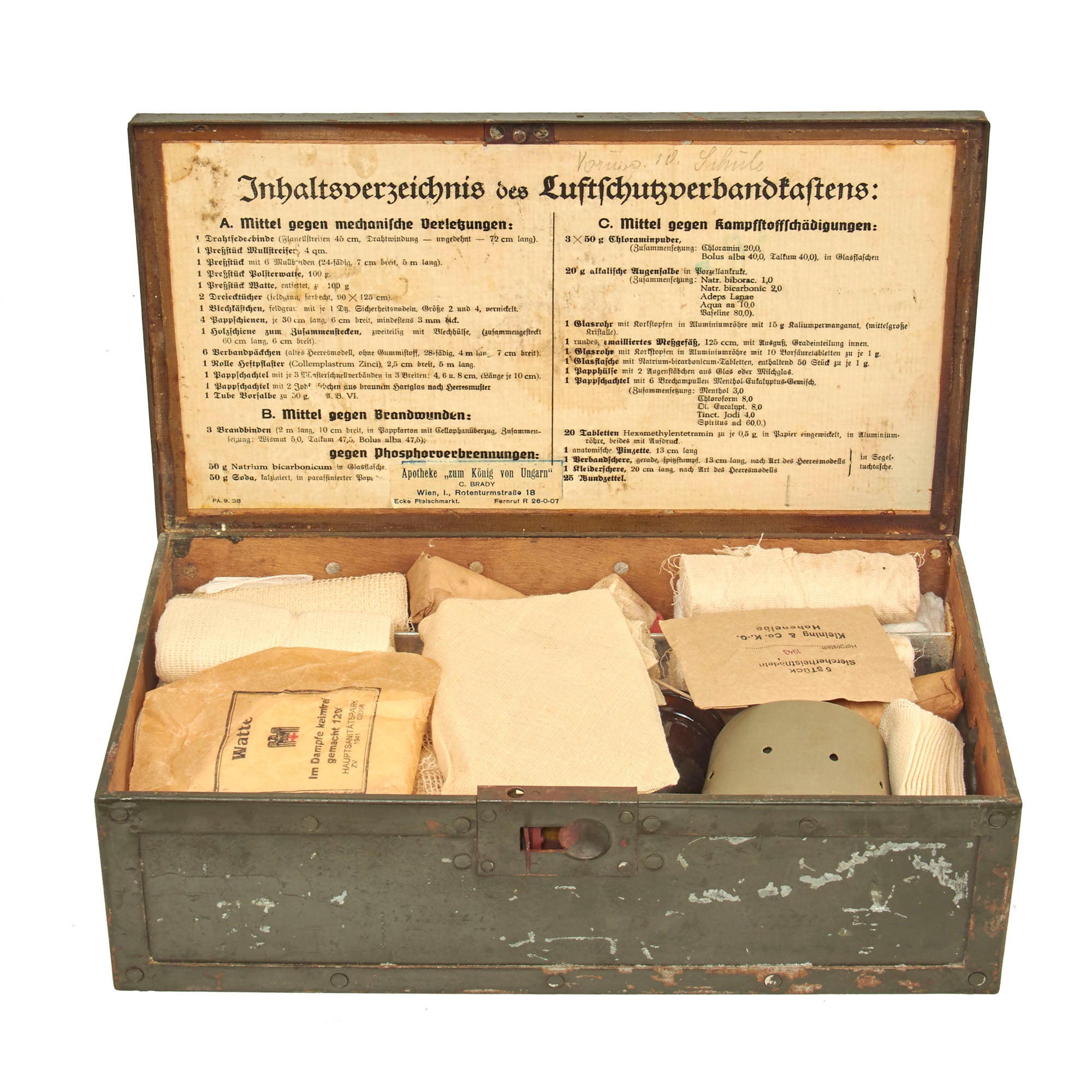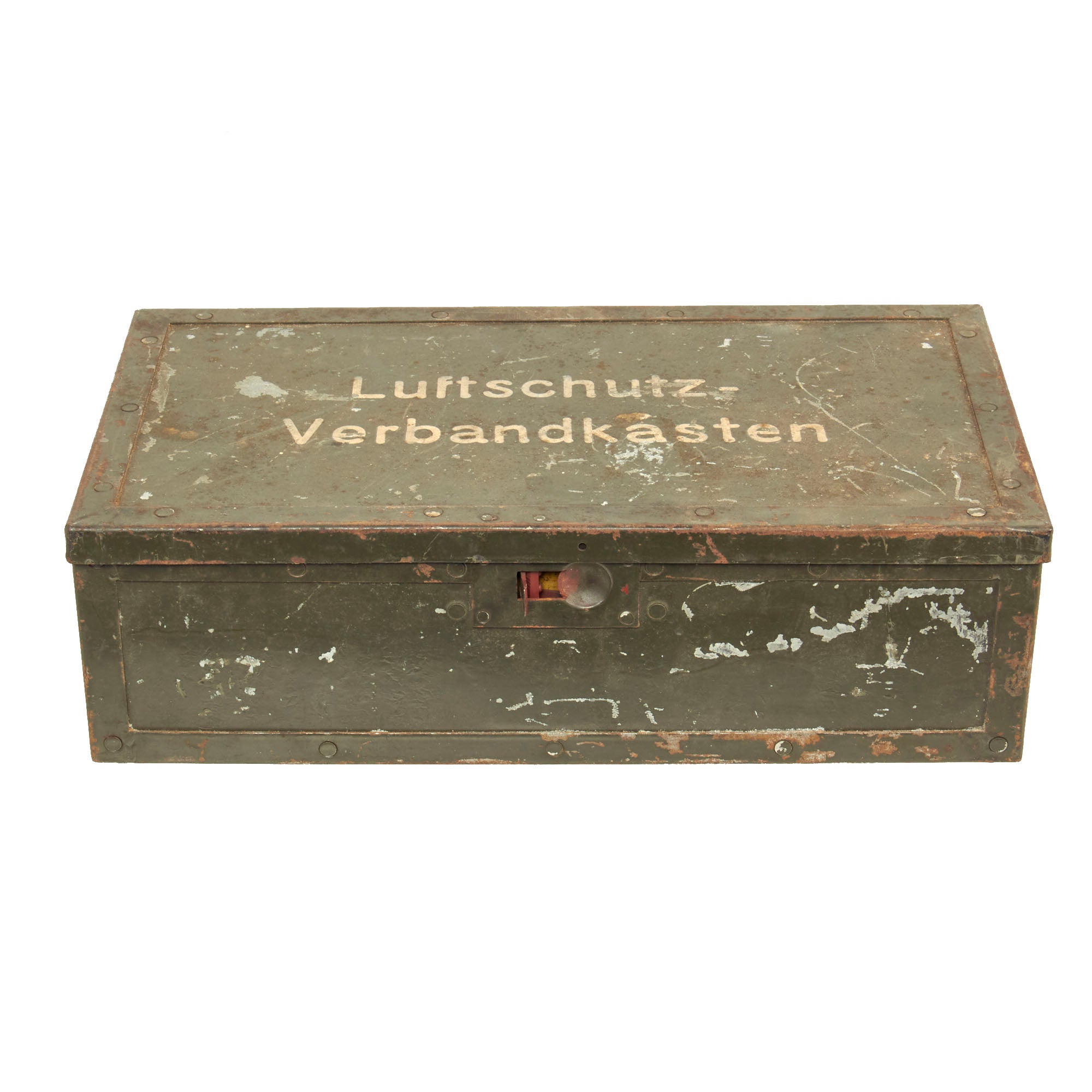 They are contained in a classic very good condition German WWII issue first aid Luftschutz Verbandkasten (Air Raid First Aid Kit) steel case, which measures 14" x 7 1/2" x 4. The case features a carry handle on one end, and is finished in a field gray color used by the field troops. The case does show some age and use, however it still has the internal contents label, correctly marked Inhaltsverzeichnis des Luftschutzverbandkastens (Contents List of the Air Raid First Aid Kit).