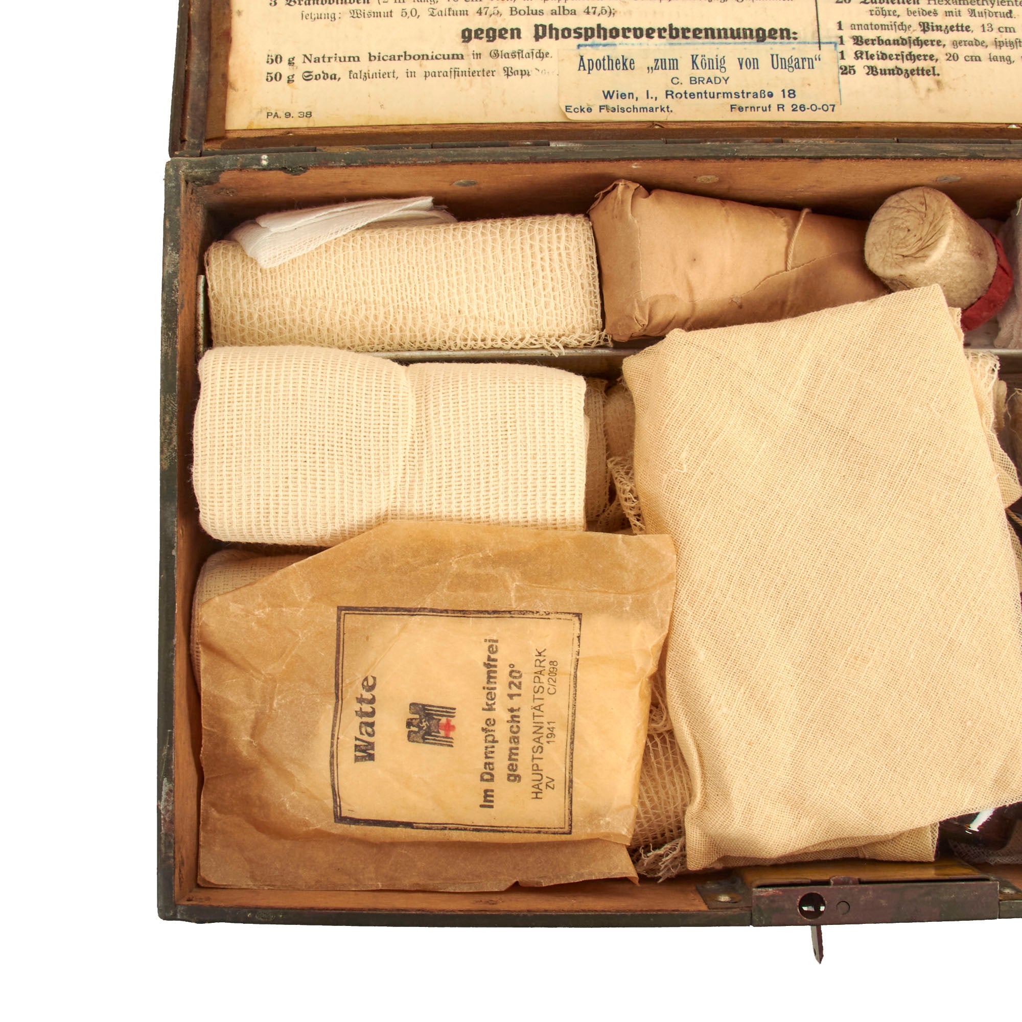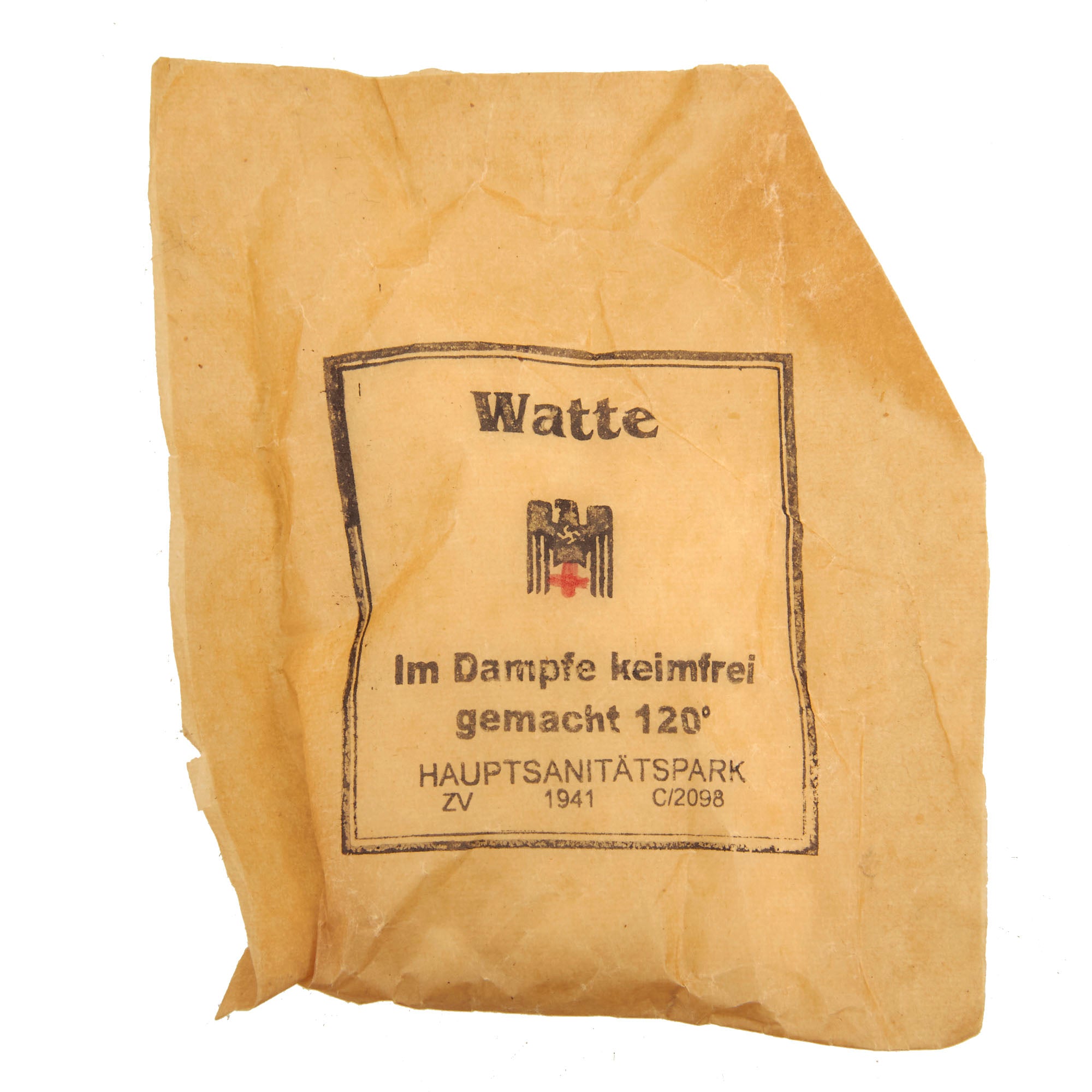 Original Item: Only One Available. This fantastic full set of first aid bandage supplies, some of which are still in the original wrappers with WWII dates, as well as some with German Red Cross (DRK) markings. There are also some empty small glass bottles, and other supplies.