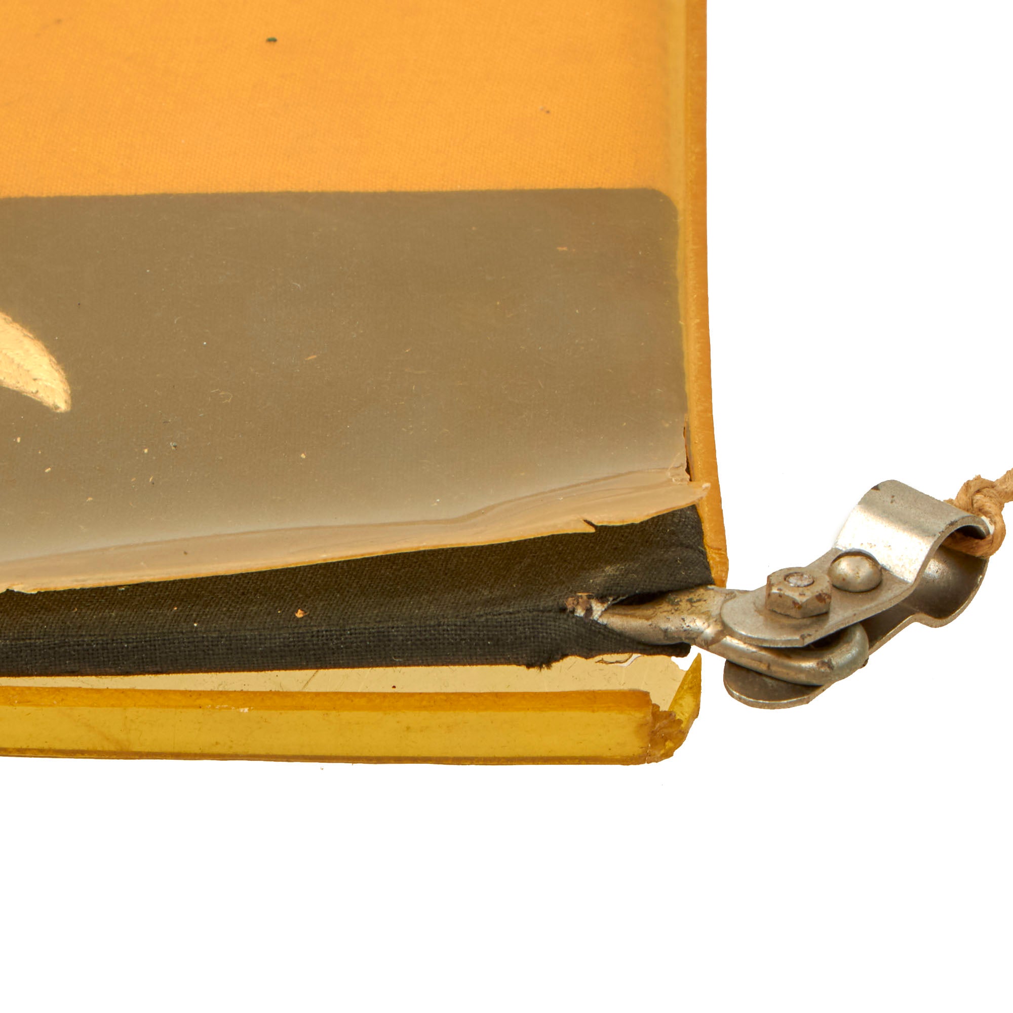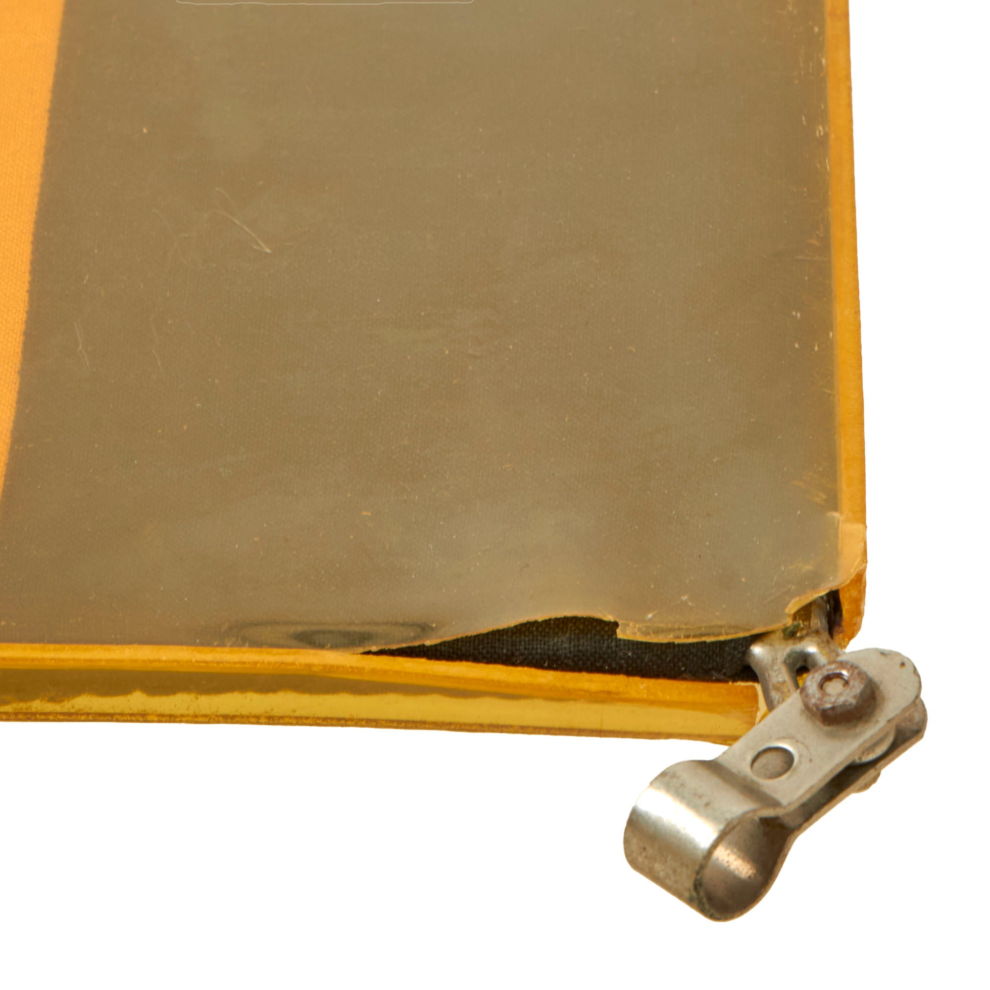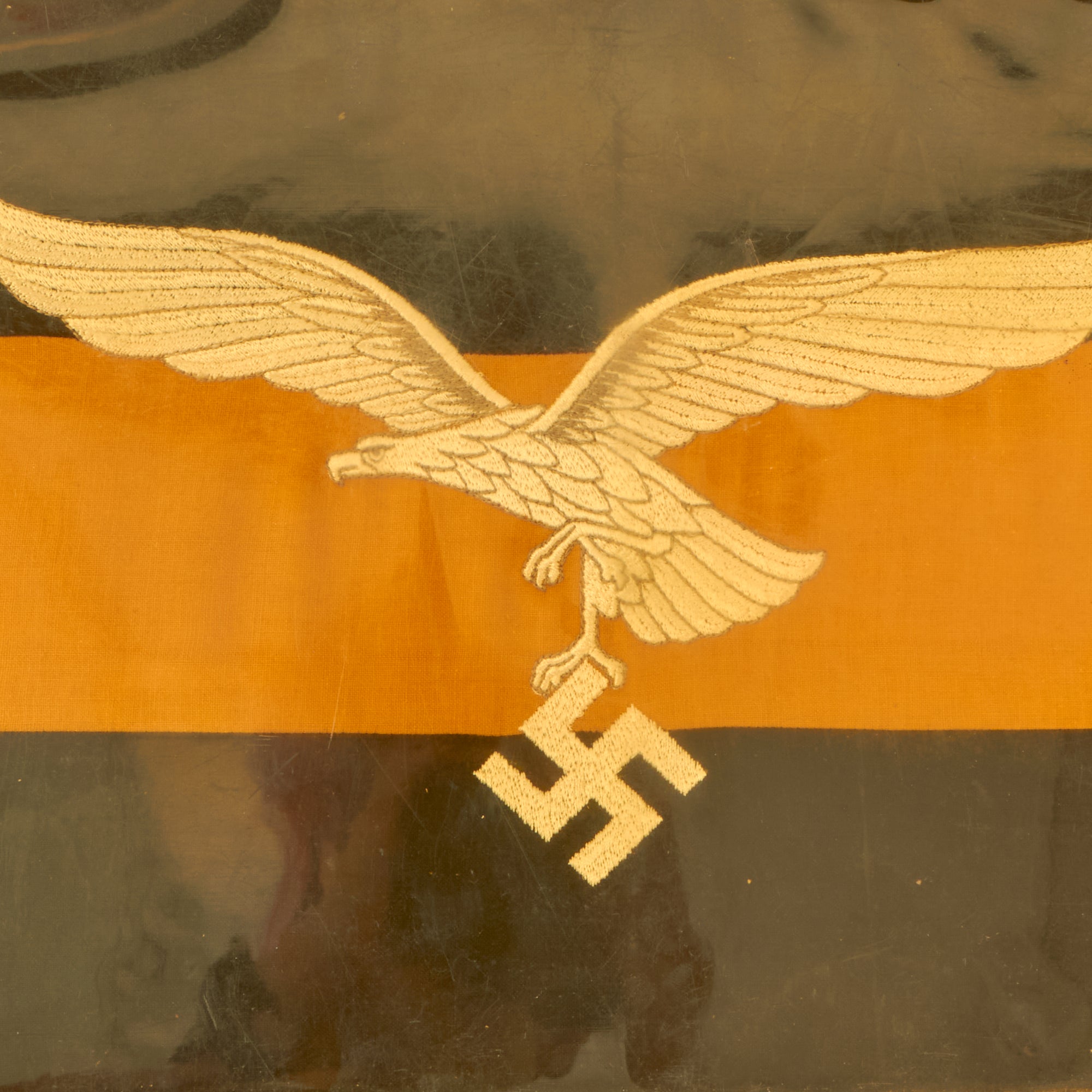 The flag measures 9 ½" x 16" and is double sided, showing a black field with a wide goldgelb (Gold-Yellow) stripe in the middle, the Waffenfarbe (corps color) for the flight branch. This included Aviator troops such as pilots and ground personnel as well as Fallschirmjäger (parachute troops). It is of multi-piece construction, and there is a heavily embroidered Luftwaffe eagle sewn onto each side as well, which are of the early-war style. It is encased in a thick celluloid covering, which has yellowed over the years, and protected the fabric from dirt and light.