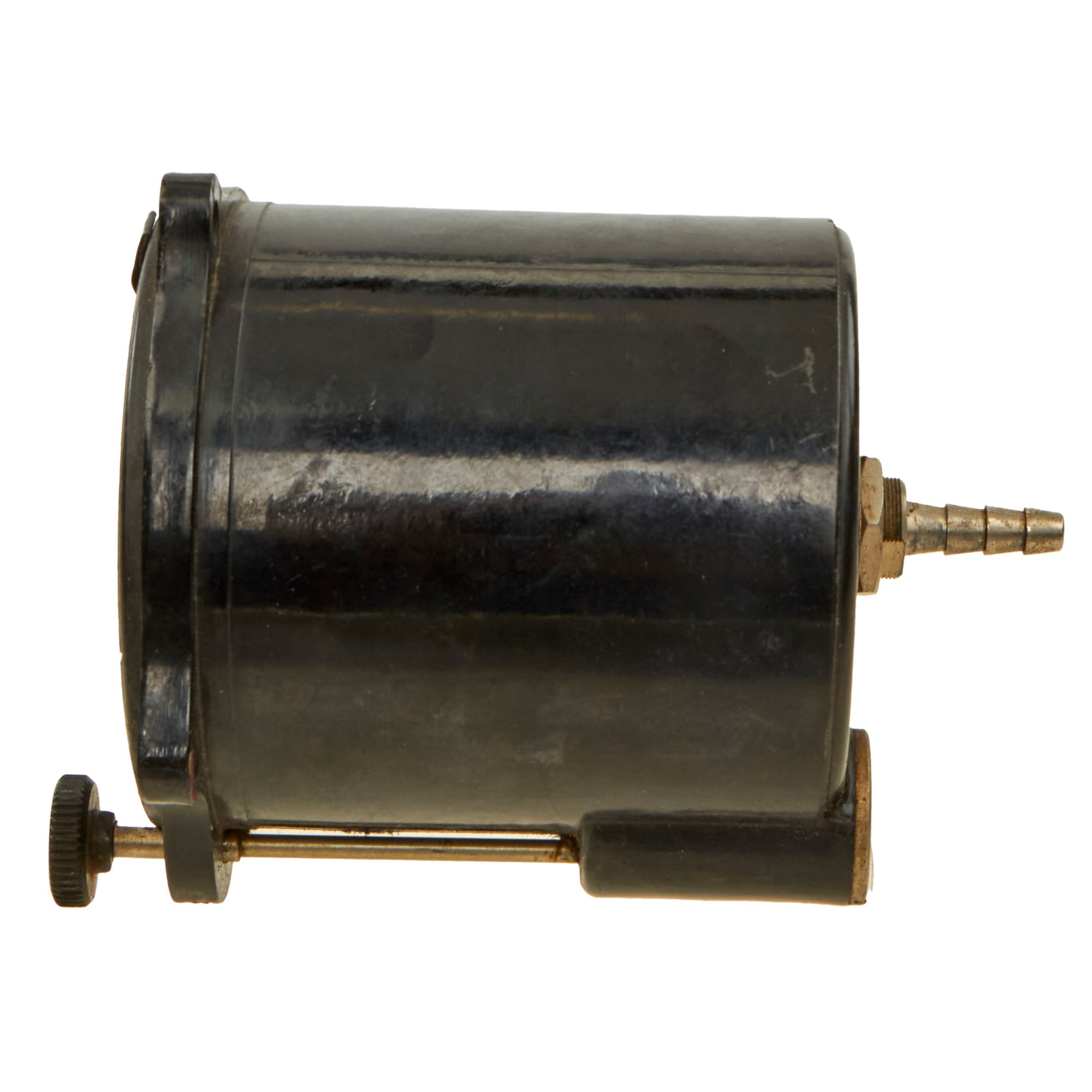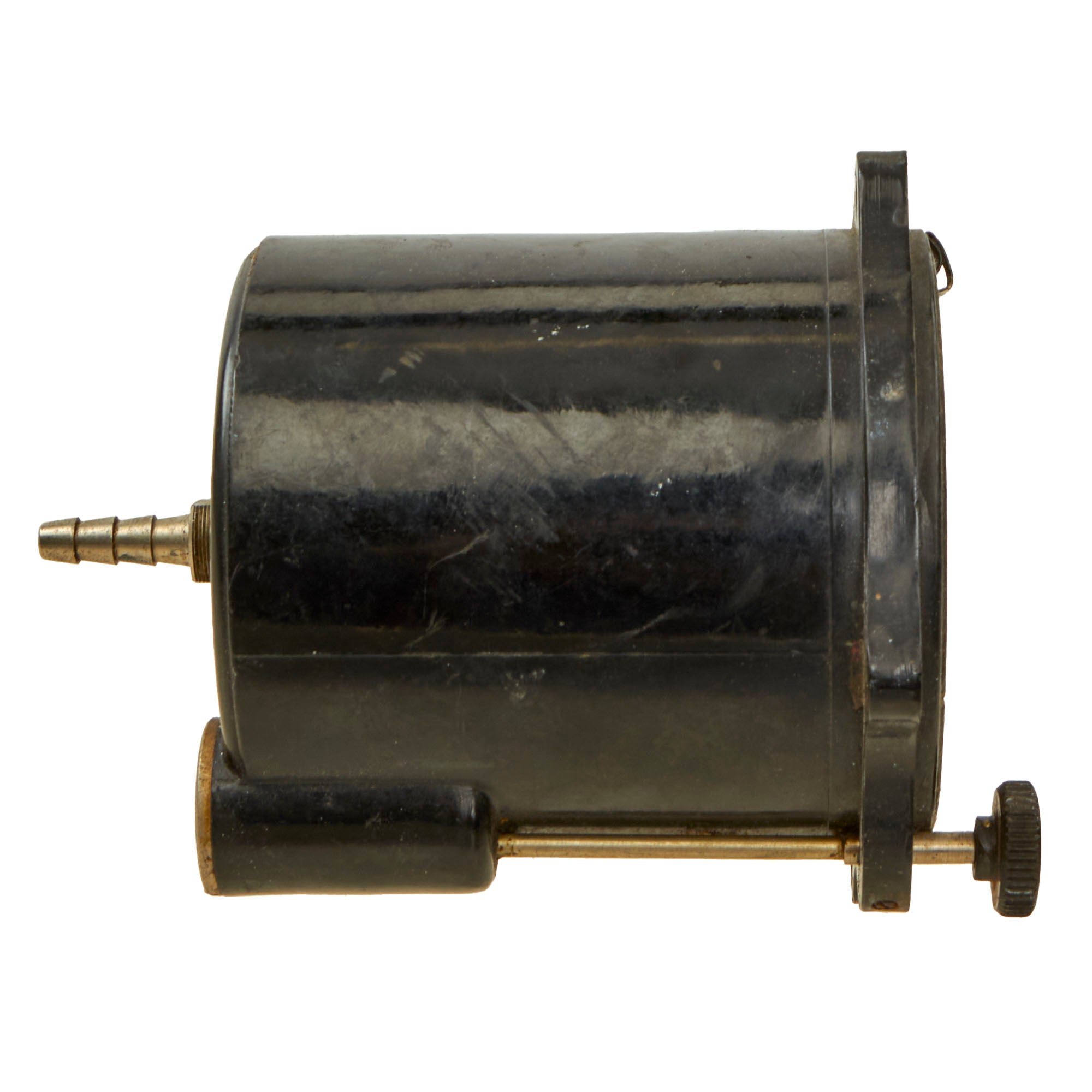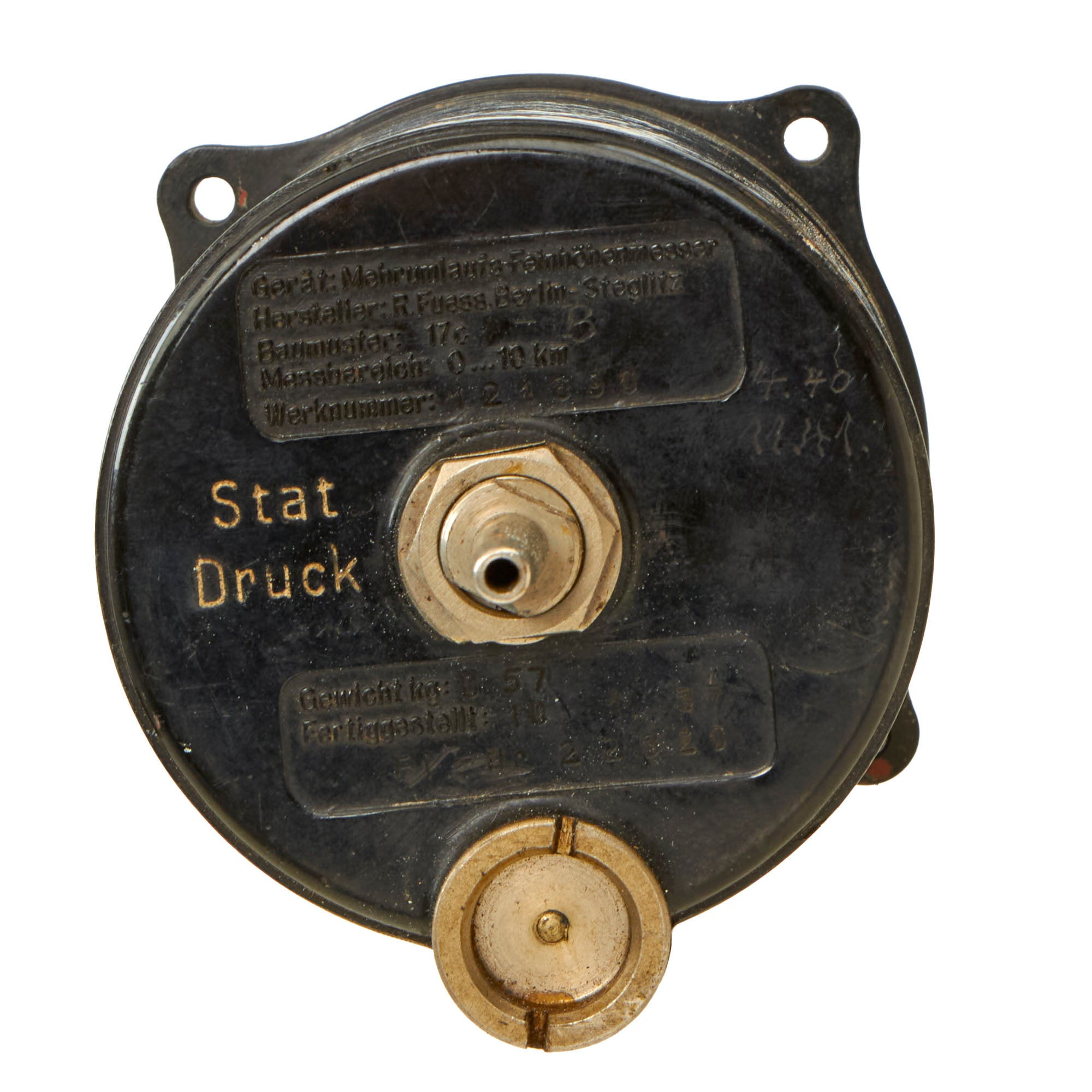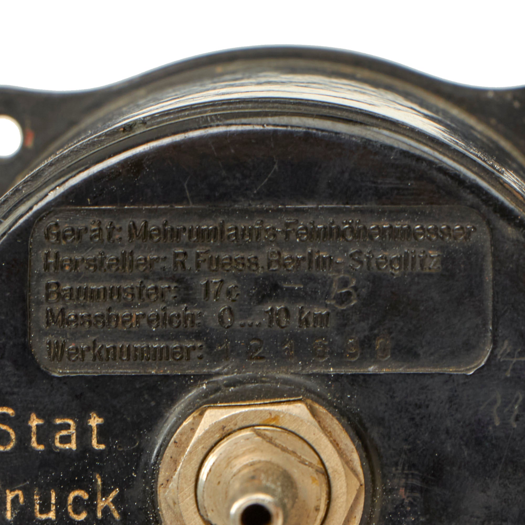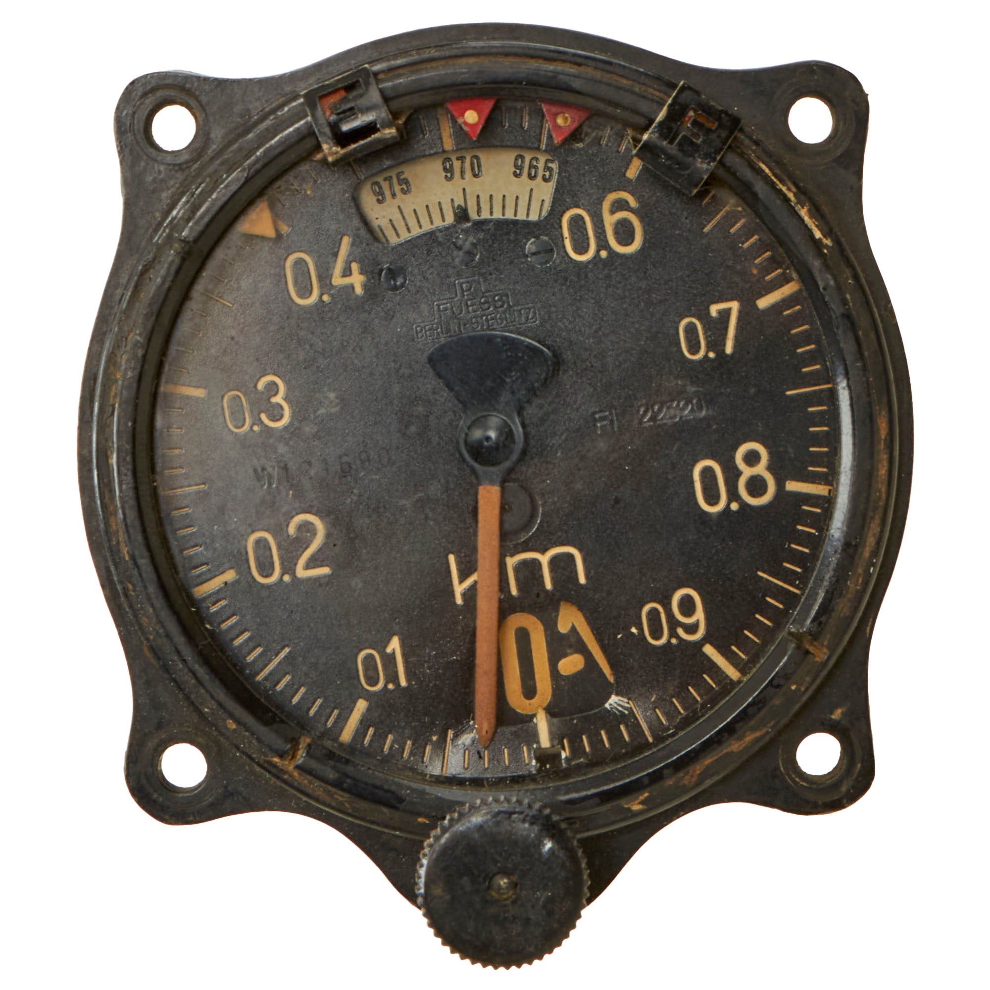 Original Items: Only One Available. This is an actual Höhenmesser (altimeter) as used in German WWII Luftwaffe aircraft. It is made of black bakelite, and the face registers coarse altitude in kilometers from 0 to 10,000. The reverse still has the hose plug present, which is marked Statischer Druckausgleich (Static pressure equalization). This connected to a pressure tube conveying air from outside the plane.