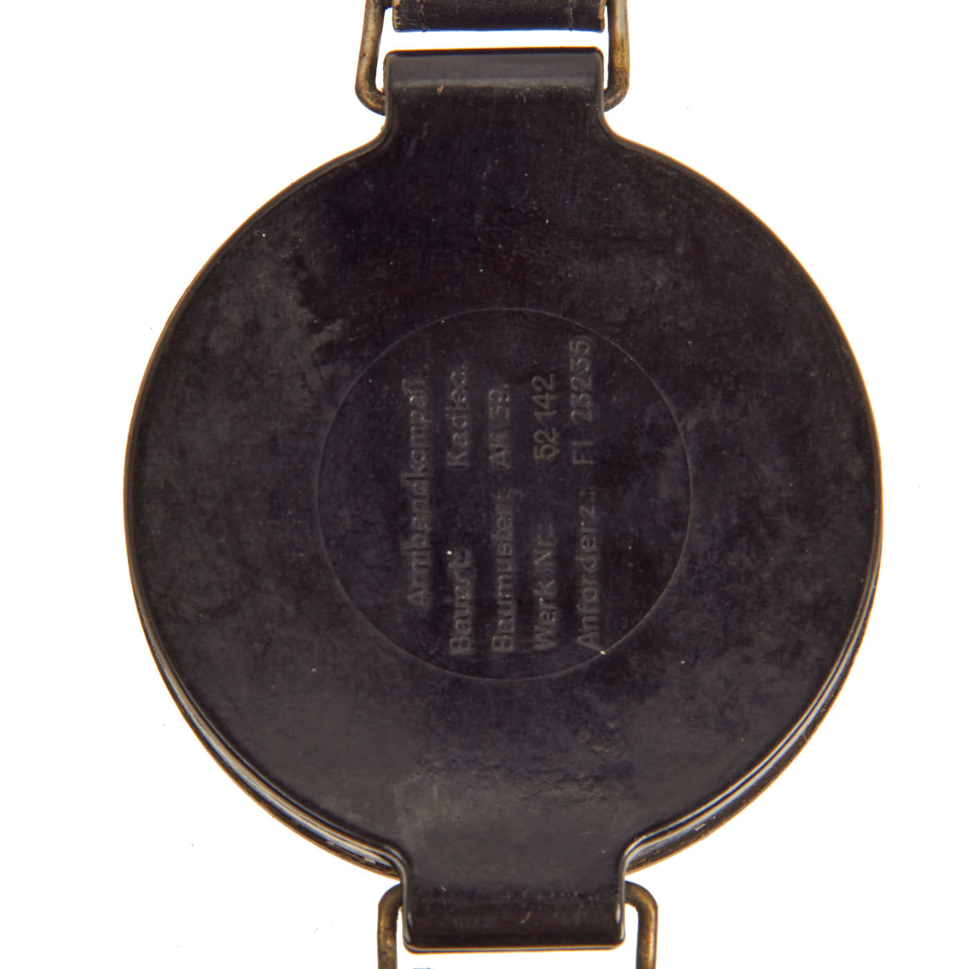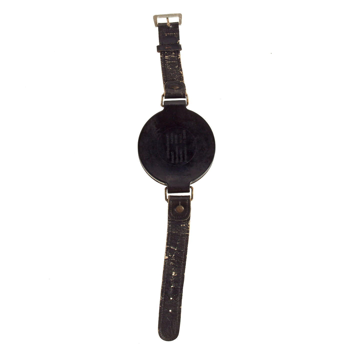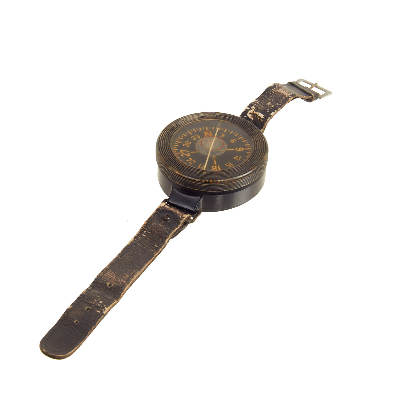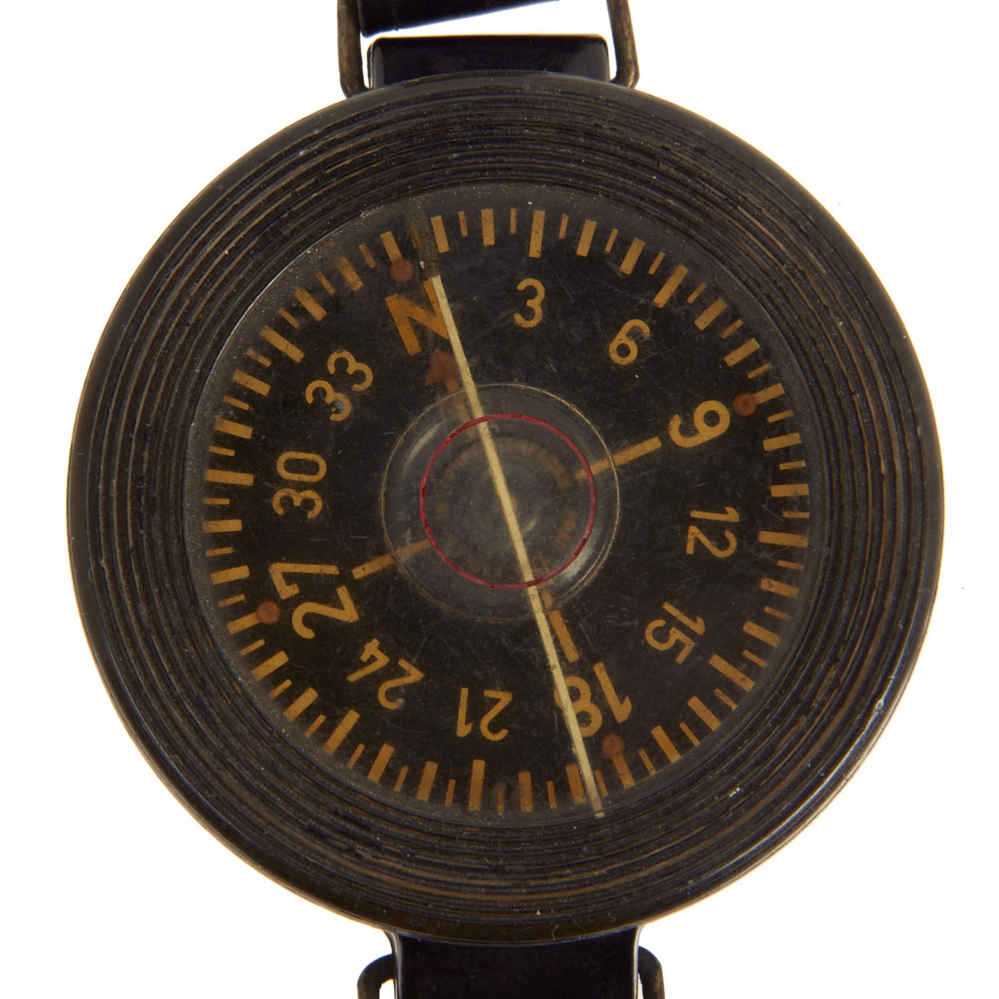 Original Item: Only One Available. Utilized by German pilots during WWII, these wrist compasses were made by Kadlec in Prague, Czechoslovakia and introduced as AK-39 (Armband-Kompass (wrist compass) 1939) to the Luftwaffe. The back of the black bakelite housing is marked with the maker and model information: