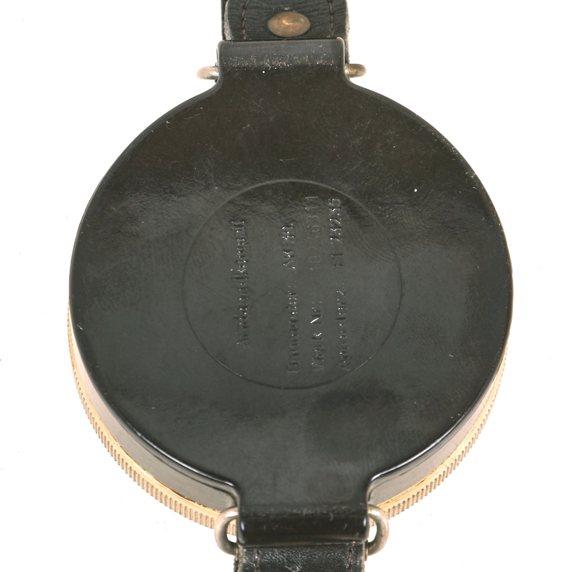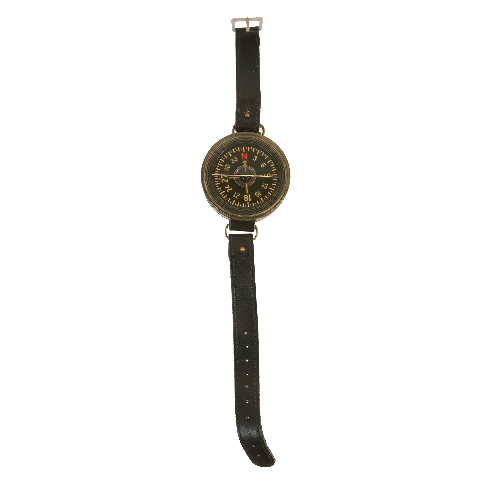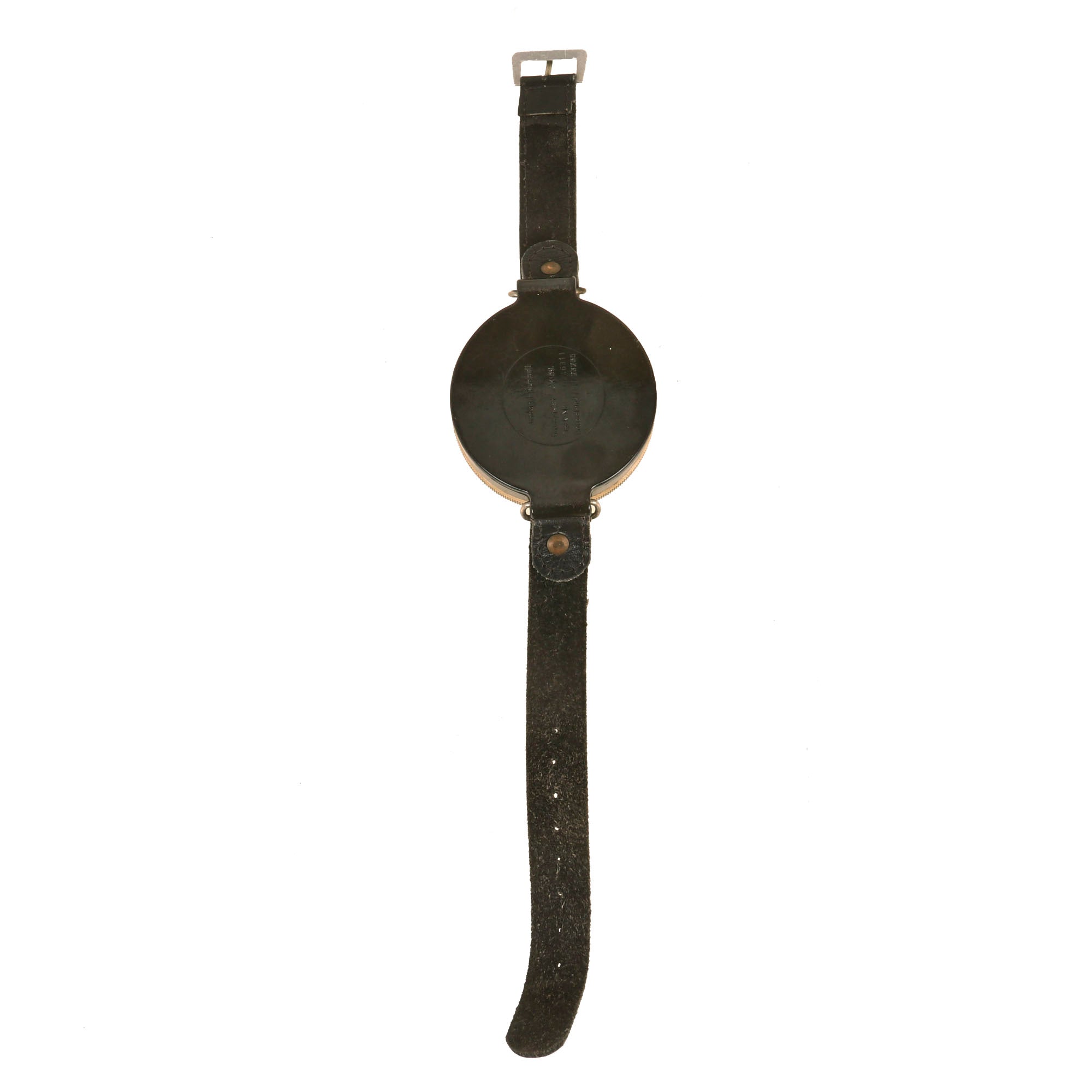 Original Item: Only One Available. Utilized by German pilots during WWII, these wrist compasses were made by Kadlec in Prague, Czechoslovakia and introduced as AK-39 (Armband-Kompass (wrist compass) 1939) to the Luftwaffe, though this one is not marked with maker information. The back of the black bakelite housing is marked with the maker and model information: