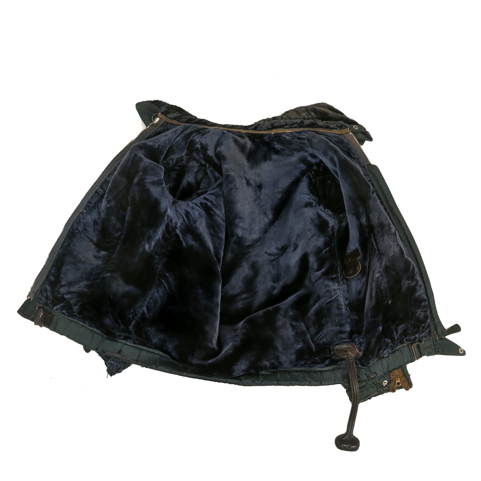This is a lovely service used condition heavy winter flight jacket, constructed from a blue twill fabric shell, with a blue velvet plush type material collar and lining. This extends part way into the sleeves as well, and really looks great. It features a plug in wired heating system, which still looks to be intact, having a wire on the interior that would probably connect to the pants portion of the set. There are also additional connectors at the ends of the sleeves for the use of heated gloves.