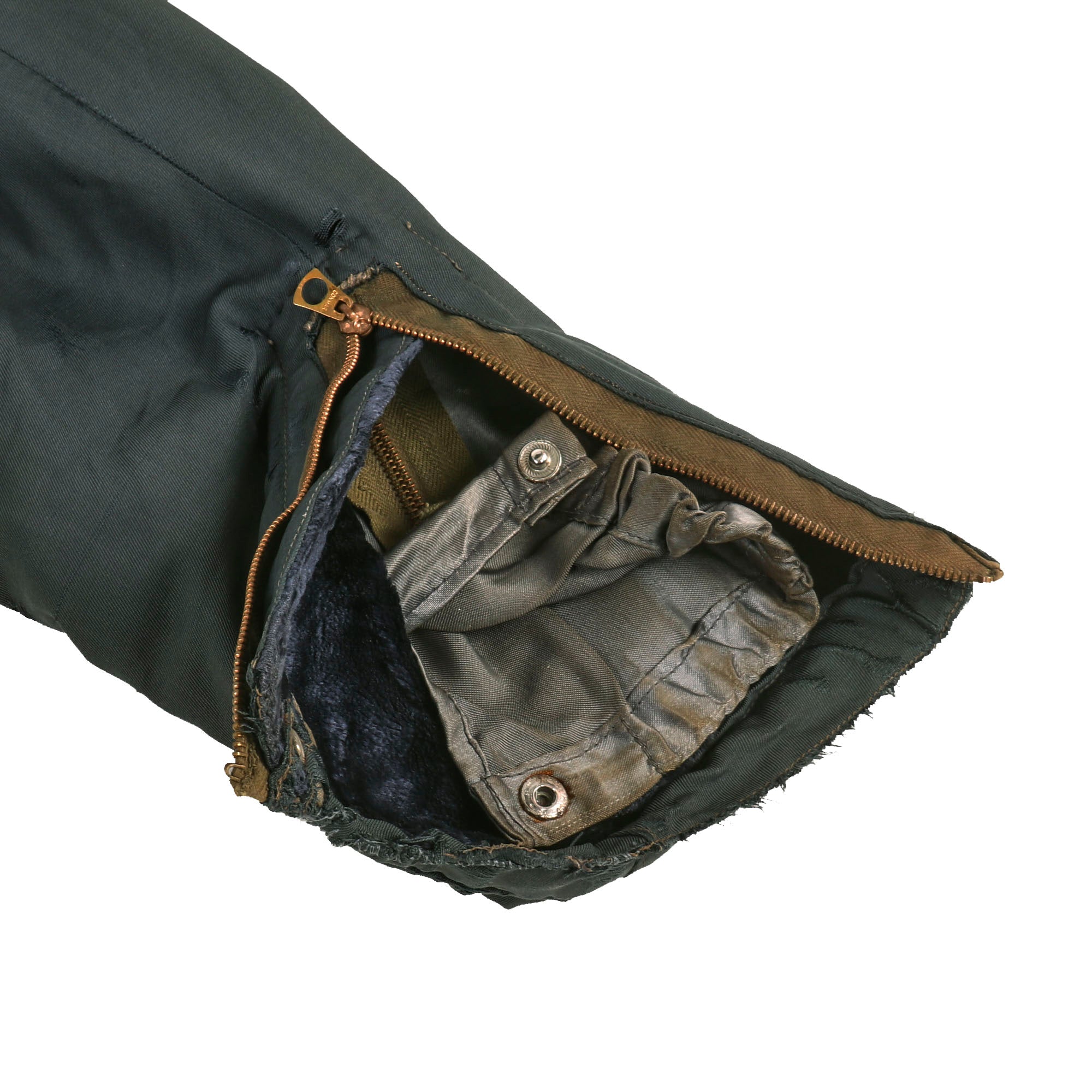 The jacket features a lovely embroidered Luftwaffe eagle on the right chest, which is correctly only sewn to the outer layer of fabric. We checked the snaps and all are STOCKO marked, a known supplier of snaps for the Luftwaffe during WWII. The main closure zipper is by RAPID, another known supplier, and retains the original leather pull tab. The the right sleeve zipper is by Elite, and all still has the original leather pull tab as well, while the left sleeve zipper is by CONMAR, a maker of zippers for the U.S. Military. This indicates that the left zipper was definitely replaced, but it definitely looks to be period. Based on the amount of wear on the jacket, it's possible that it saw service late into the war, and captured parts were used to repair it. The zippers all still function correctly, though they definitely show wear. We were not able to find any other markings on the jacket.