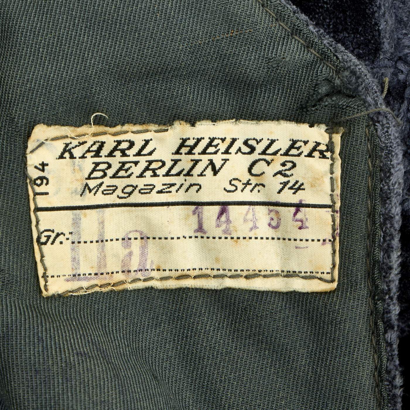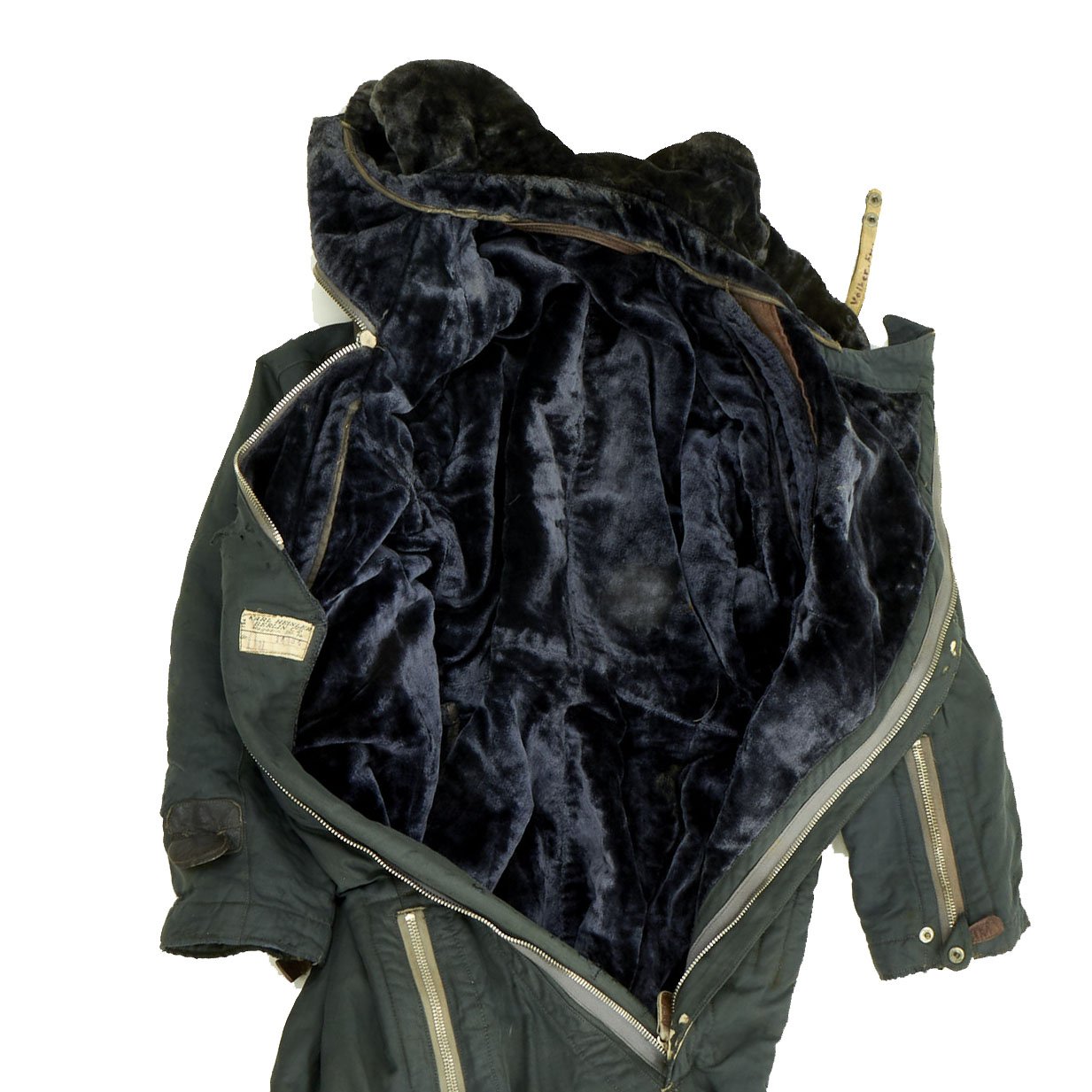 This is an excellent condition, heavy, one piece, coverall style, winter flight suit constructed in blue fabric with a large chocolate dark blue fleece collar and lining. Features plug in wired heating system. Buttons and zippers (ZIPP) look to be all complete. Both maker labels read Karl Heisler Berlin C2.
