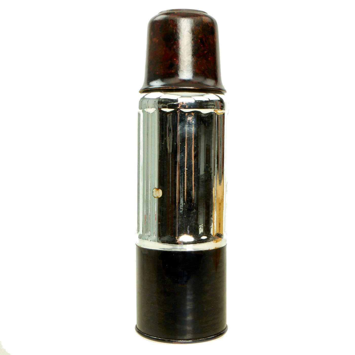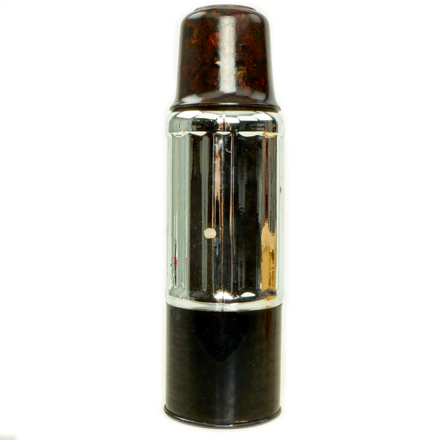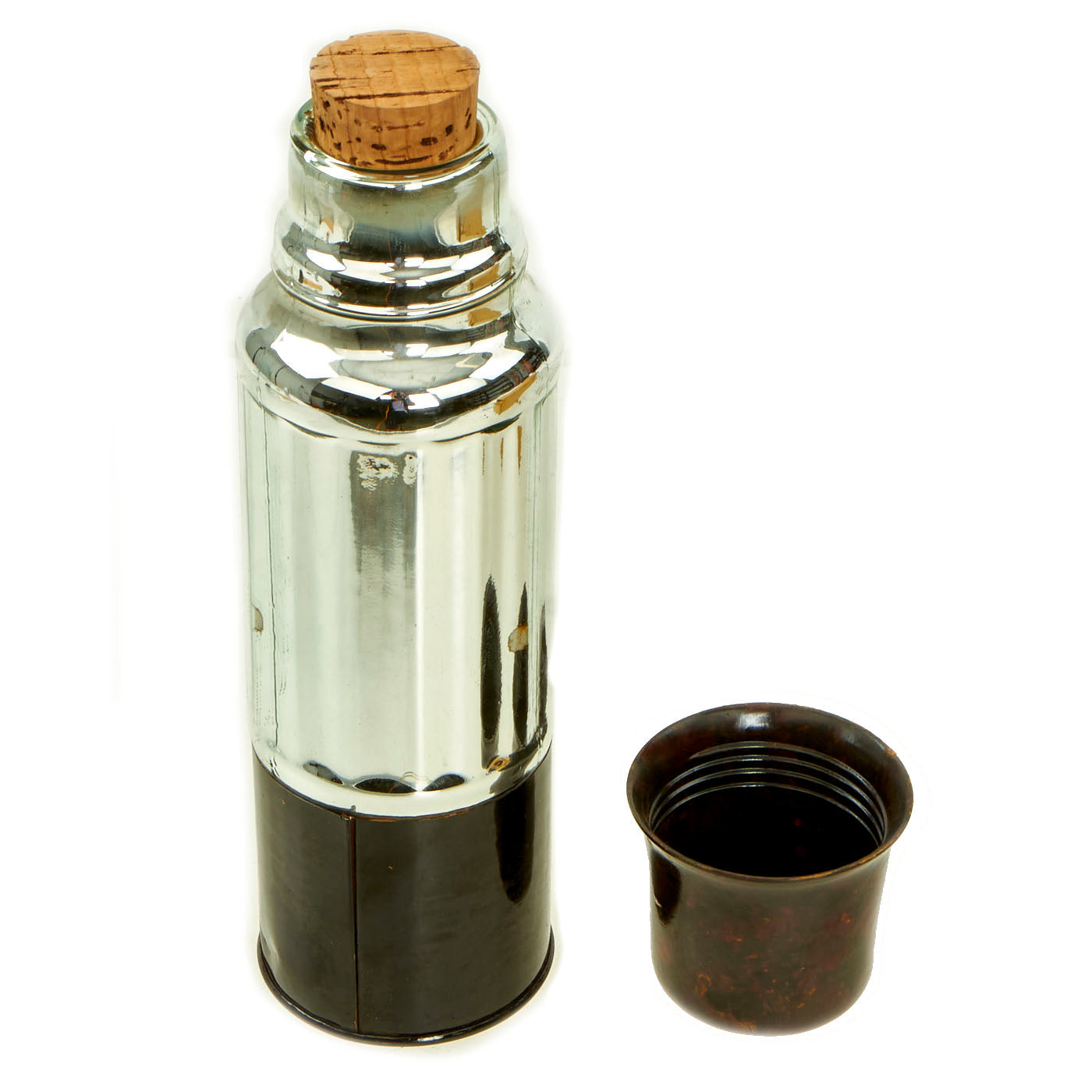 This thermos appears to be unissued and comes with the original issue cardboard box. The thermos itself appears to be constructed of an insulated glass body, thin metal base, cork stopper and a bakelite cup which threads onto the top of the thermos. There are no stamps or markings present on any of the items, but we have seen a few other examples just like this one, which aided in the identification process.