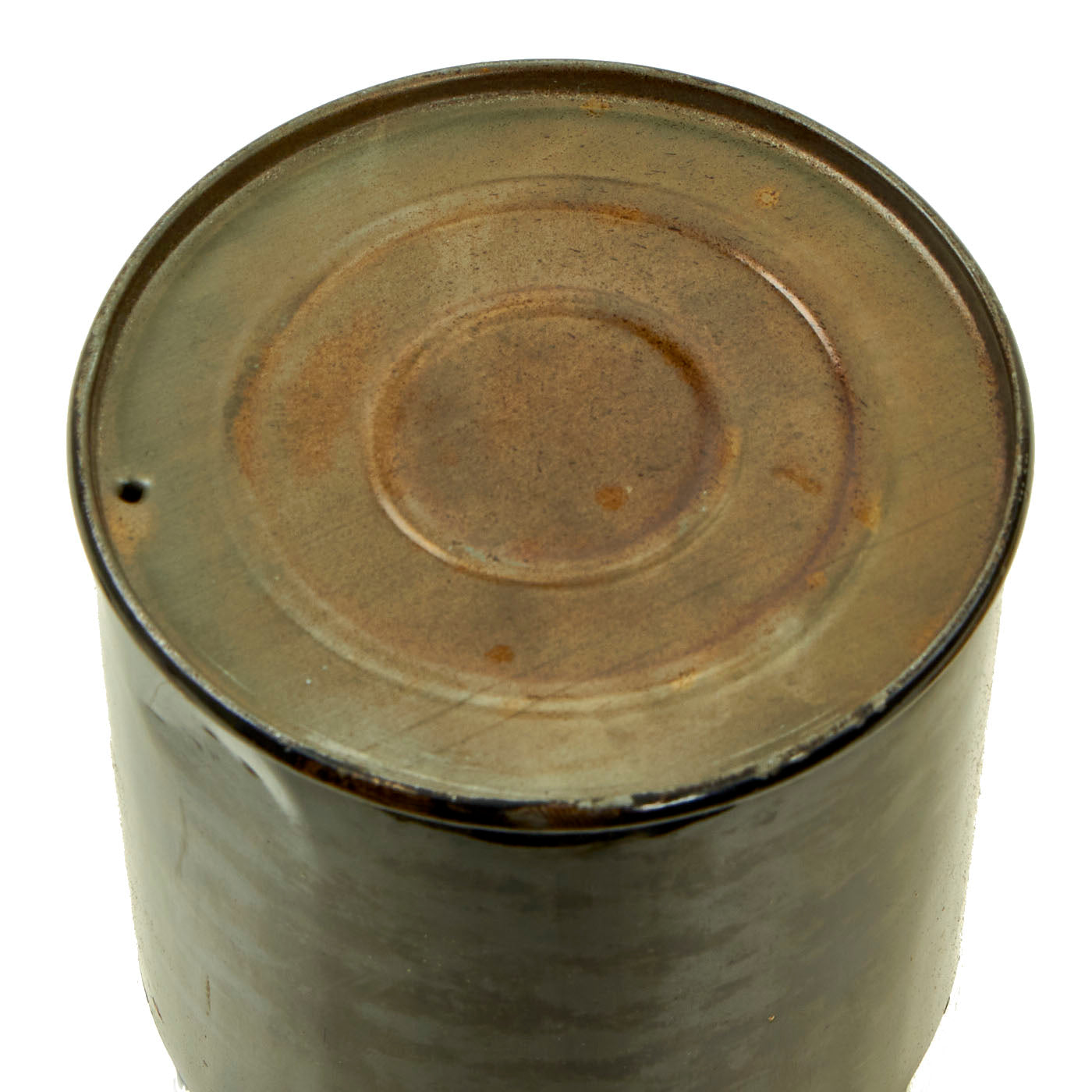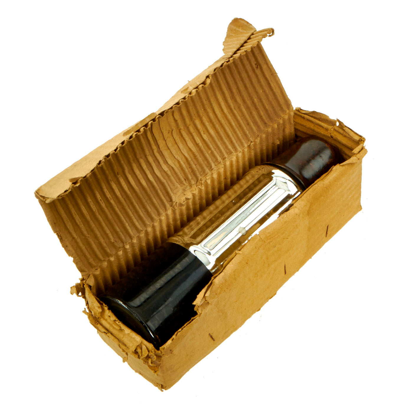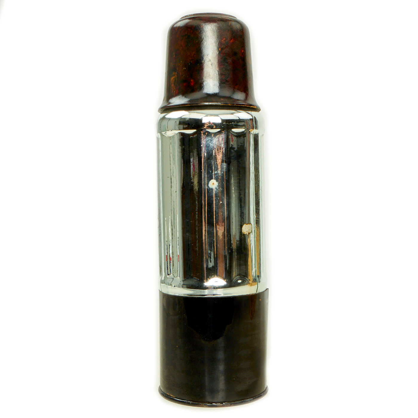This thermos appears to be unissued and comes with the original issue cardboard box. The thermos itself appears to be constructed of an insulated glass body, thin metal base, cork stopper and a bakelite cup which threads onto the top of the thermos. There are no stamps or markings present on any of the items, but we have seen a few other examples just like this one, which aided in the identification process.