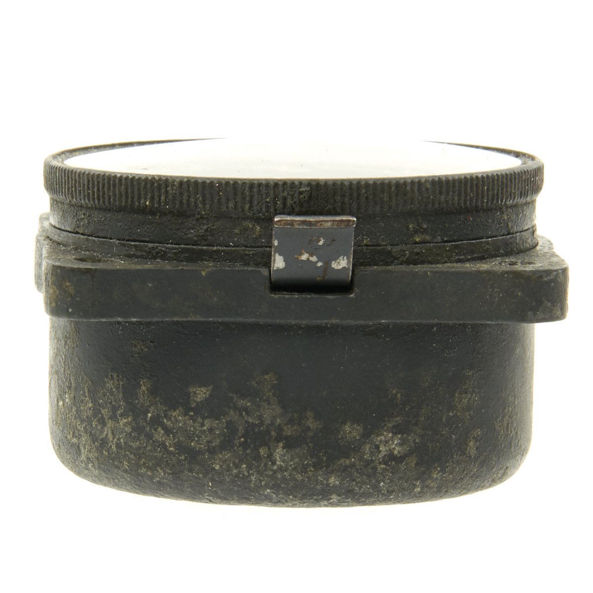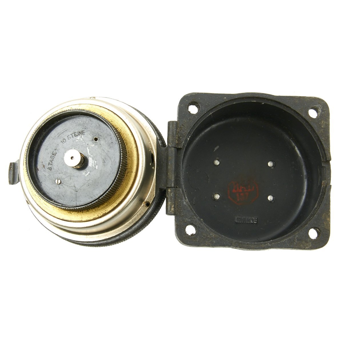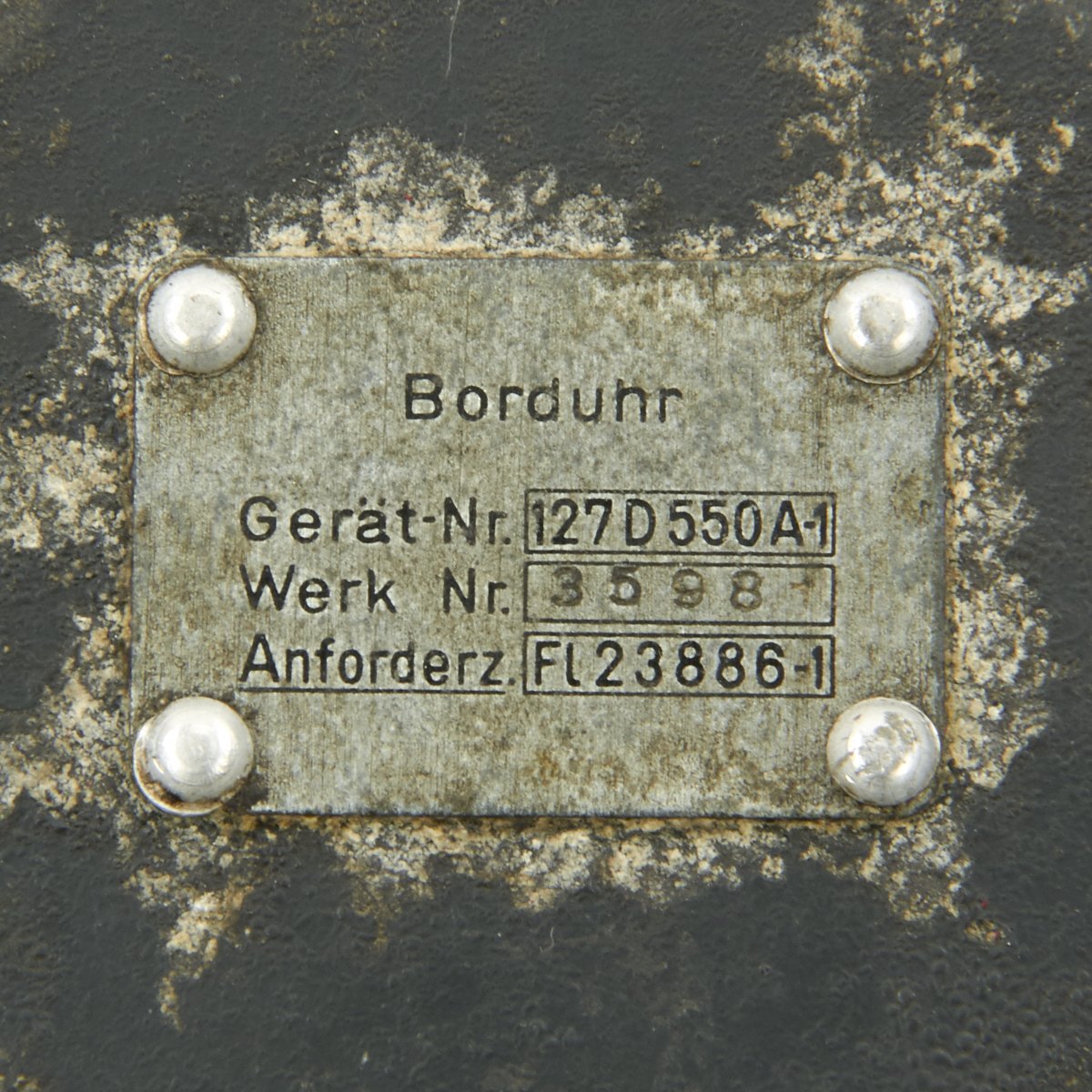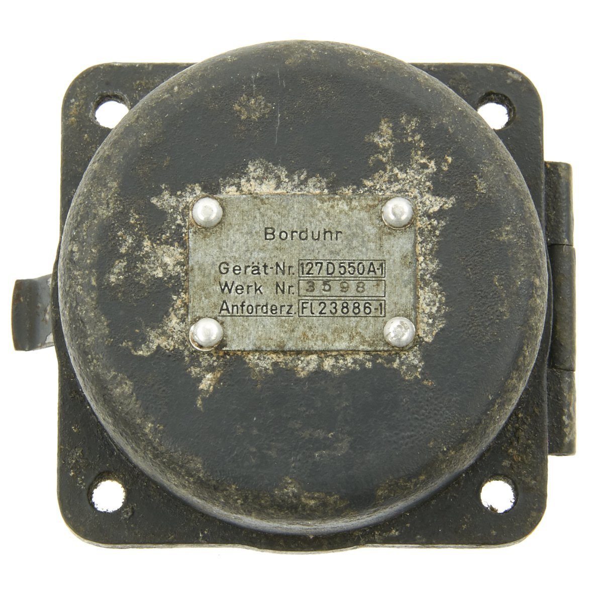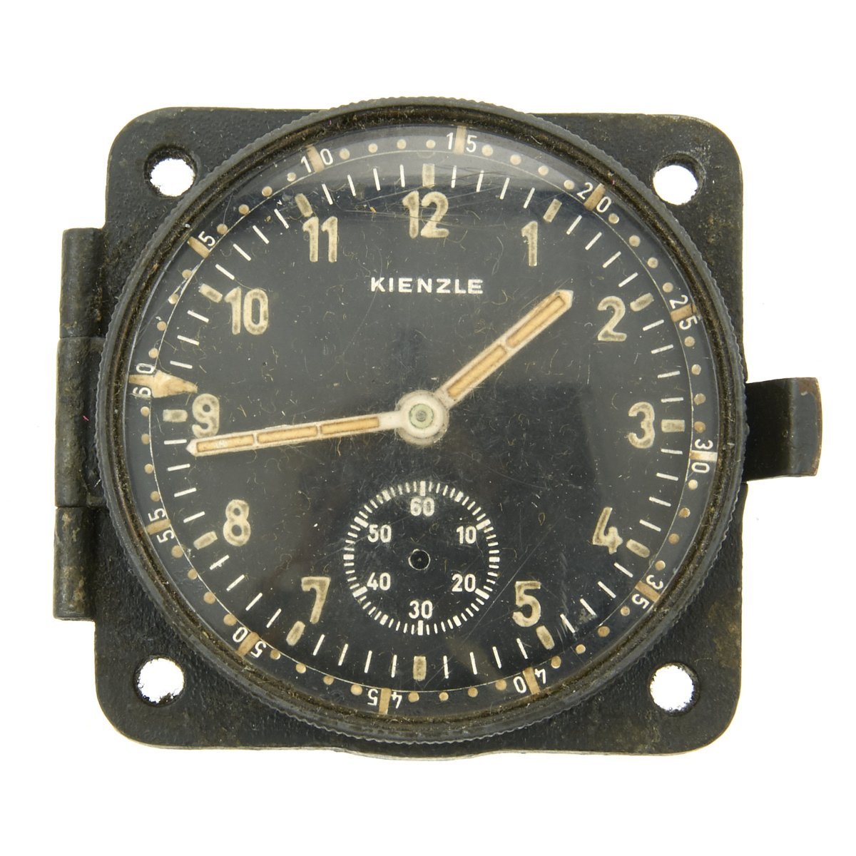 Original Items: Only One Available. This is an actual BoUK2 Eight-Day Borduhr (Clock) from a German WWII Luftwaffe Heinkel HE-111! It is housed in a steel casing, which opens up so that the clock spring on the back can be wound, and the time adjusted. The face is well marked with maker KIENZLE, and the back is marked with Work Number 3598 and Luftwaffe number Fl. 23886-1. The back of the clock indicates that it is 8 TAGE (DAYS) and the movement is 10 STEINE (JEWELS)