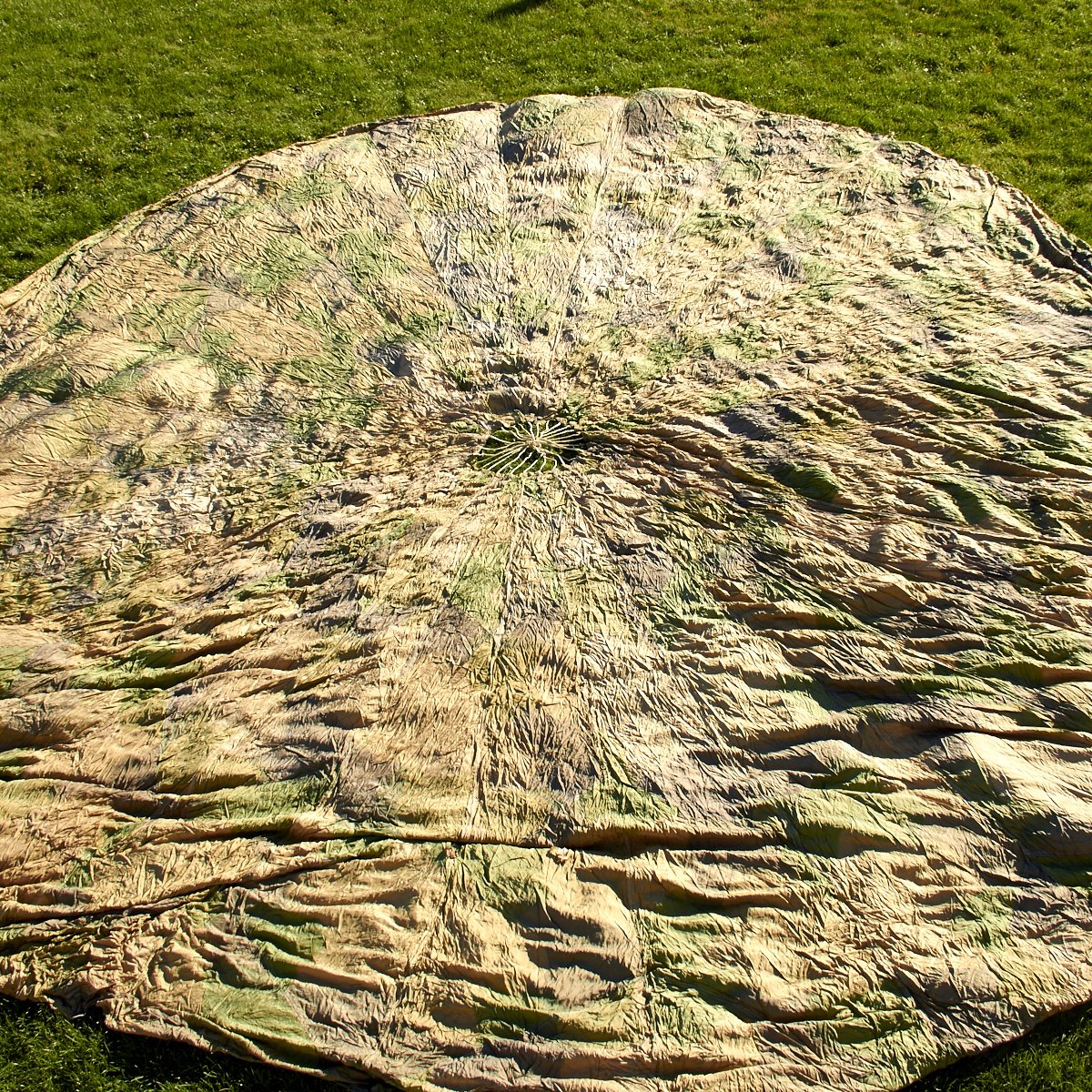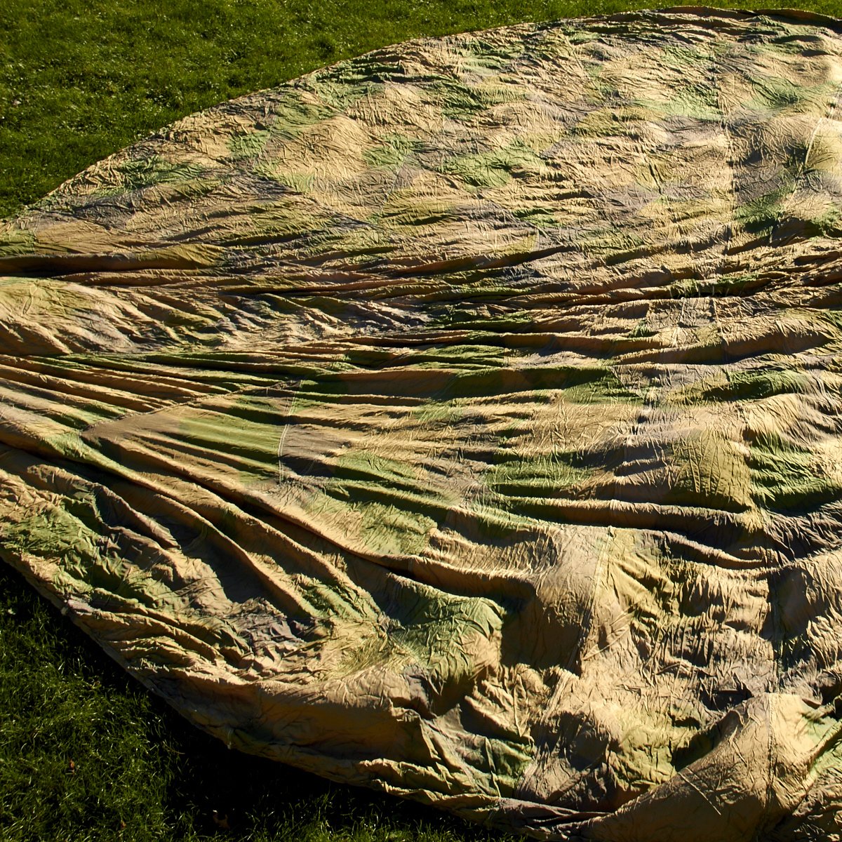 Original Item: Only One Available. This is a totally original German WWII Rz20/36 transitional Paratrooper parachute that includes a 28 panel camouflage silk canopy and deployment bag. This model is a very rare transitional model, featuring an RZ20 style canopy contained in the new RZ36 Deployment bag. The shroud lines and risers have unfortunately been cut, as well as the anchor line, and are missing. If it was intact, it would have the RZ36 harness with only one release buckle and packtray. Only bags marked 10-433 D-1 are for the transitional model. Later RZ36 bags packed with the RZ36 canopy would be marked 10-436 A-1.