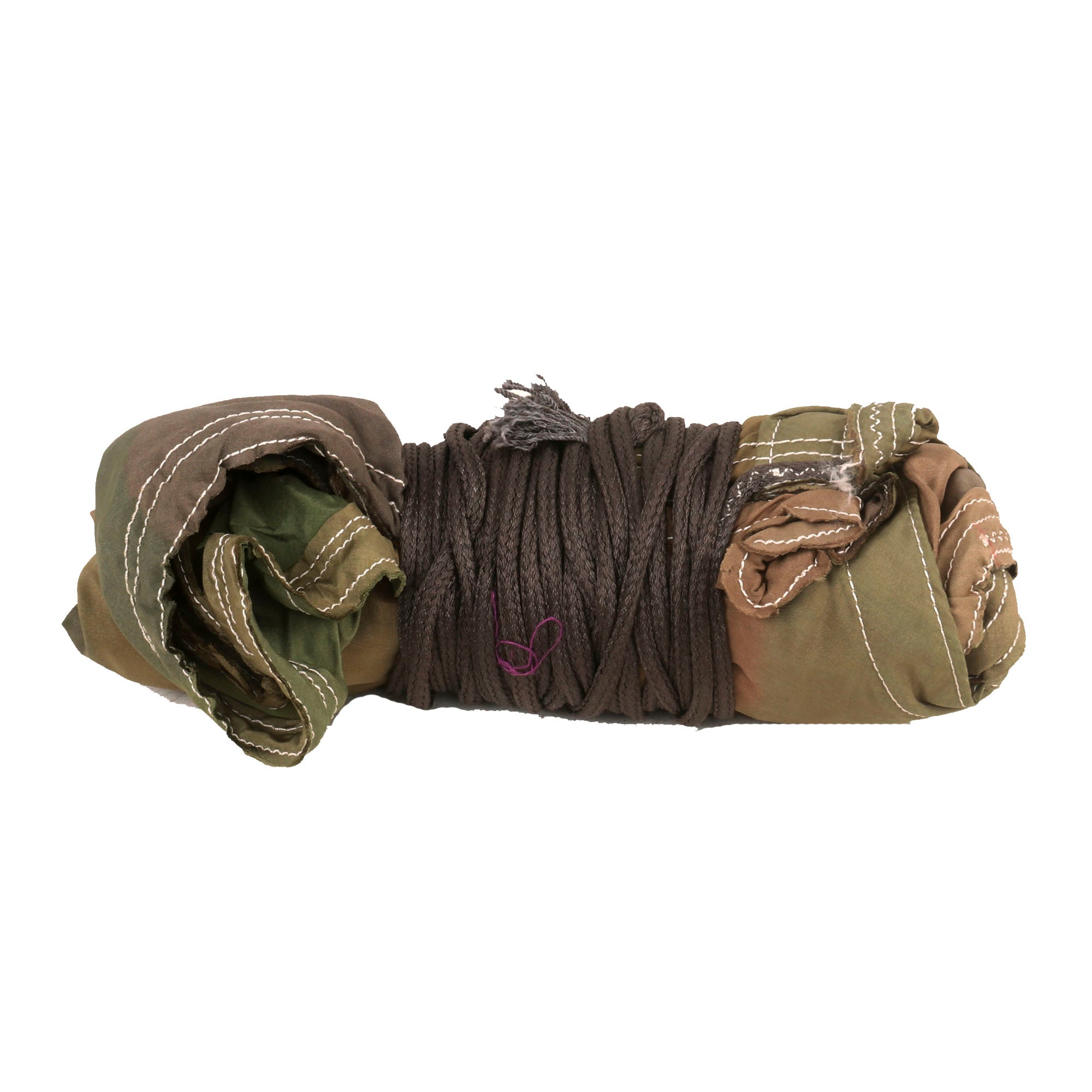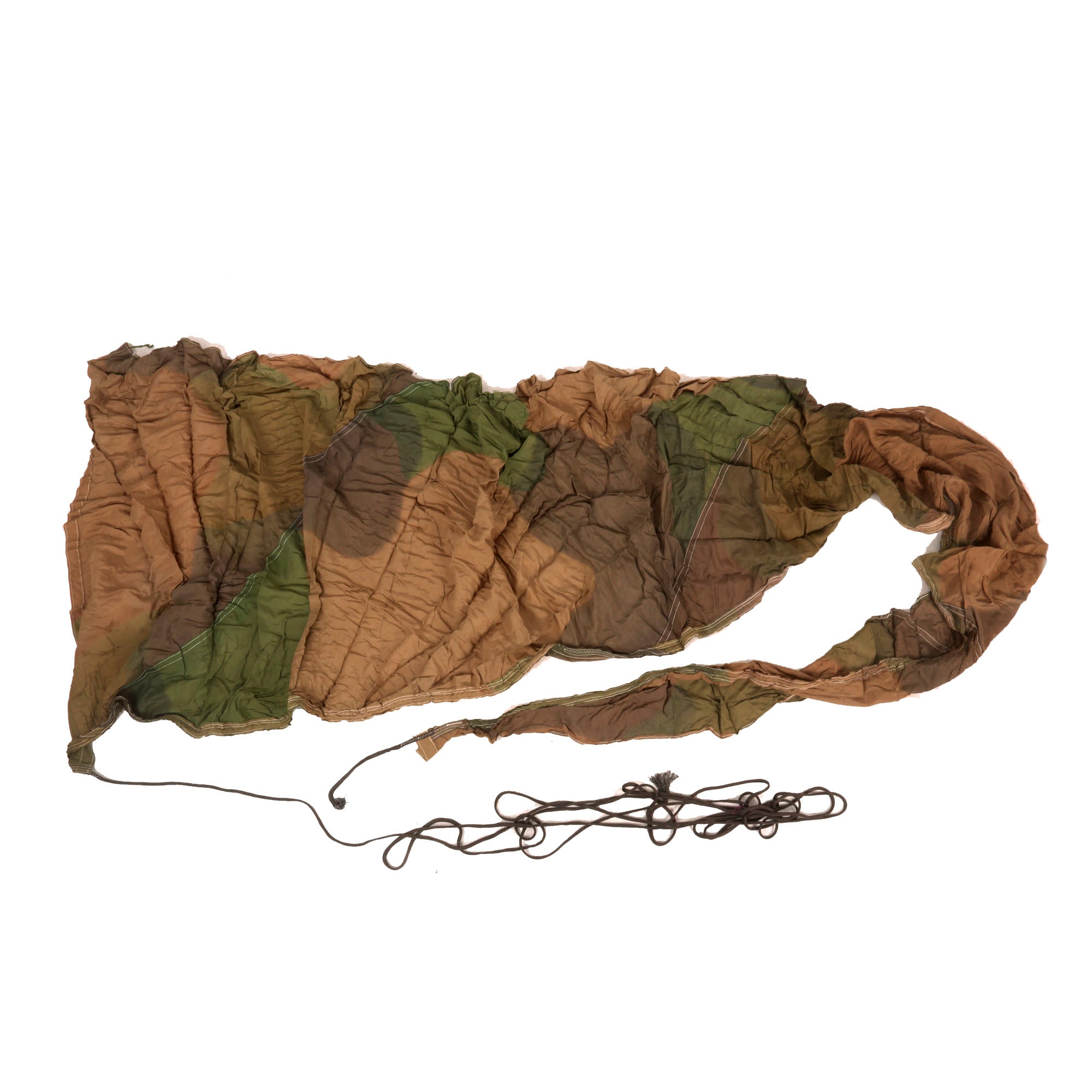 Original Item. Only One Available. This is a nice small section of a German parachute which is not marked anywhere we can see. The parachute camouflage material is exactly the same as would be on a Fallschirmjäger parachute. The parachute section measures roughly 38” wide at its widest, and gradually gets smaller and smaller towards the other end, perfect size for display with other items.It retains a bit of its rigging lines, which connect to a central loop, which has a camouflage cover on it.Comes ready for further research and display.