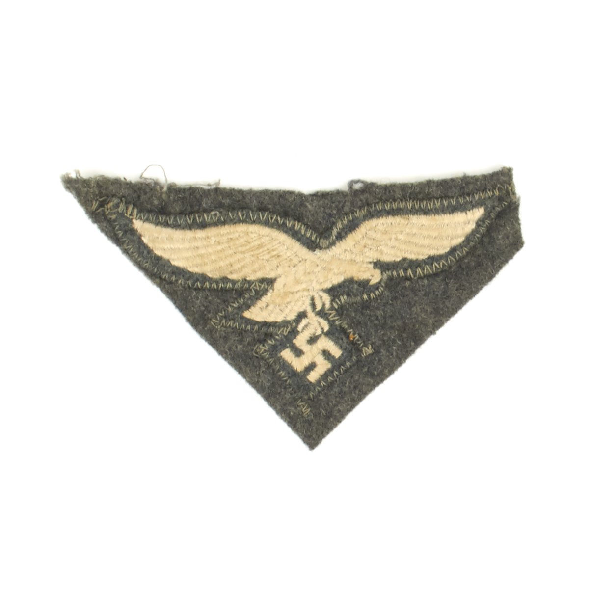 Original Item: Only One Available. This is a superb embroidered breast eagle from a German WWII Luftwaffe (Air Force) Combat Uniform. Cut out with background wool backing triangle which measures approximately 4 x 2.75.