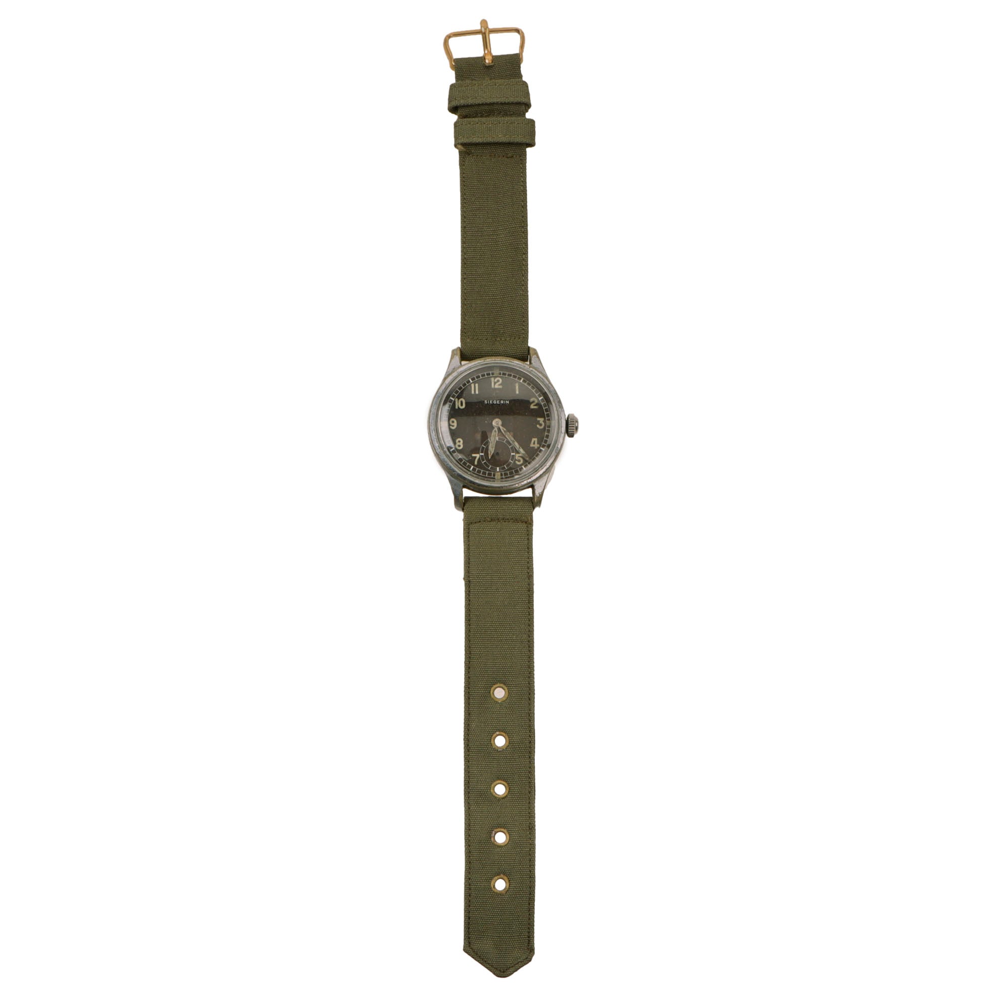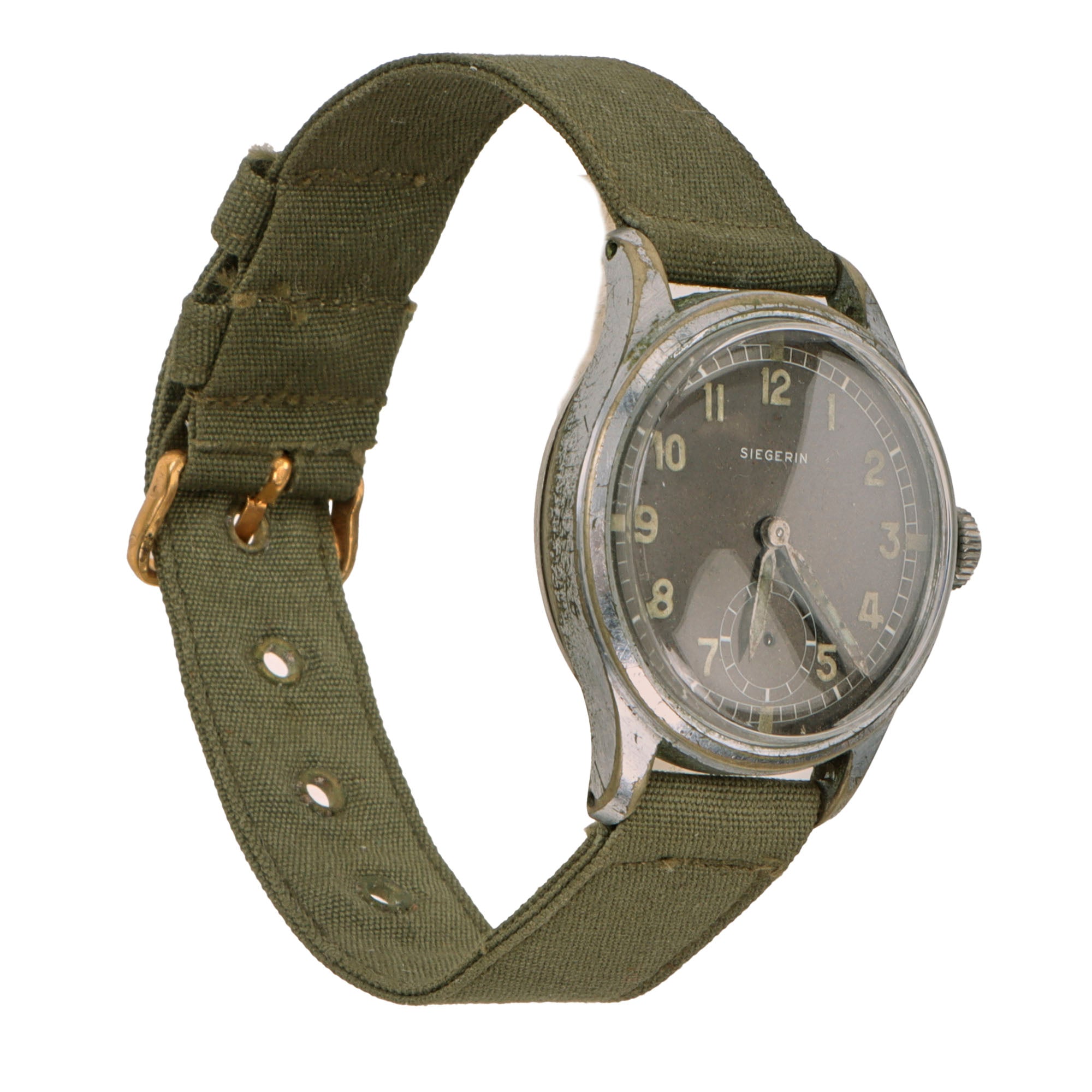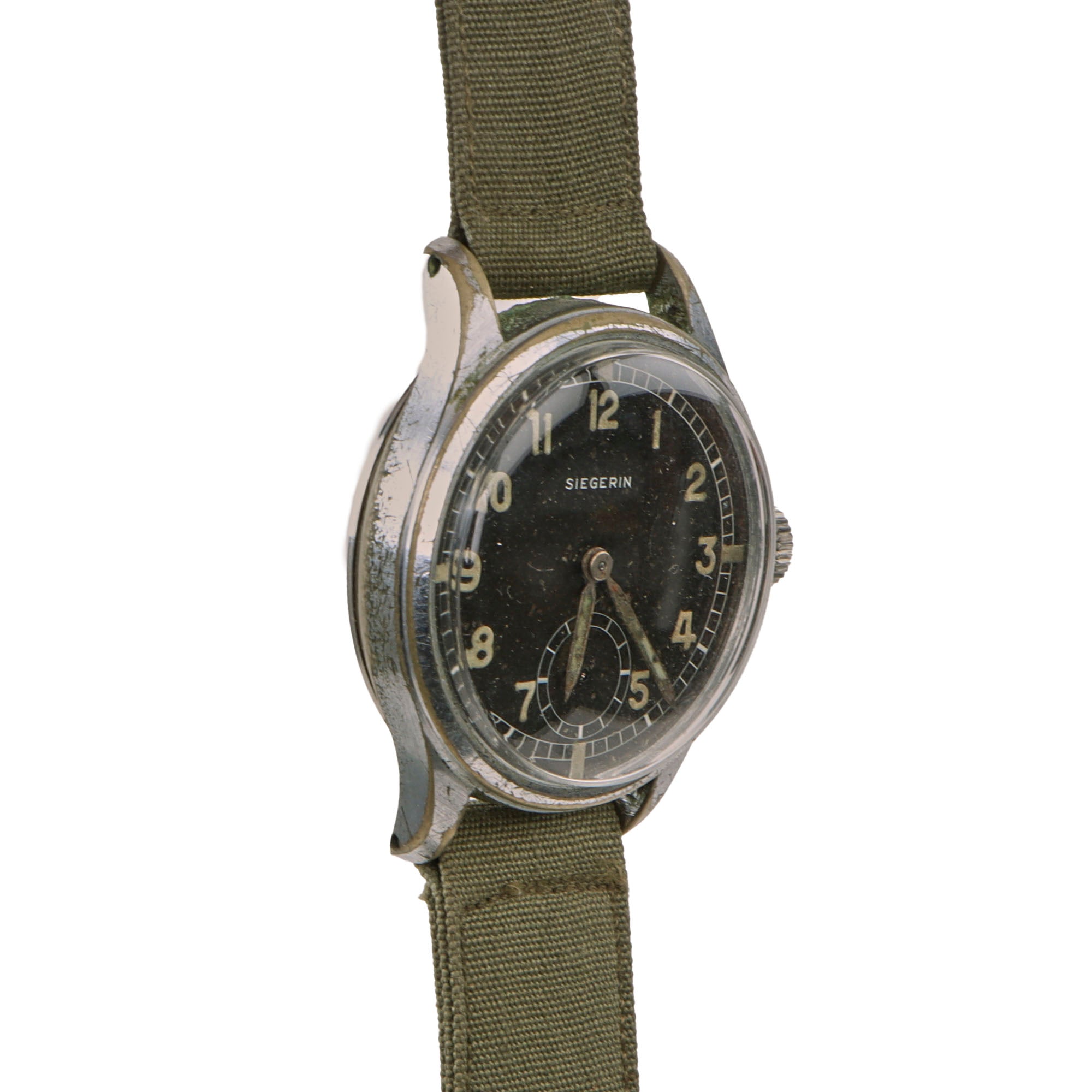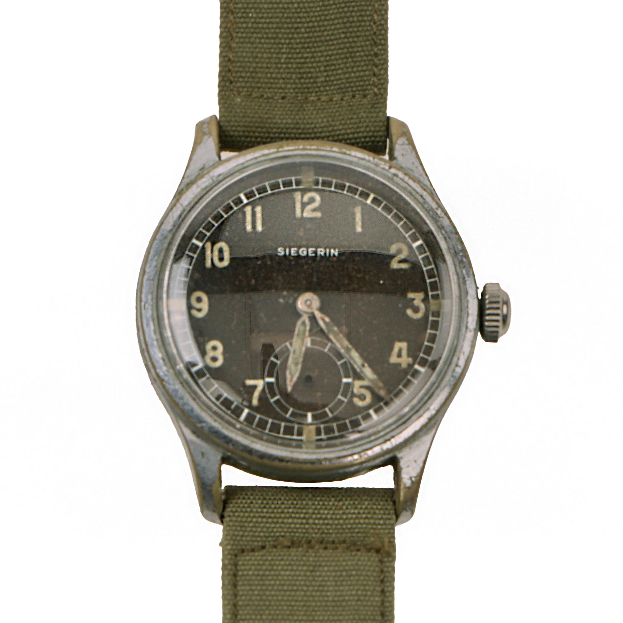 This genuine vintage German military Siegerin wristwatch from the WWII period is offered in good but non-functioning condition. Constructed as a two piece case with fixed lugs bars, body with acrylic crystal, original chromium coating, screwed stainless steel back. The case is in good shape with some small nicks and scuffs. Chromium plated original crown, original black dial, military style, marked on face in white: