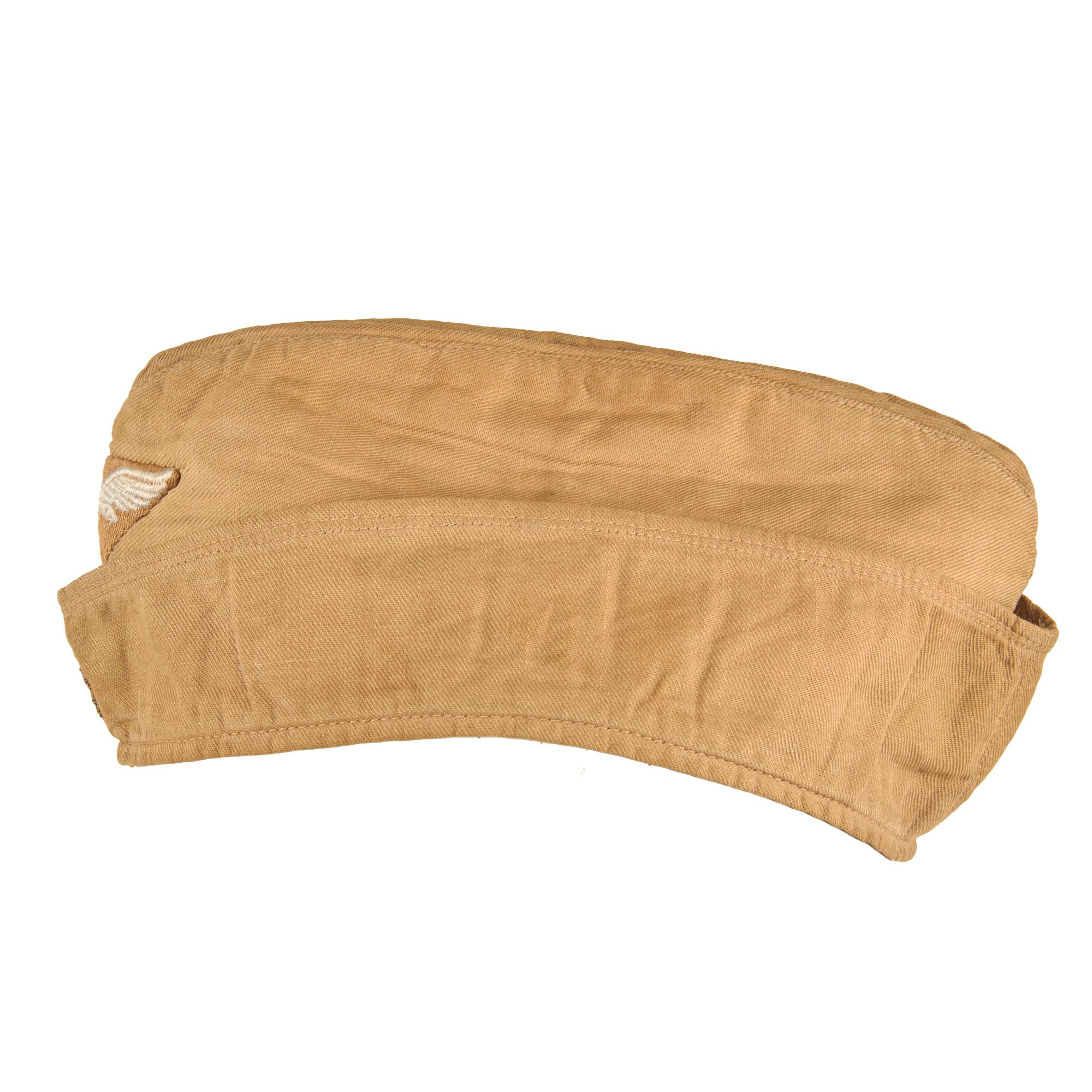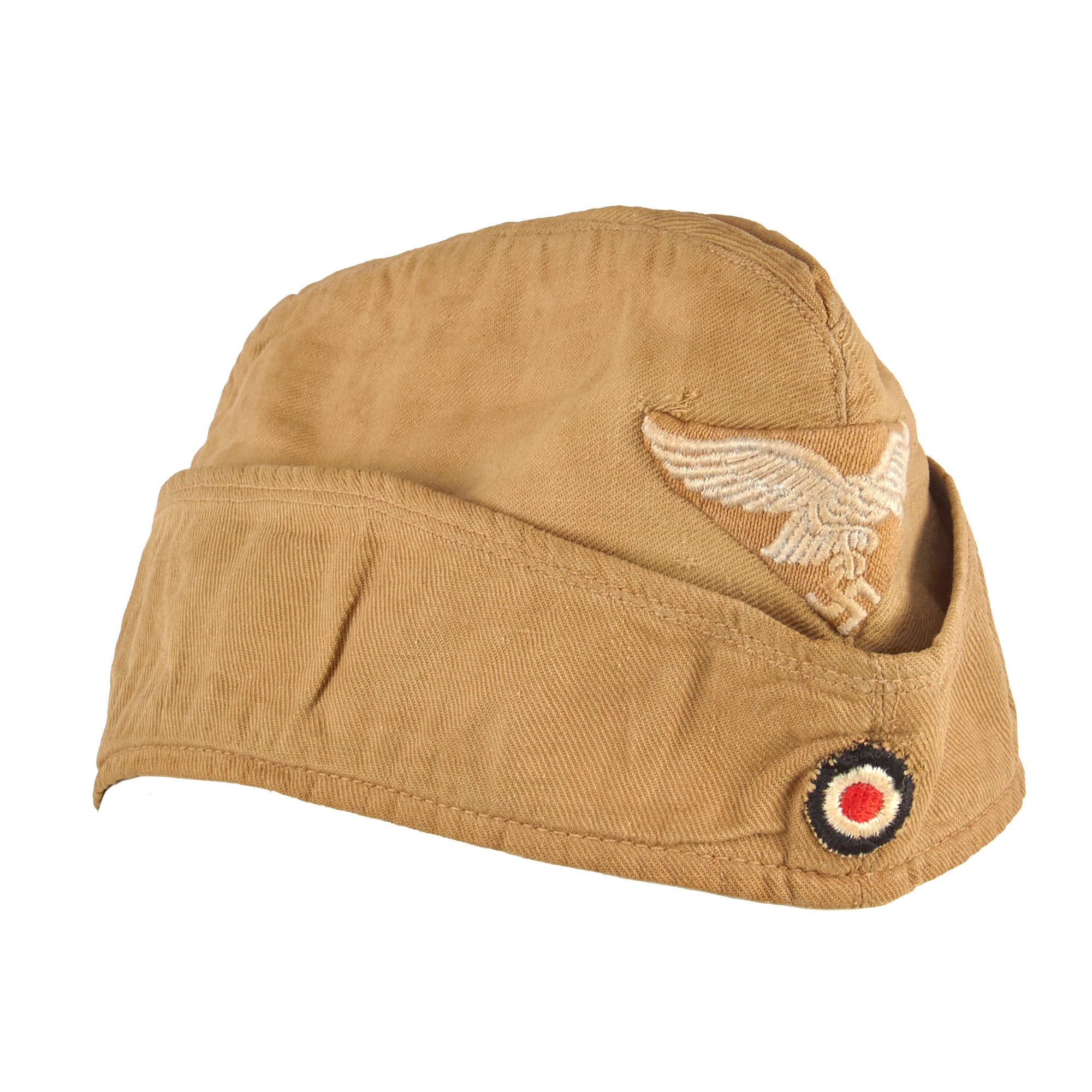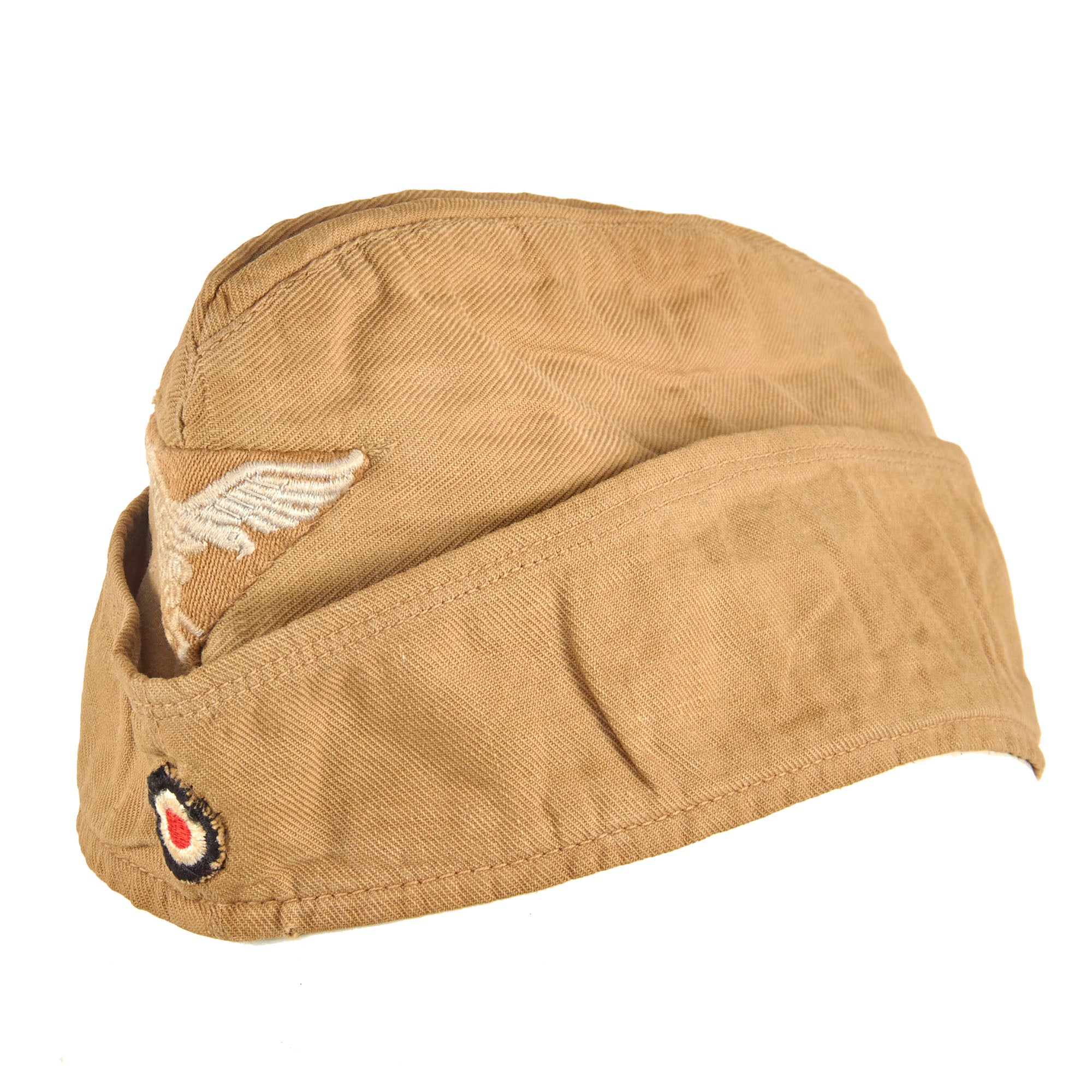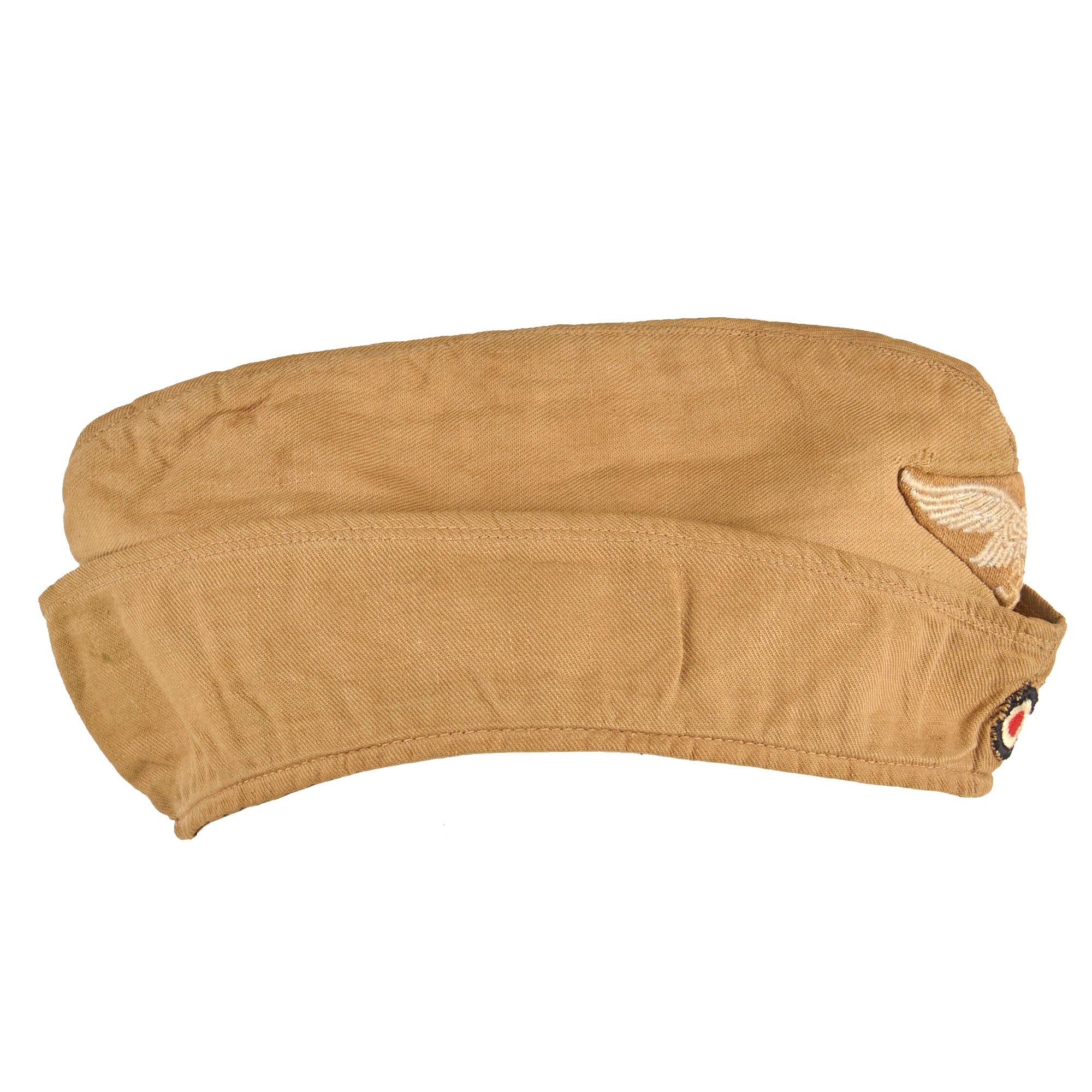 This is a very nice Luftwaffe Tropen Fliegermütze (tropical pattern overseas cap), worn by NCO and enlisted ranks in the DAK and southern Europe. Styled after the 1938 pattern, it is produced in DAK tan cotton twill with a fold down flap around the entire perimeter. The front has a very nice Tropical pattern Luftwaffe Eagle, embroidered with gray / silver threading on a tan triangular background. Beneath is the correct Tri-color cockade, which has the correct tan background. The Eagle insignia is sewn only to the outer layer of fabric, so it was definitely installed during production.