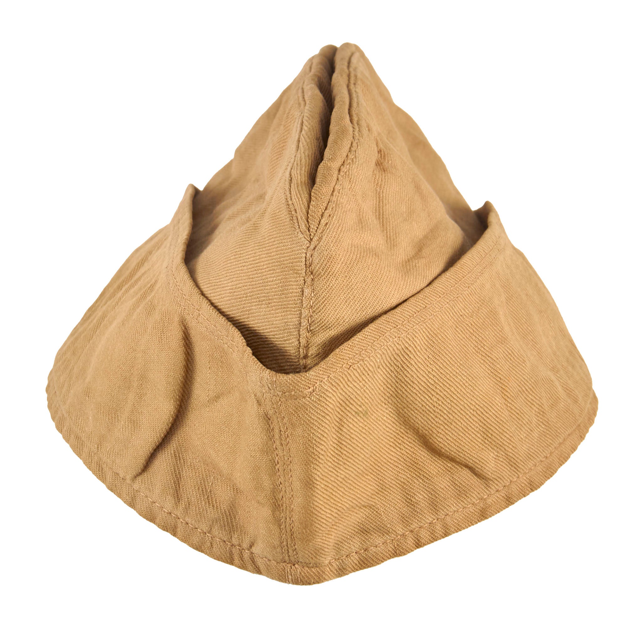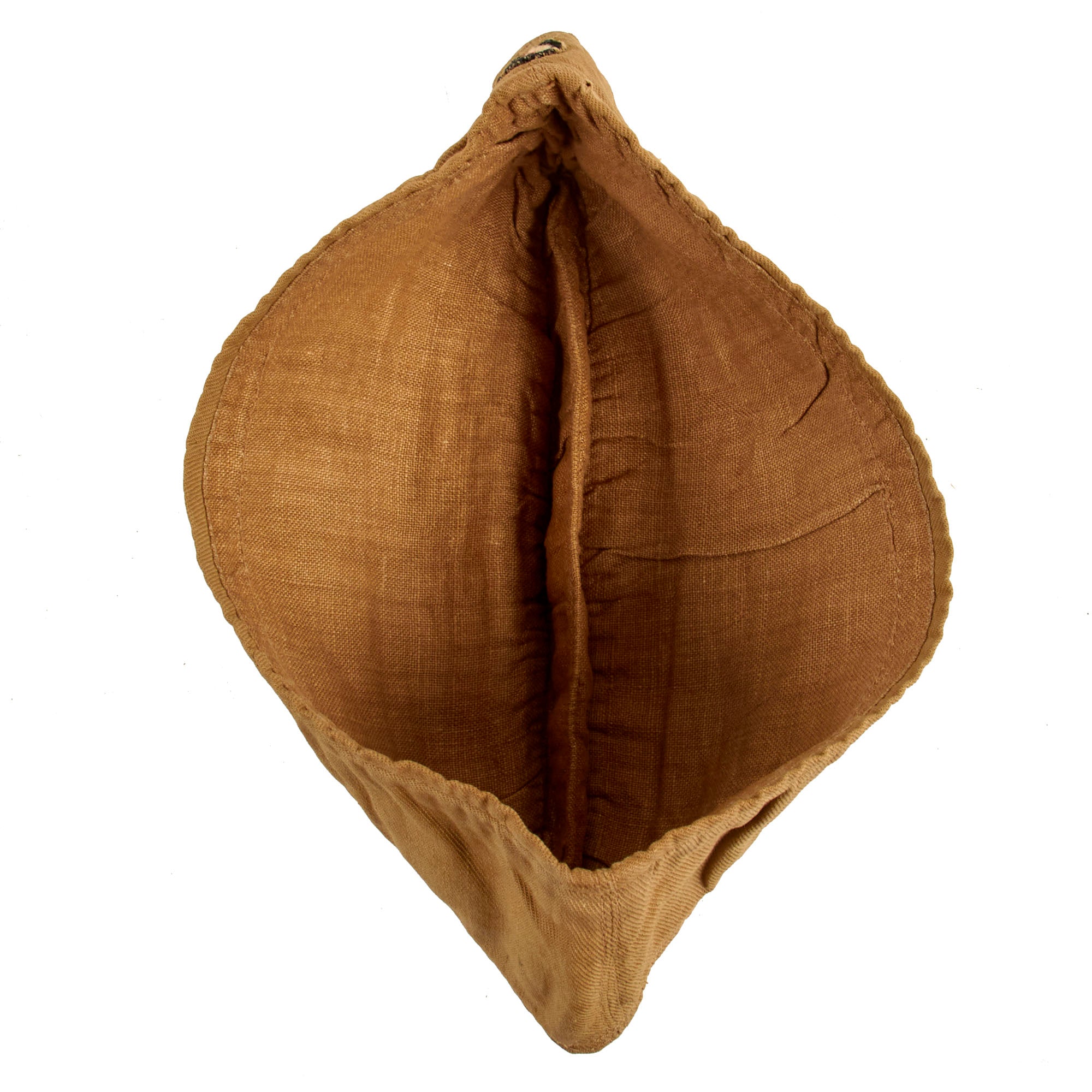 The interior is lined with lightweight tan canvas, and as far as we can tell is totally unmarked. There is no major damage or repairs to the cap, though it does show some weathering and facing.