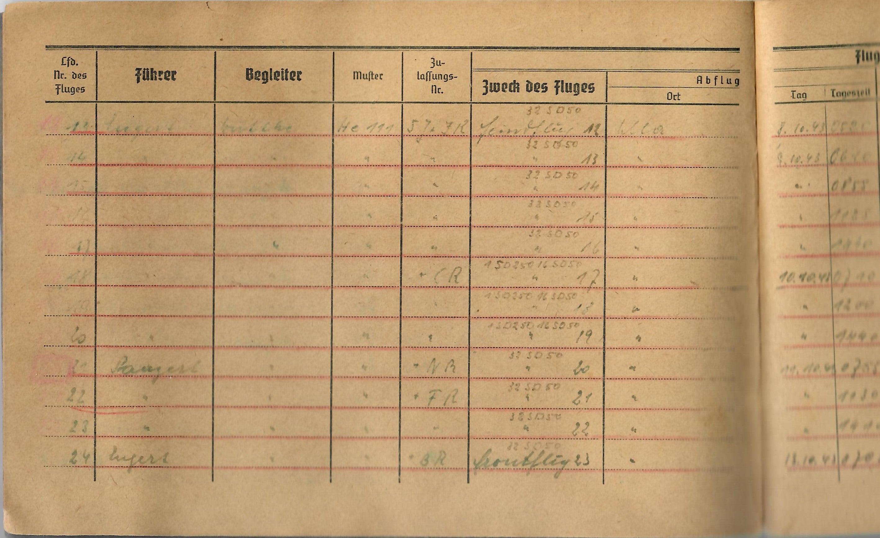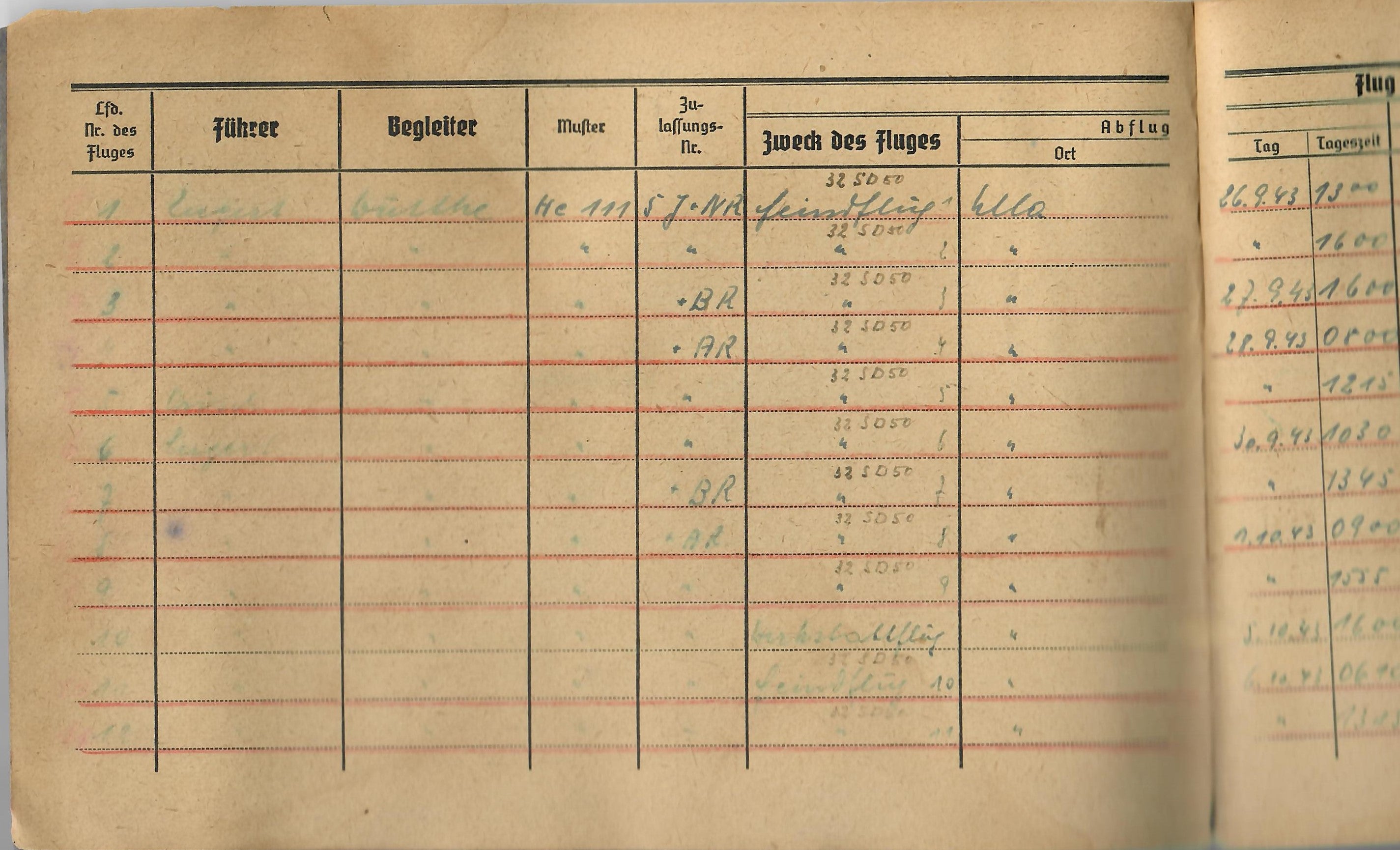 Wuttke's Flugbuch (Flight Log) begins on September 26, 1943 and ends on May 19, 1944