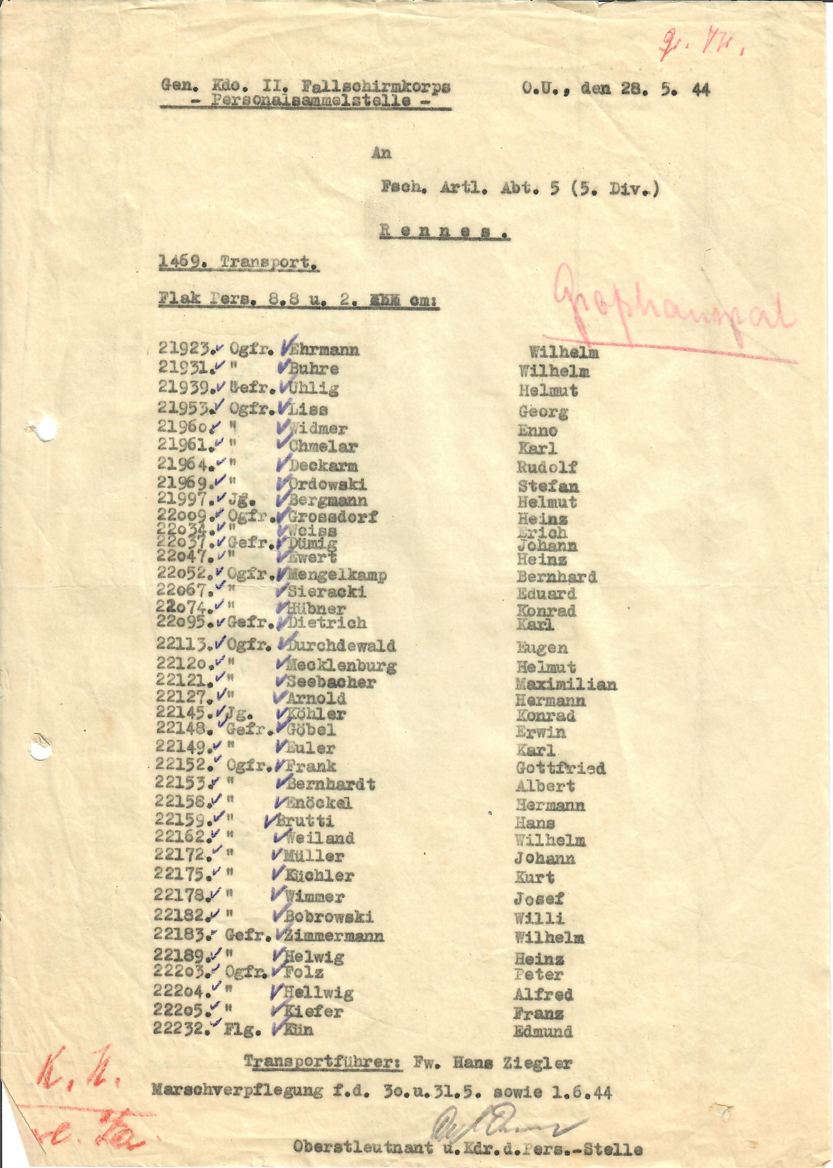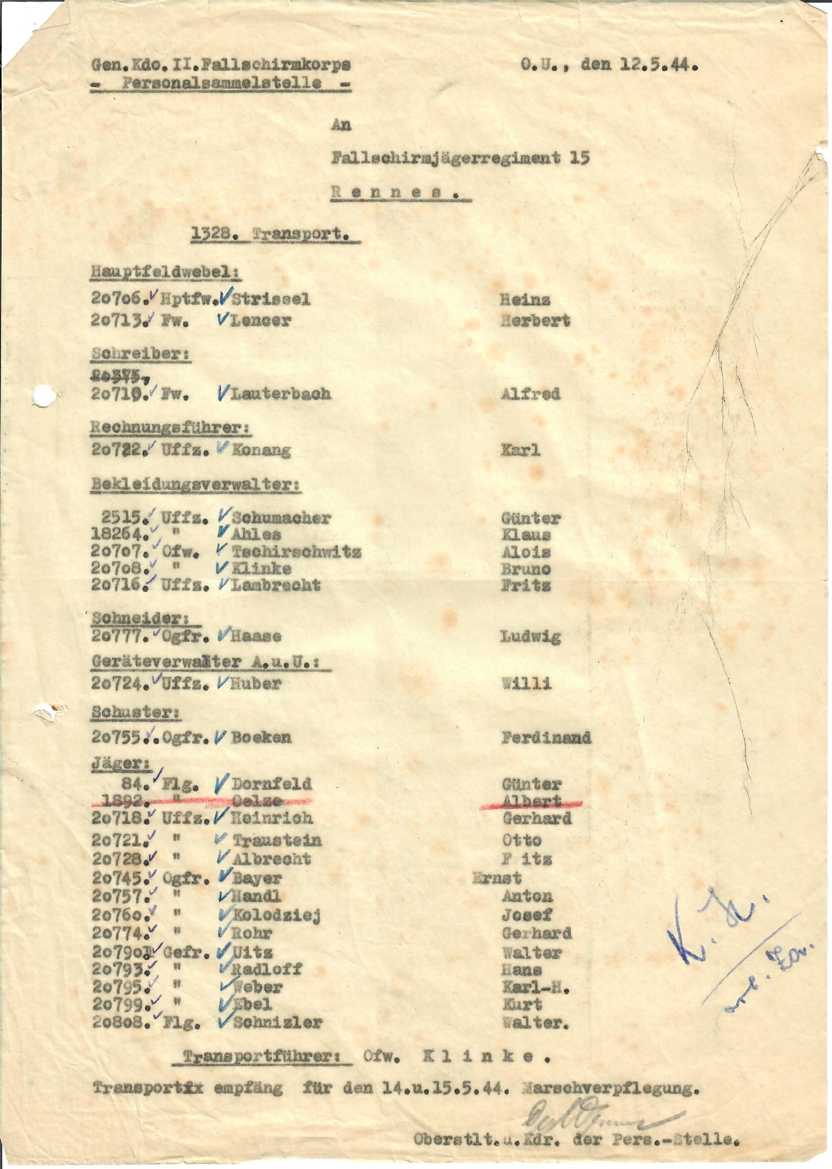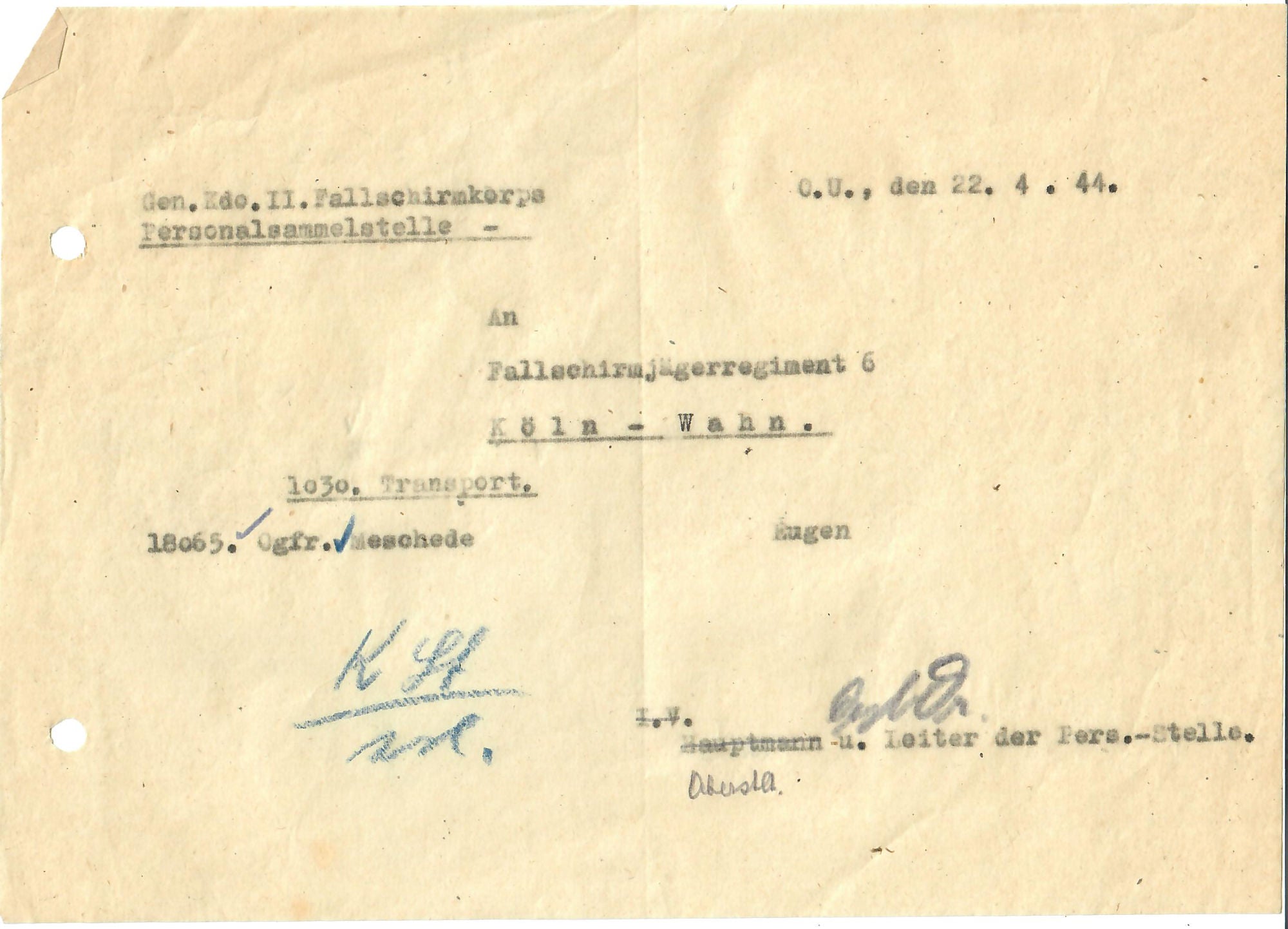 - Three Lufwaffe documents dated April and May 1944, which look to be transfer and rosters from Fallschirmjäger Paratrooper units.
