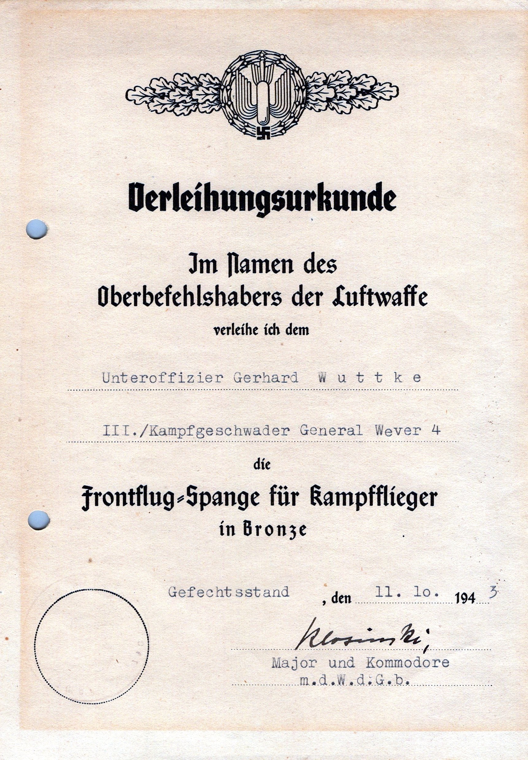 - Frontflug-Spange für Kampfflieger in Bronze (Bomber Clasp in Bronze) – awarded October 11, 1943