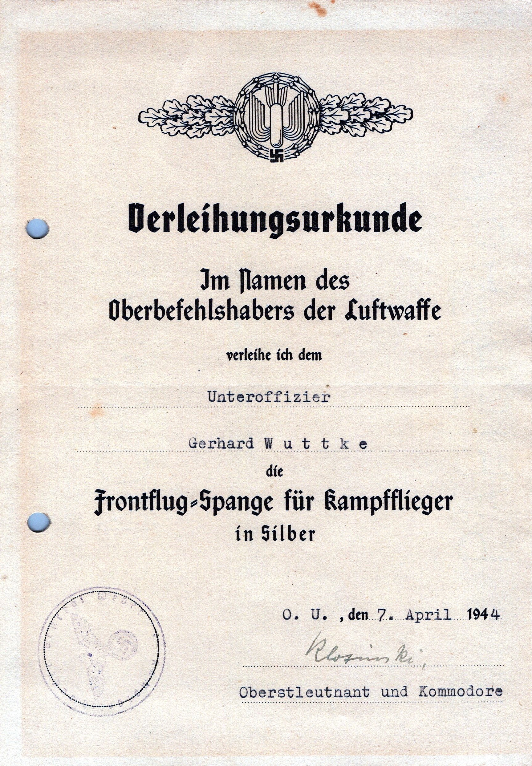 - Frontflug-Spange für Kampfflieger in Silber (Bomber Clasp in Silver) – awarded April 7, 1944