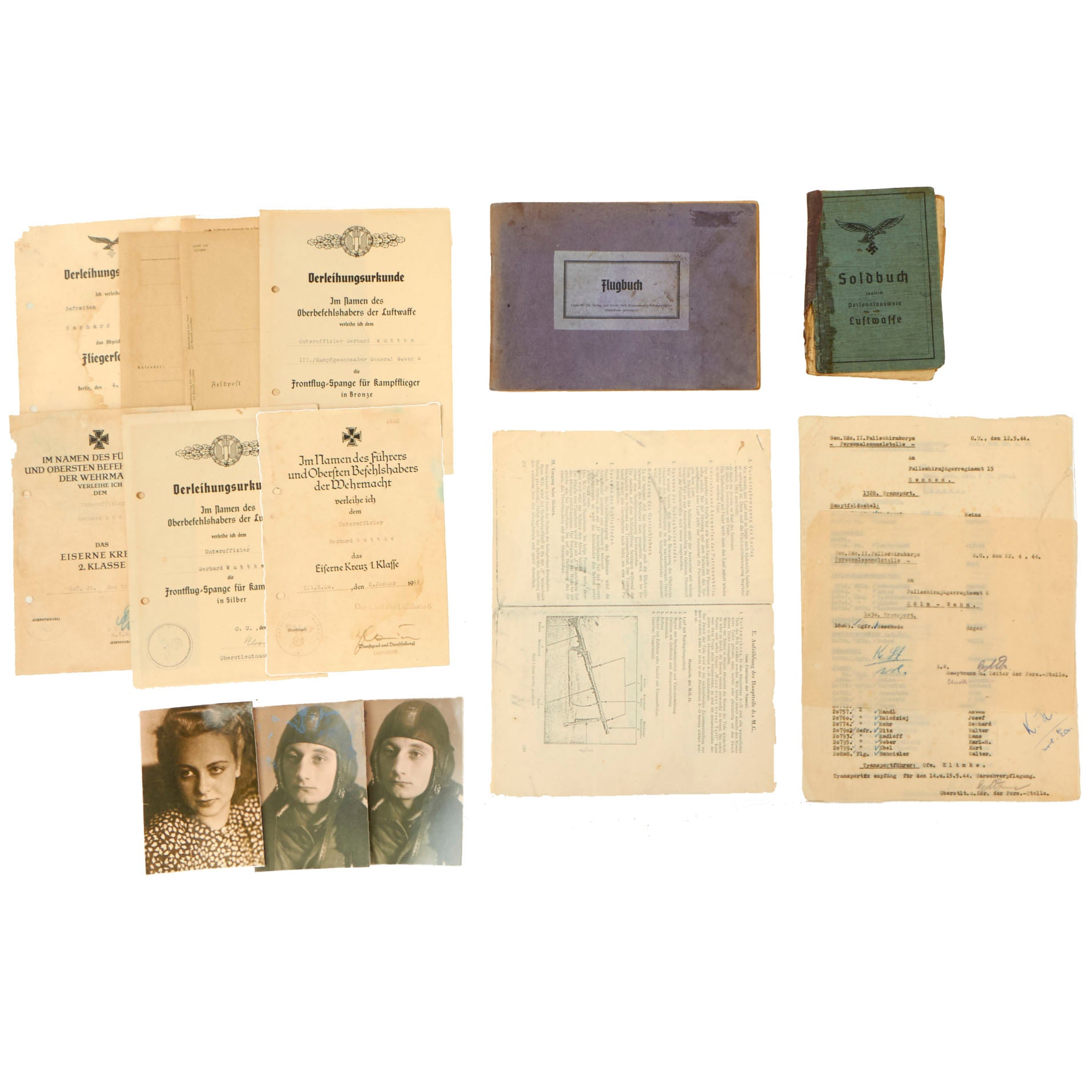 There are also award documents for the Iron Cross 2nd Class, Iron Cross First Class, Front Flying Clasp for Bombers Bronze Grade, Front Flying Clasp for Bombers Silver Grade, and the Air Gunner's Badge. Wuttke was a veteran soldier who flew on over 60 missions and was well decorated. Included with the documents are two identical photos of Wuttke in his flight helmet and gear, as well as a picture of what we assume is his wife.