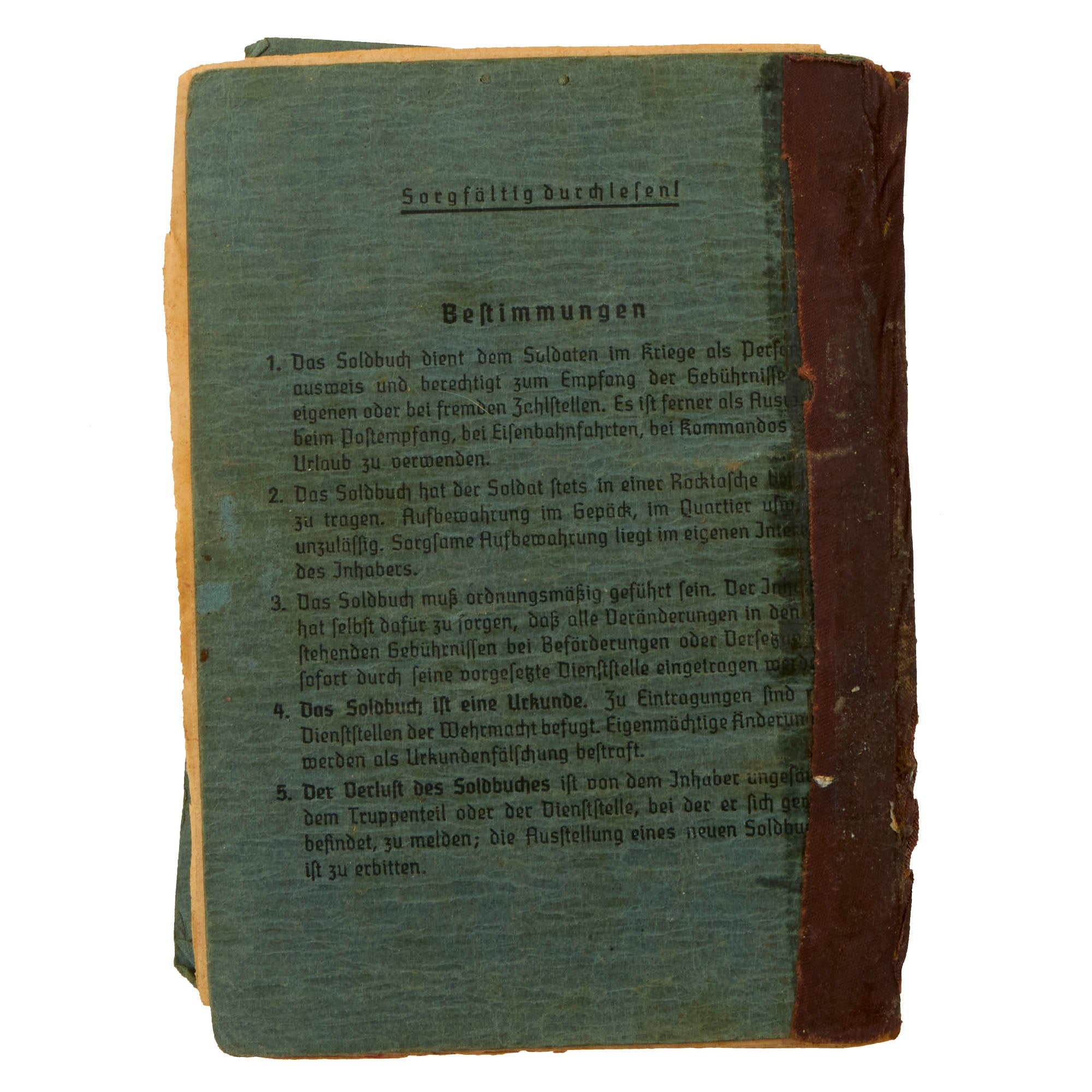 The Soldbuch served the soldier as a personal identification document in wartime and as an authorization to receive pay from his own or outside pay-stations. In addition, it was identification for rail travel, detached service, leave, and for receiving mail. The Soldbuch was always carried by the soldier on his person in a tunic pocket. Leaving the book in one's baggage or in one's quarters was not permitted. The careful preservation of the book was in the best interest of the owner. The Soldbuch had to be kept in an orderly fashion. The owner must see to it, that all changes in pay due to transfer or promotion are immediately entered by his responsible duty station. The Soldbuch was an official document. Entries were only to be made by a Wehrmacht duty station. Making unauthorized changes is punishable as falsification of official documents. The loss of a Soldbuch was to be reported as soon the loss is discovered to the holders unit or duty station, and the issue of a new Soldbuch will be requested.