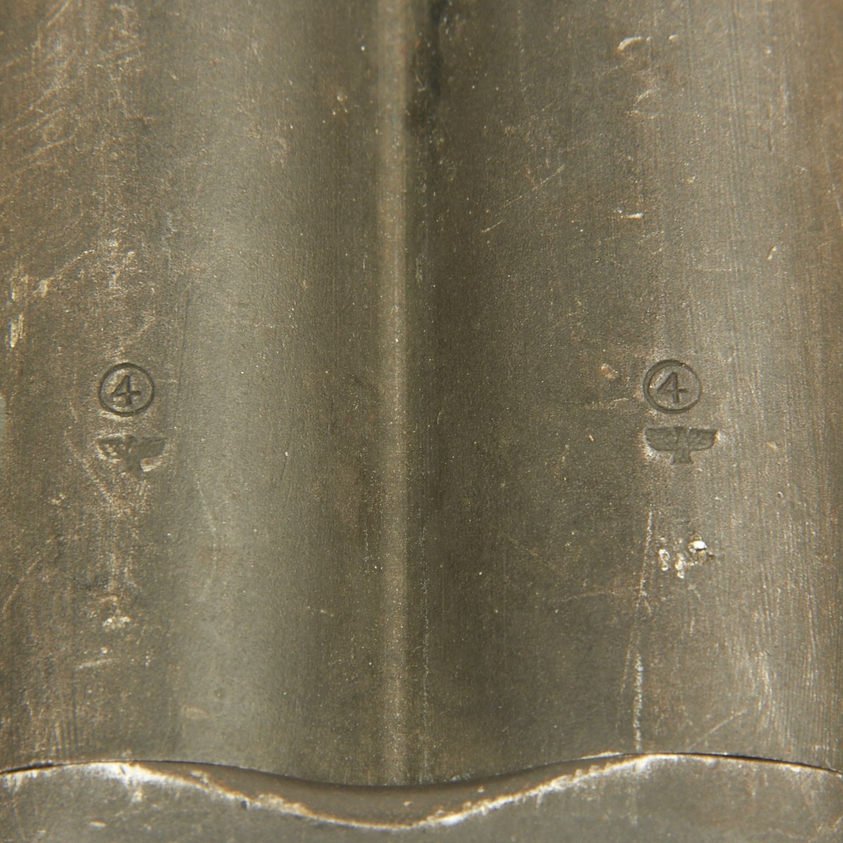 This pistol is marked with the maker code ecko for Emil Eckoldt of Suhl. The ordnance code is located to the rear of the safety lever on the left side of the frame. The tops of the barrels are both marked with a 4 in a circle (4-Bore) over the Luftwaffe Stick Eagle acceptance mark. This same proof appears on the rear of the receiver between the L and R barrel selector marks, and is covered when the selector switch is in the middle or both barrels position.