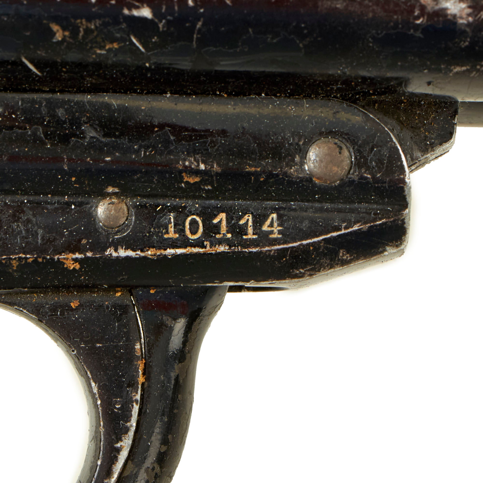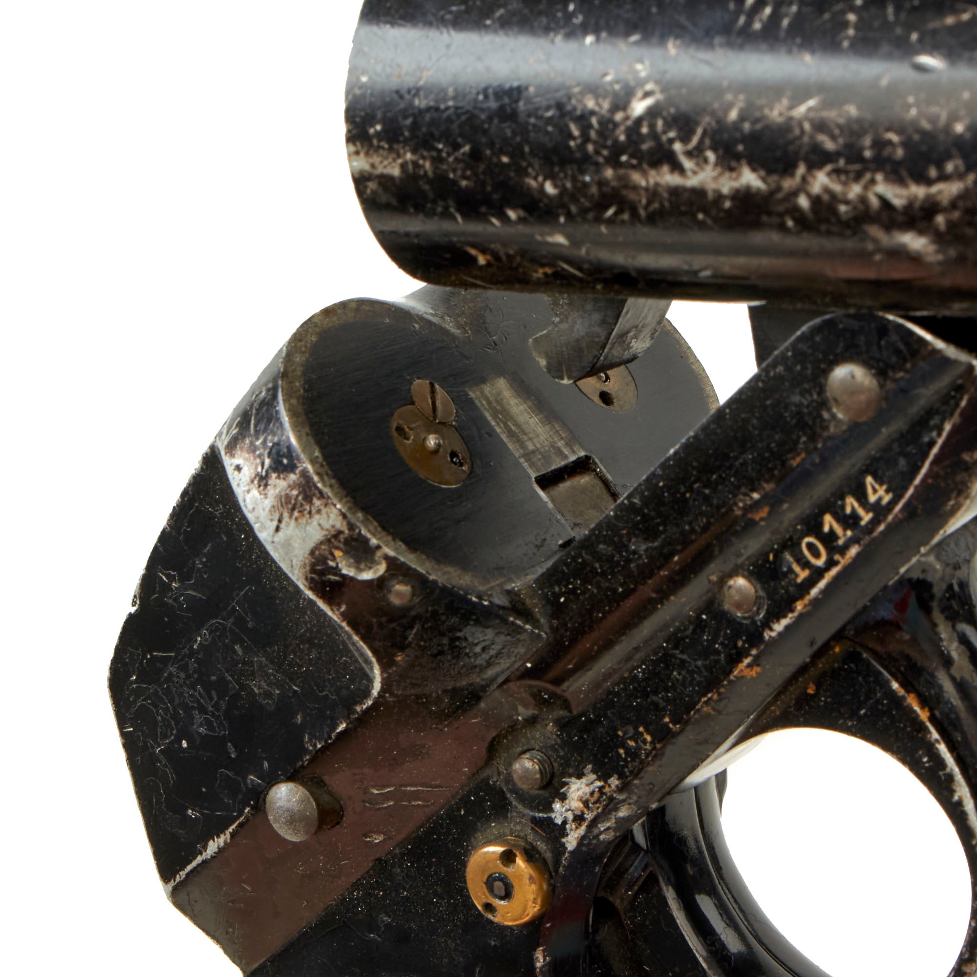 The signal pistol is marked with serial number 10114 on the forward lower portion of the right hand side of the frame, and the Luftwaffe part number F.L. 24483 is present on the opposite side of the frame. The same serial number is duplicated on the left underside of the barrel assembly. The gun has a frame mounted safety with Fire and Safe markings.