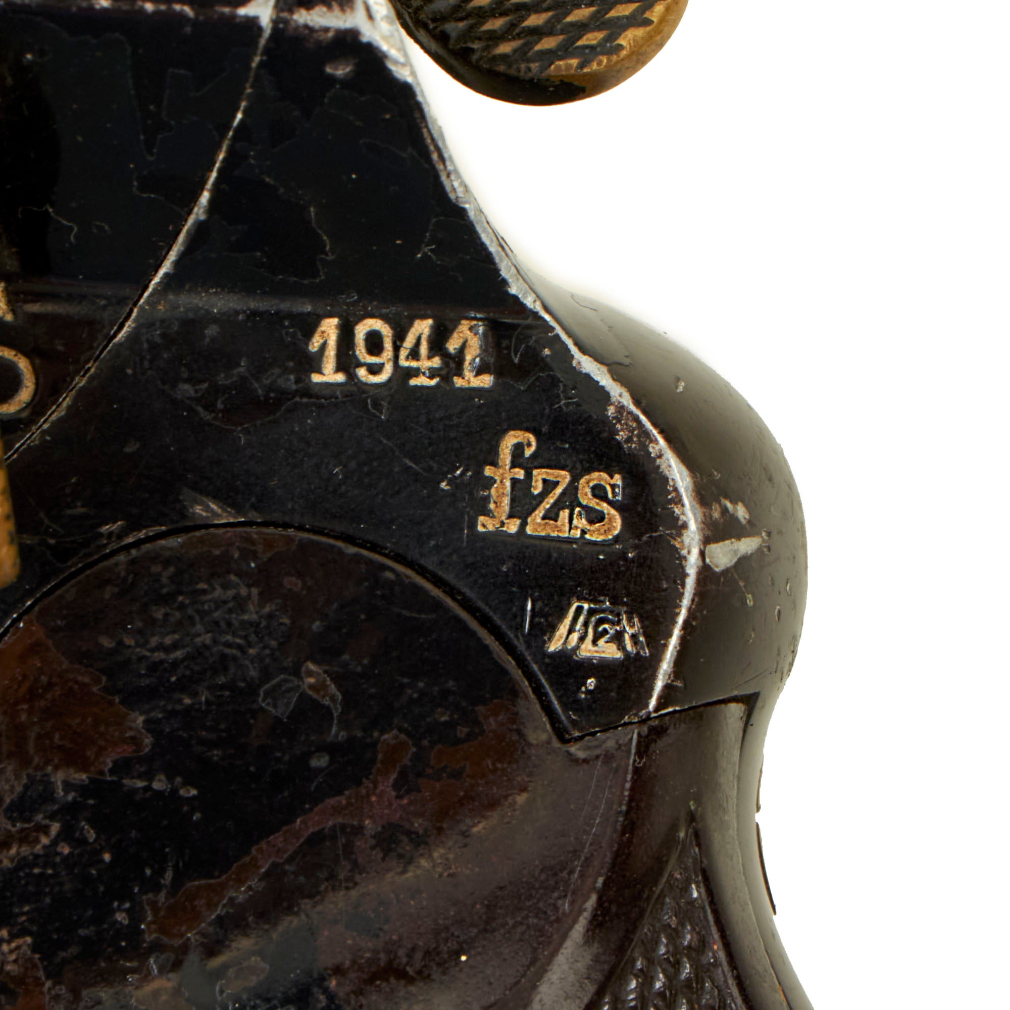 This pistol is marked with the maker code fzs, the code assigned to the extremely famous Heinrich Krieghoff Waffenfabrik (Weapons Factory) in Suhl, Germany. After WWII, the company reformed as simply the "Krieghoff" company in Ulm, Germany, and still exists today. The ordnance code is located to the rear of the safety lever on the left side of the frame, over a Luftwaffe "Stick Eagle" / 2 inspection mark. The tops of the barrels are both marked with a 4 in a circle (4-Bore or 26.72mm) over the Luftwaffe Eagle acceptance mark. This same proof appears on the rear of the receiver between the L and R barrel selector marks, and is covered when the selector switch is in the middle or "both barrels" position.