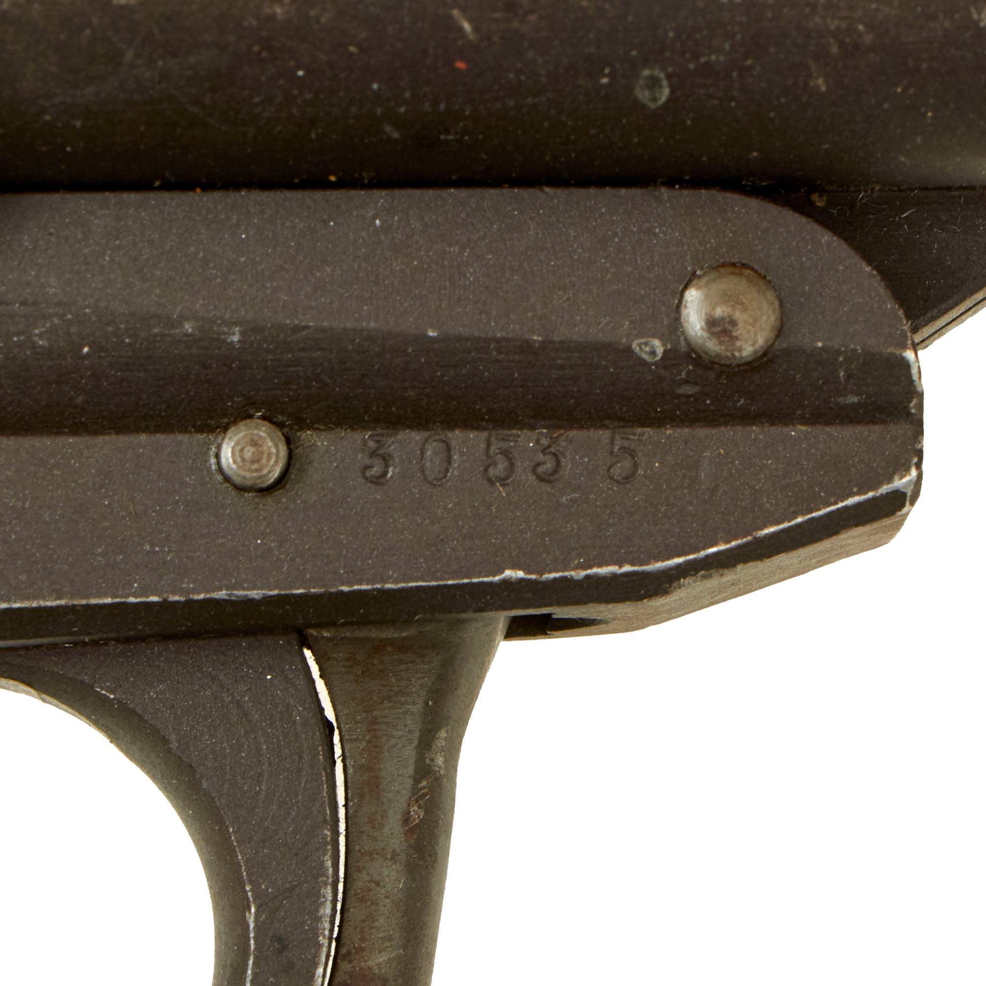 The Flare Gun L offered here is really in great condition, and has no functional issues that we were able to note. It breaks open and cocks correctly, and the barrel selector and safety are fully functional. The matte anodized finish on the 'duralumin' alloy is retained well, as is the bluing on the steel components. The two-piece black Bakelite grips are in excellent condition. They retain sharp checkering, with only the most minor handling and finish wear. They are free of any of the breaks, chips or cracks which often mar Bakelite grips, especially when they are nearly 70 years old!