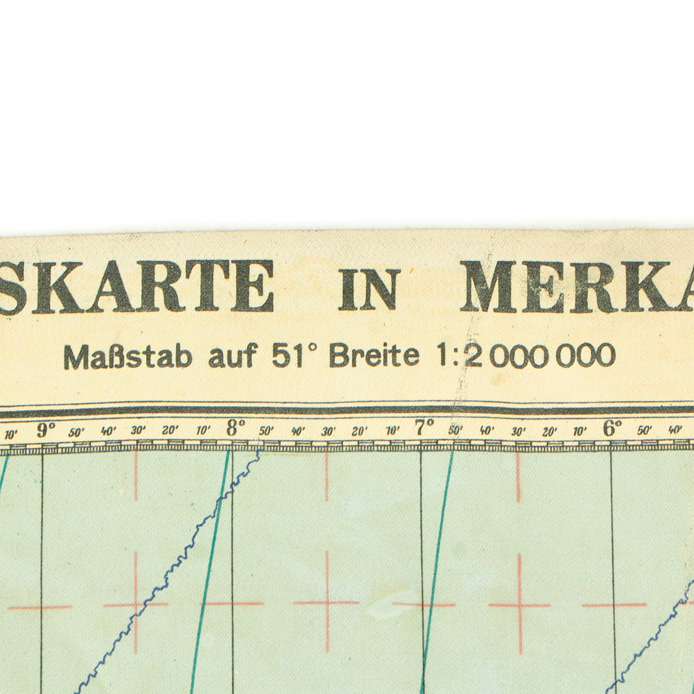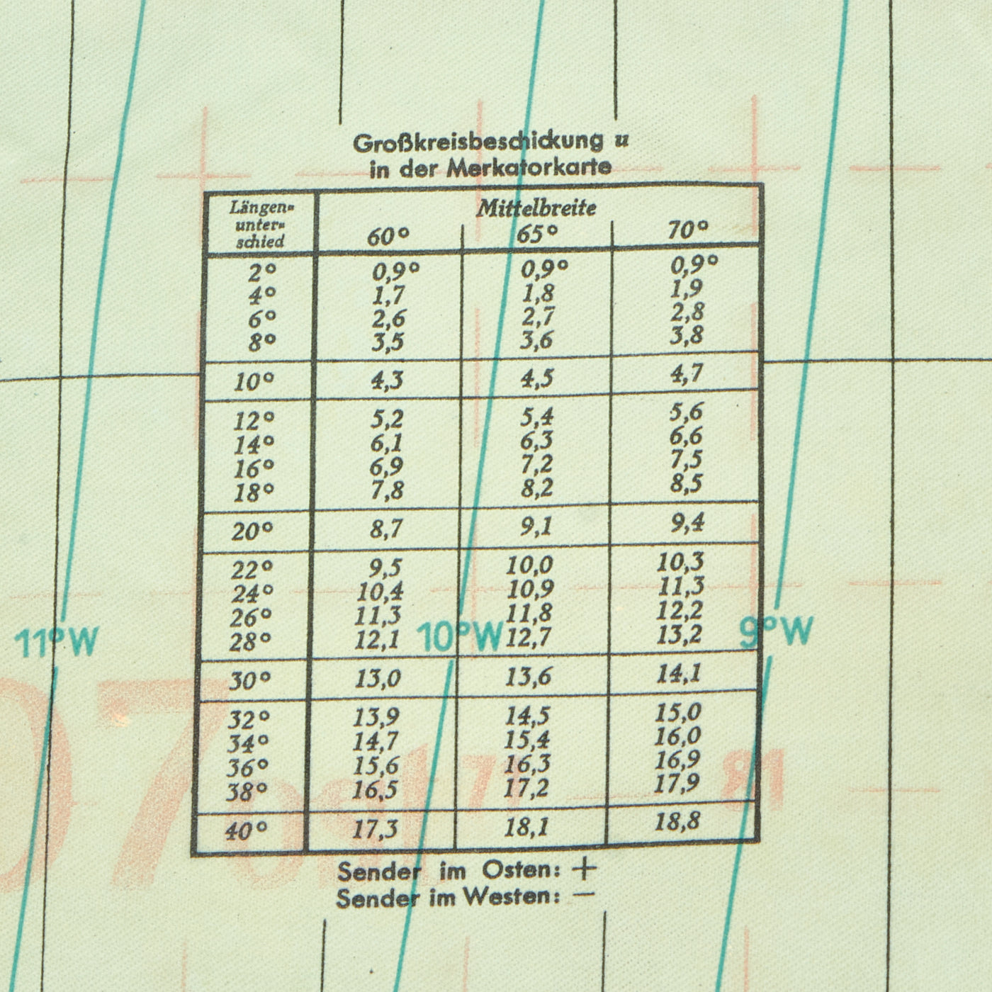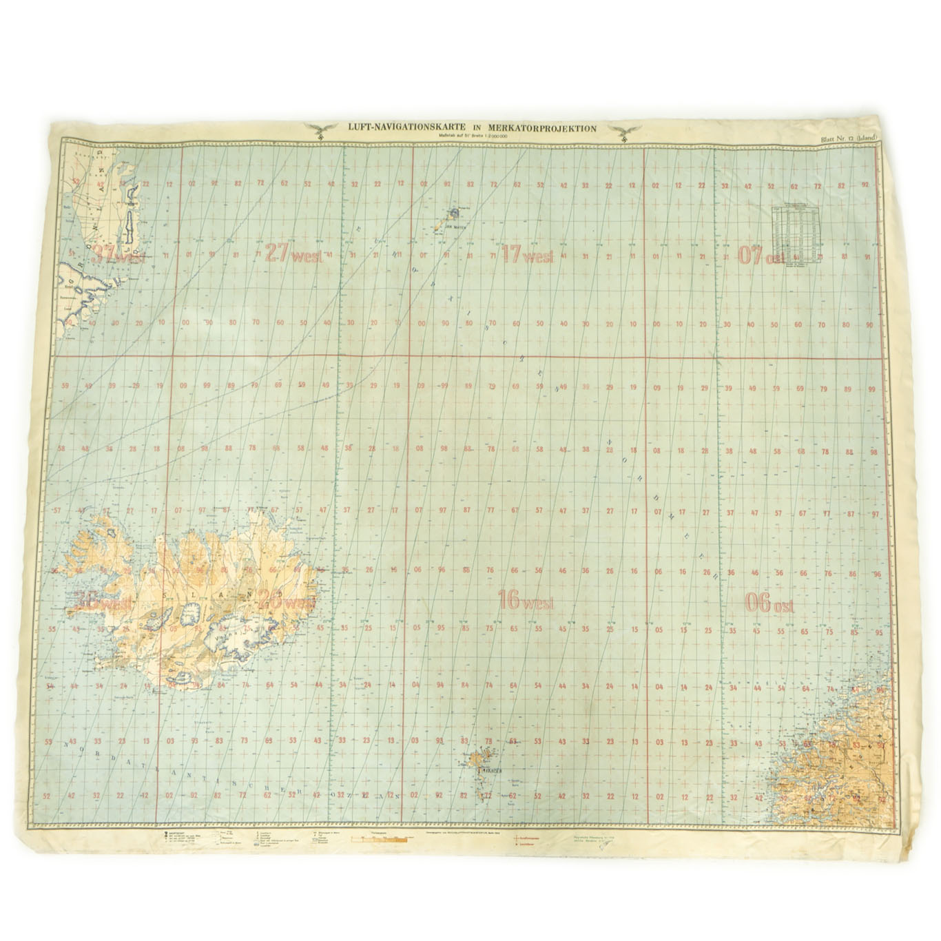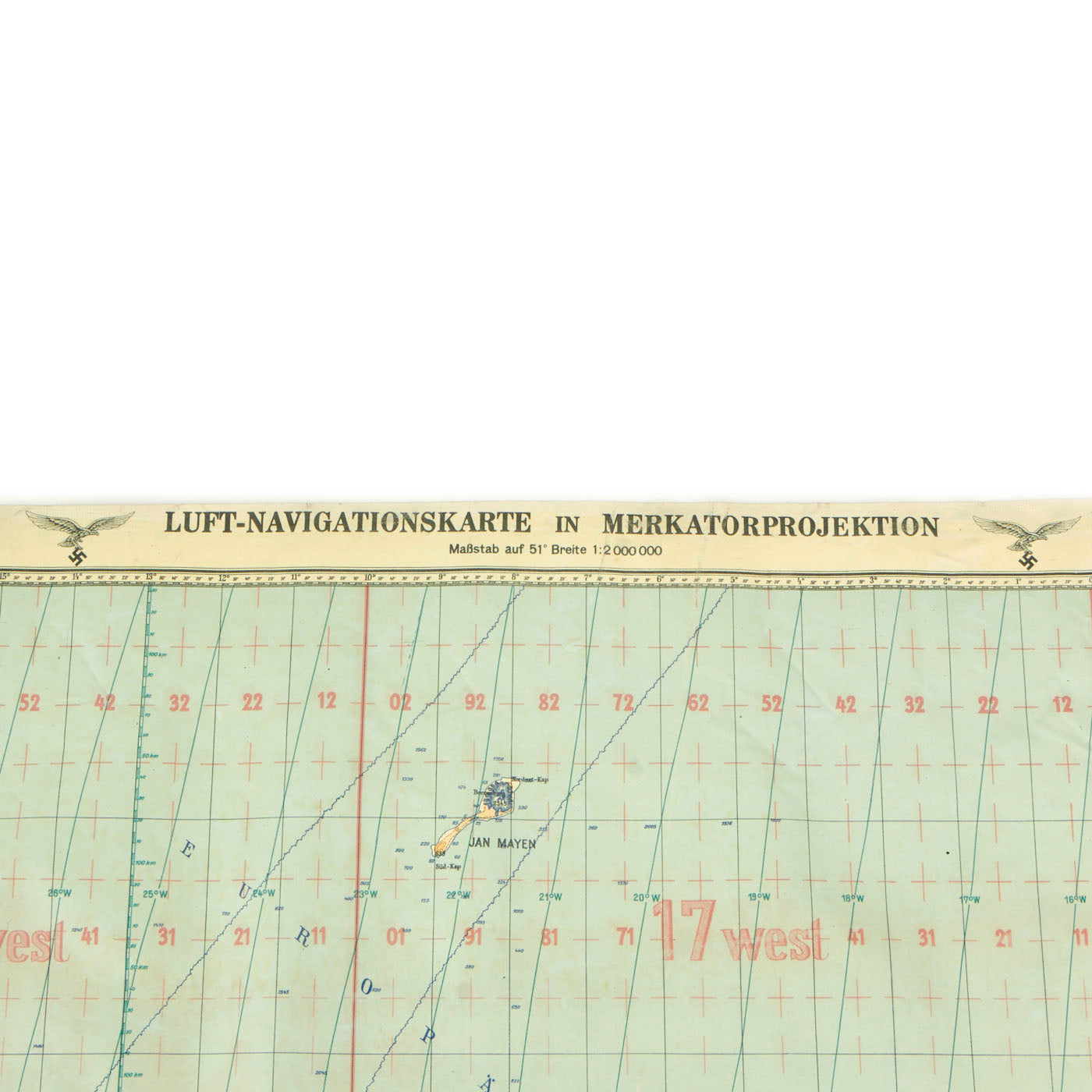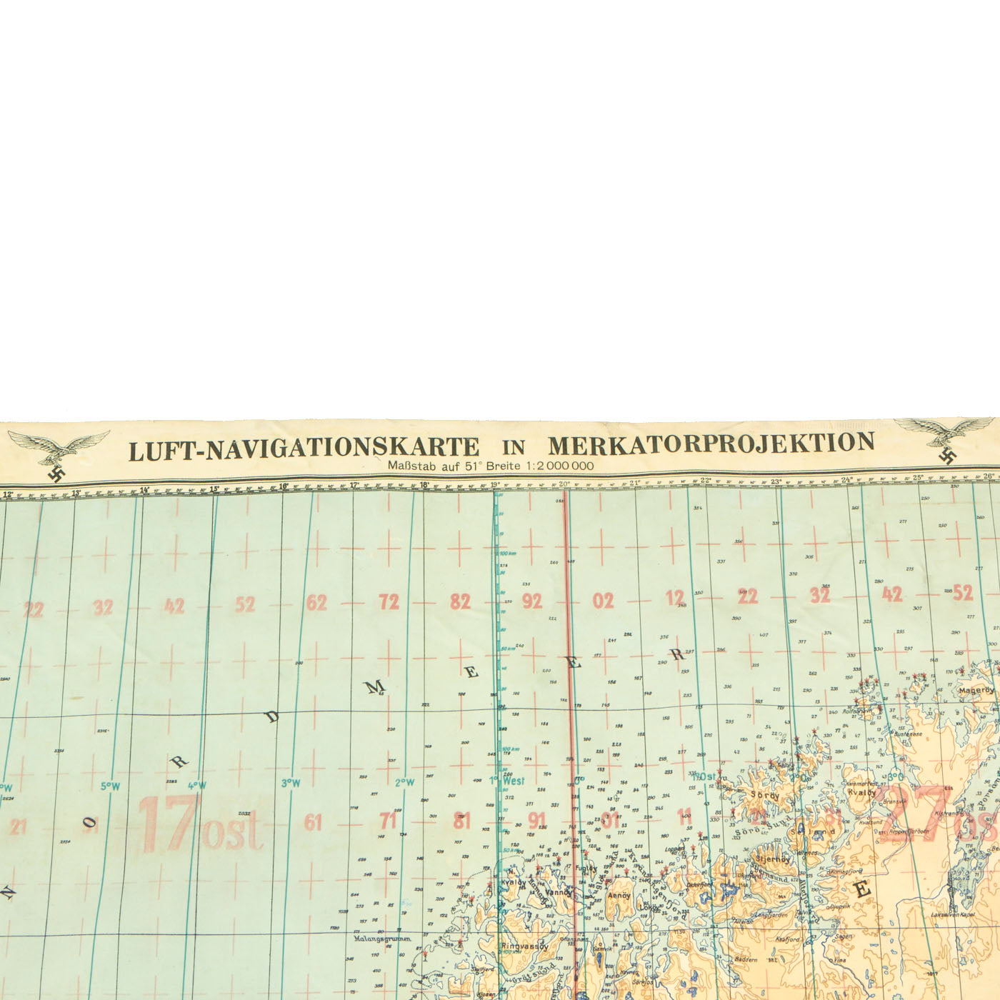 Original Item: Only One Available. This is a wonderful 1: 2,000,000 Scale waterproof vinyl type map with Luftwaffe Eagles surrounding LUFT - NAVIGATIONSKARTE IN MERKATORPROJEKTION (Air- Navigation Map in Mercator Projection) across the top. As noted by the legend, this map is part of a series of maps, which when used together would cover much of the North Atlantic and Europe. These large maps were used on the ground when planning operations at command centers.