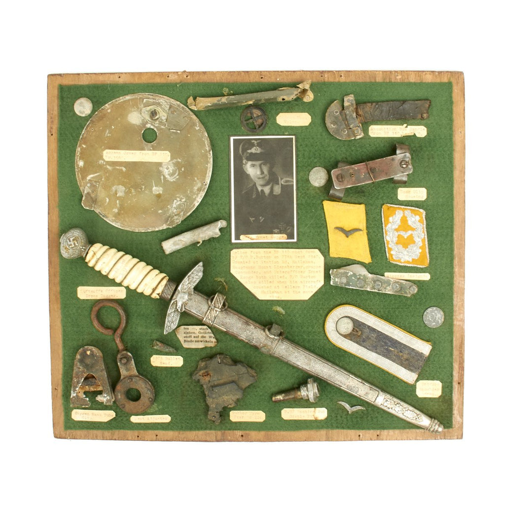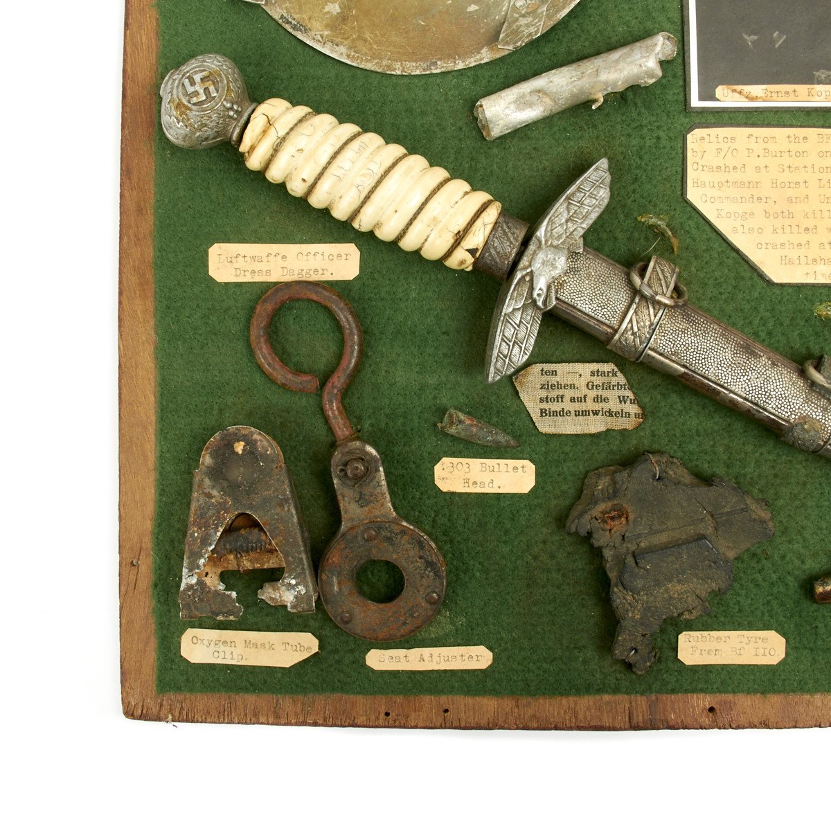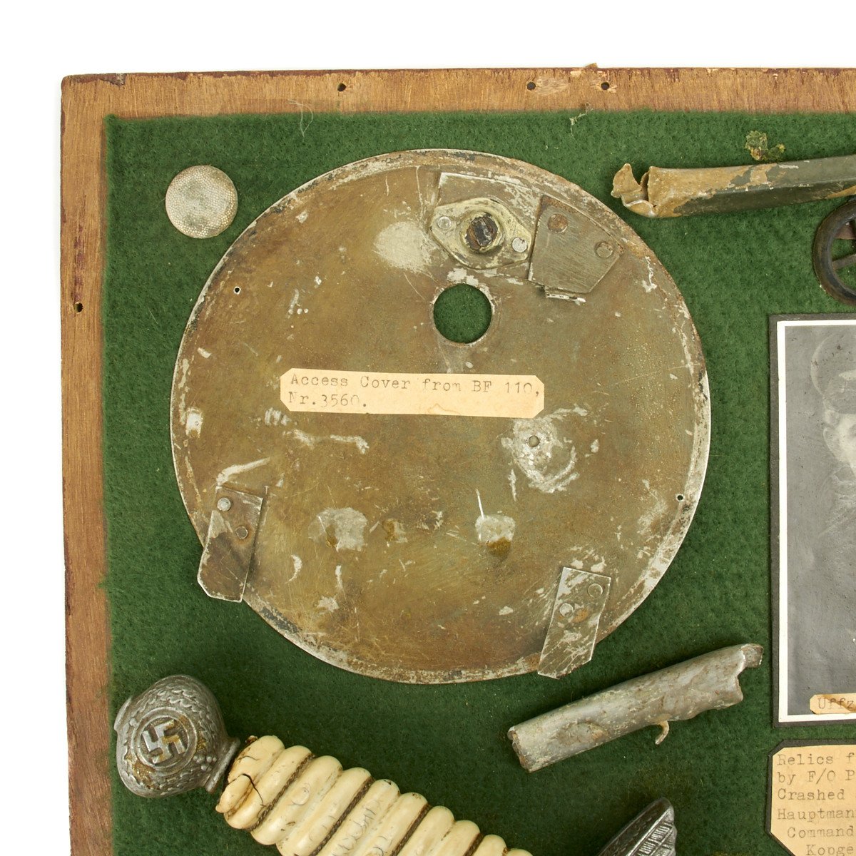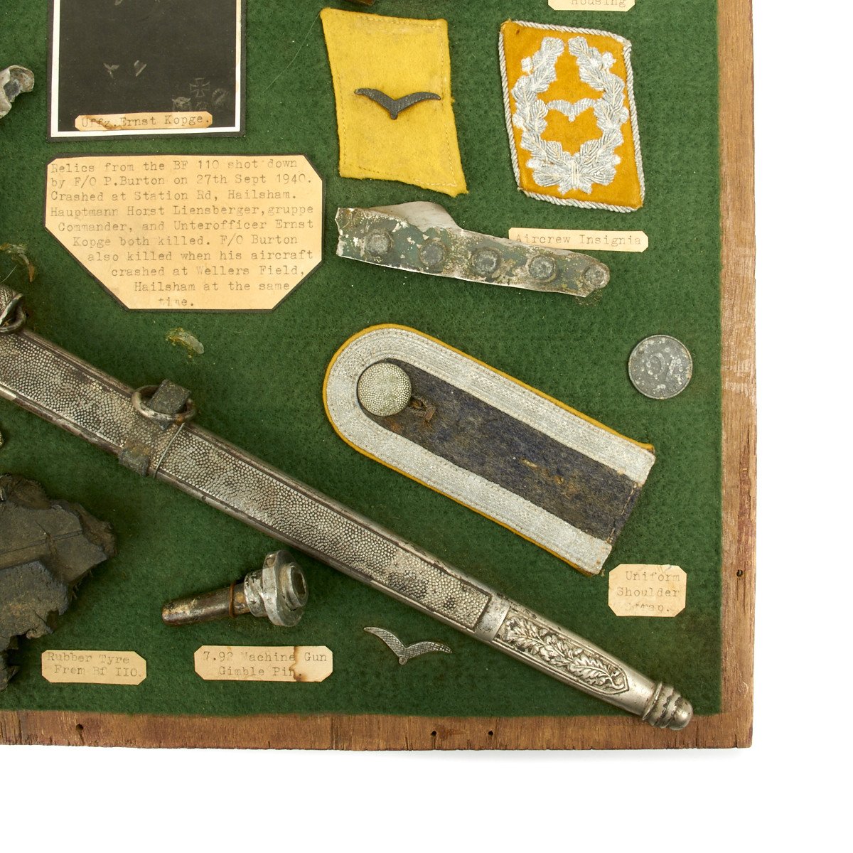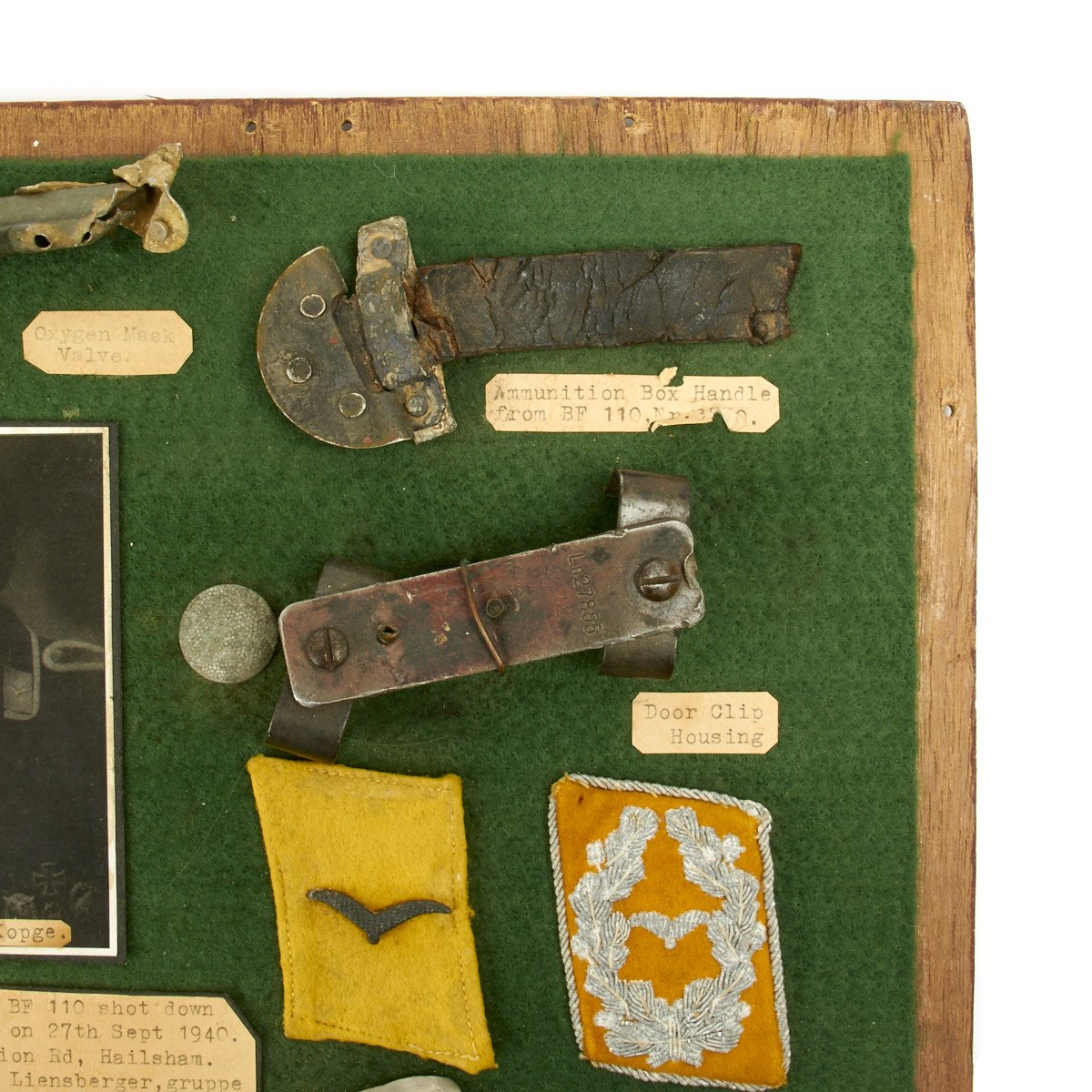 The board is felt backed and measures 14.5 W x 16.5 H. This is a one-of-a-kind set with wonderful provenance and evidence of an incredible dog fight ending in tragedy for both the German crew and the British fighter pilot defending his homeland from the German blitz.