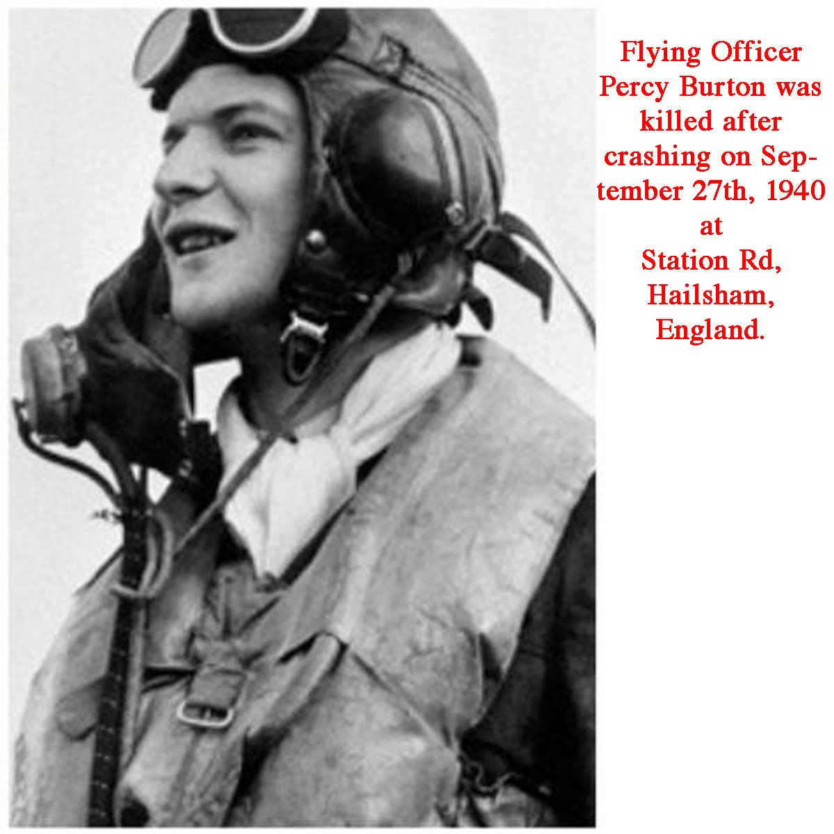 September 27th 1940 - F/O Percy Burton of No.249 Squadron in Hurricane, V6883, was above and behind the Me110. Burton banked, suddenly, and made what appeared to be an attack. Both machines lurched and an object spun away. The tail unit of the 110 dropped into a field, followed by the rest of the aircraft. The falling object was the wingtip of Burton's Hurricane. His aircraft crashed into a huge oak tree on New Barn Farm, throwing its dead pilot clear and burning itself out in a field.