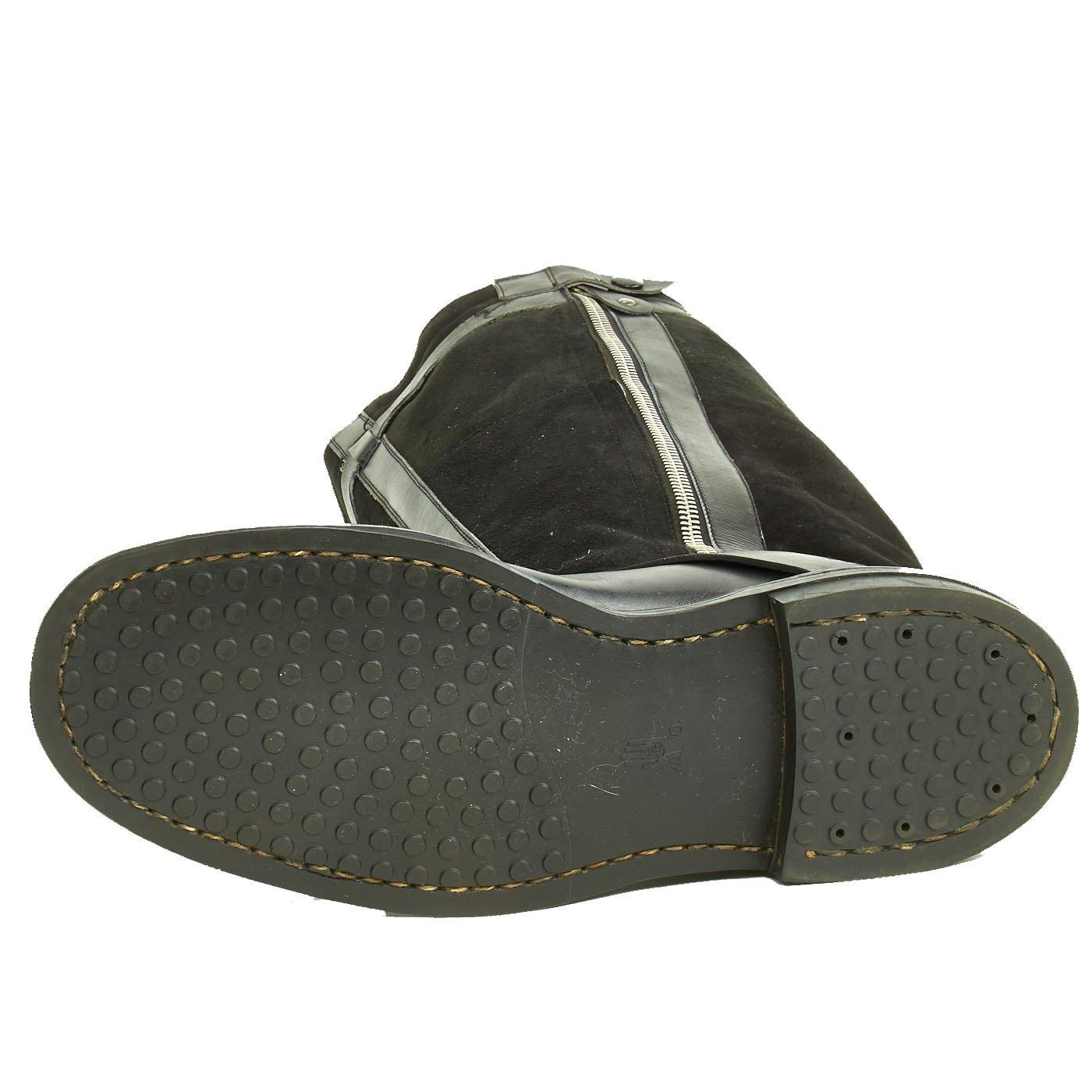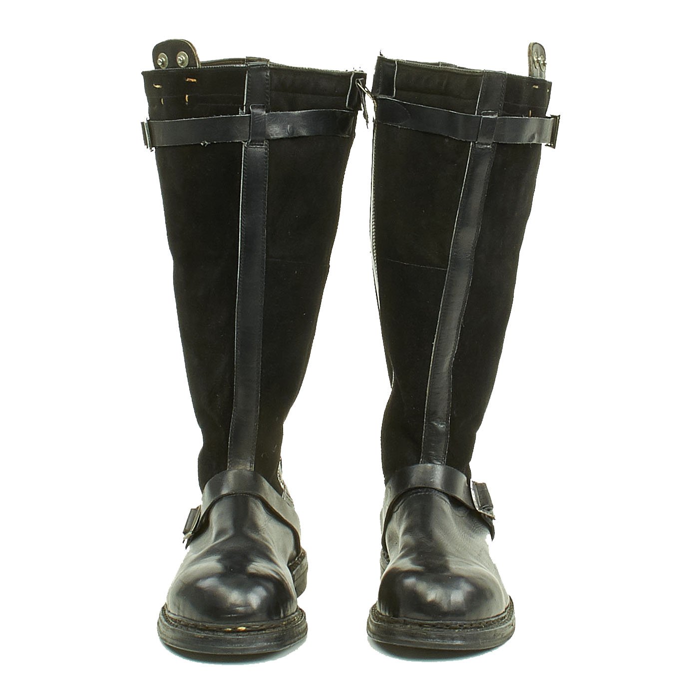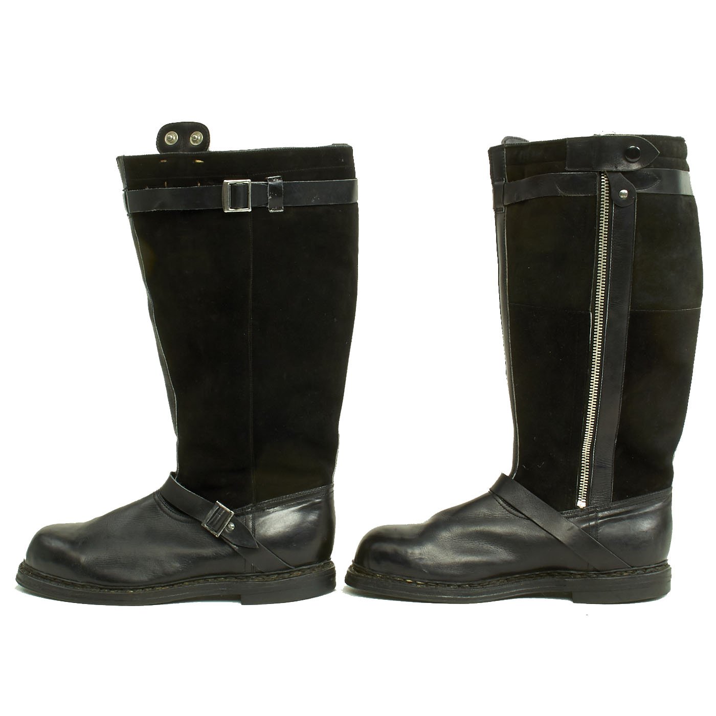 Original Items: Only One Pair Available. This is a mint condition pair of German World War Two 1940 Pattern Luftwaffe Airman's Flying Boots. The construction is of black leather for the shoe area and black suede for the shafts. Electrical elements are enclosed in the boot with the standard Luftwaffe press-stud connectors at the top. These would snap onto the matching connectors on the trousers.