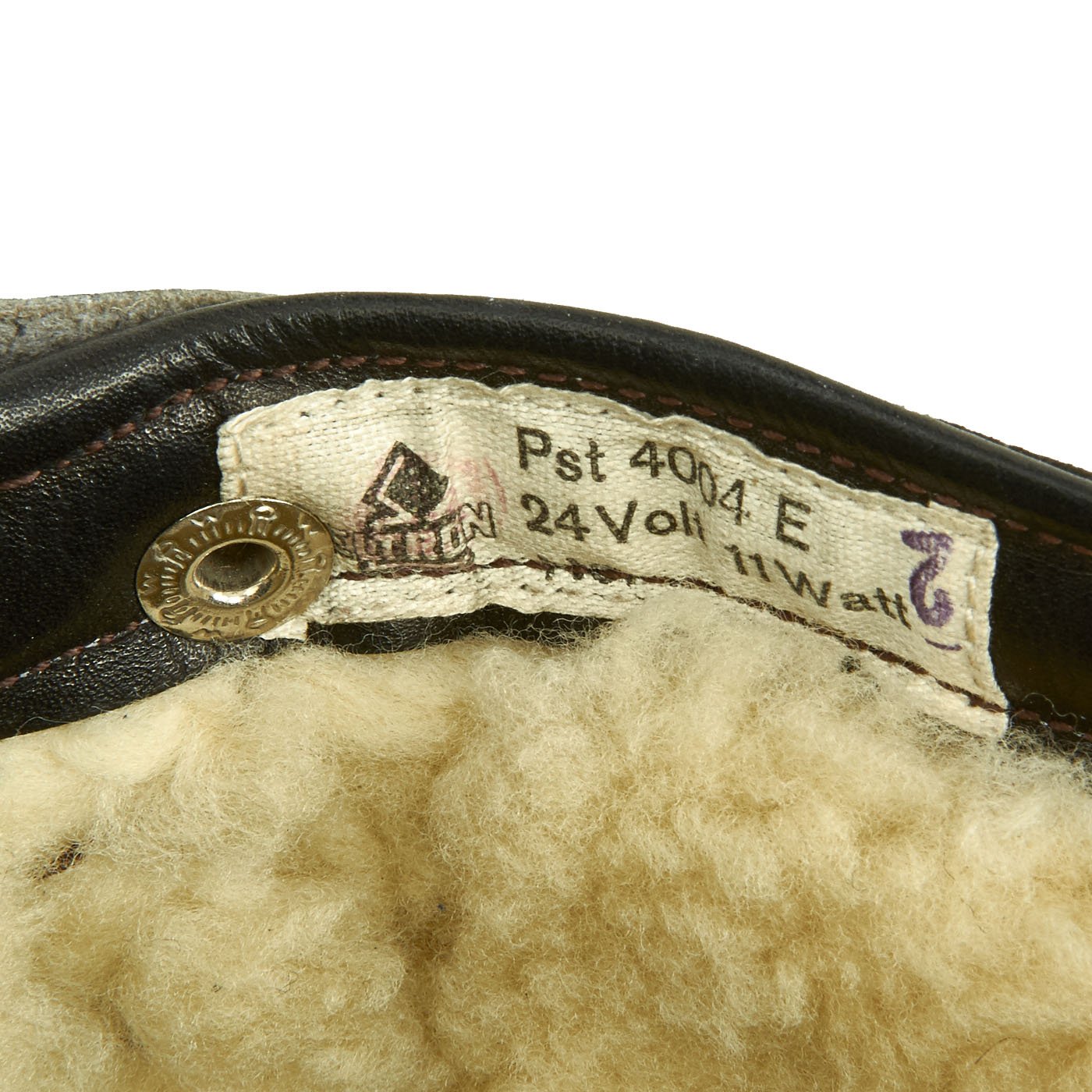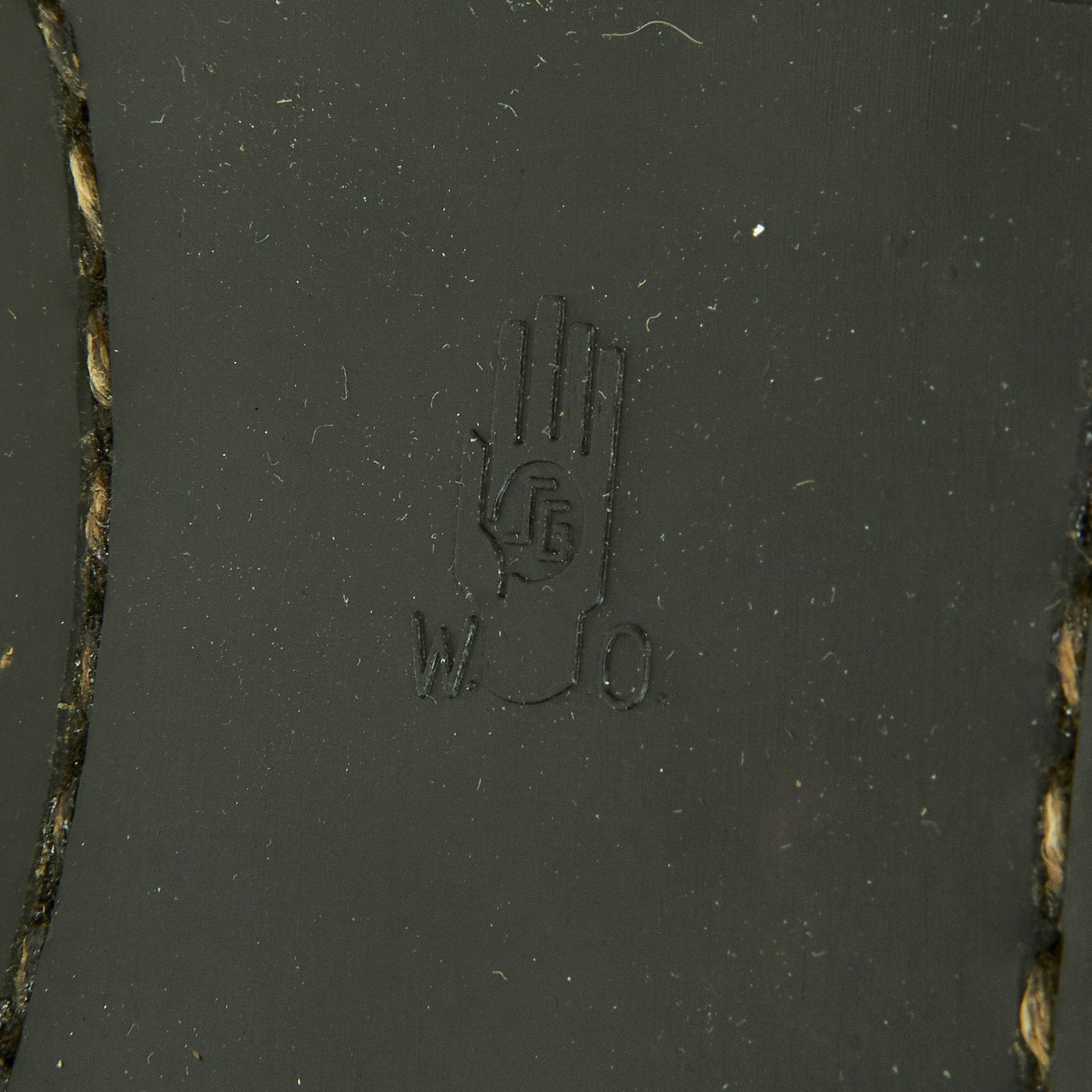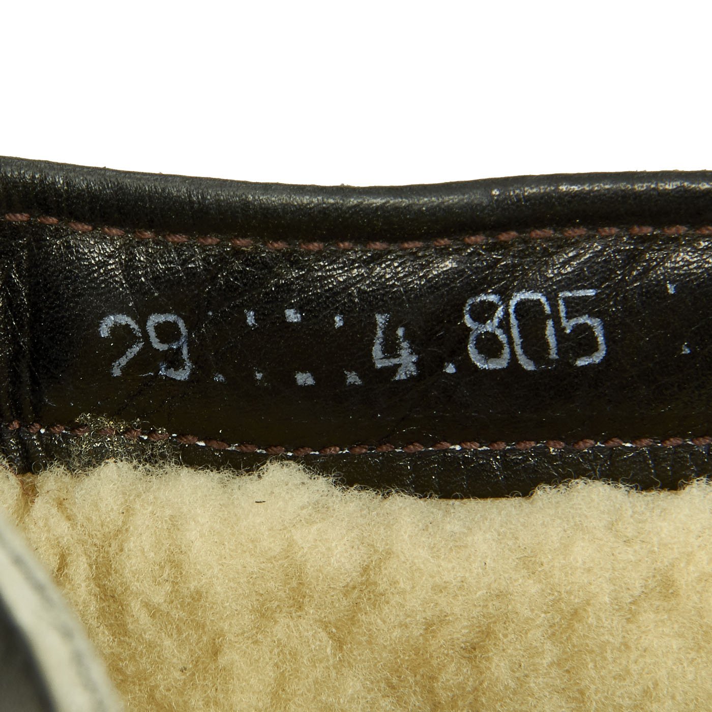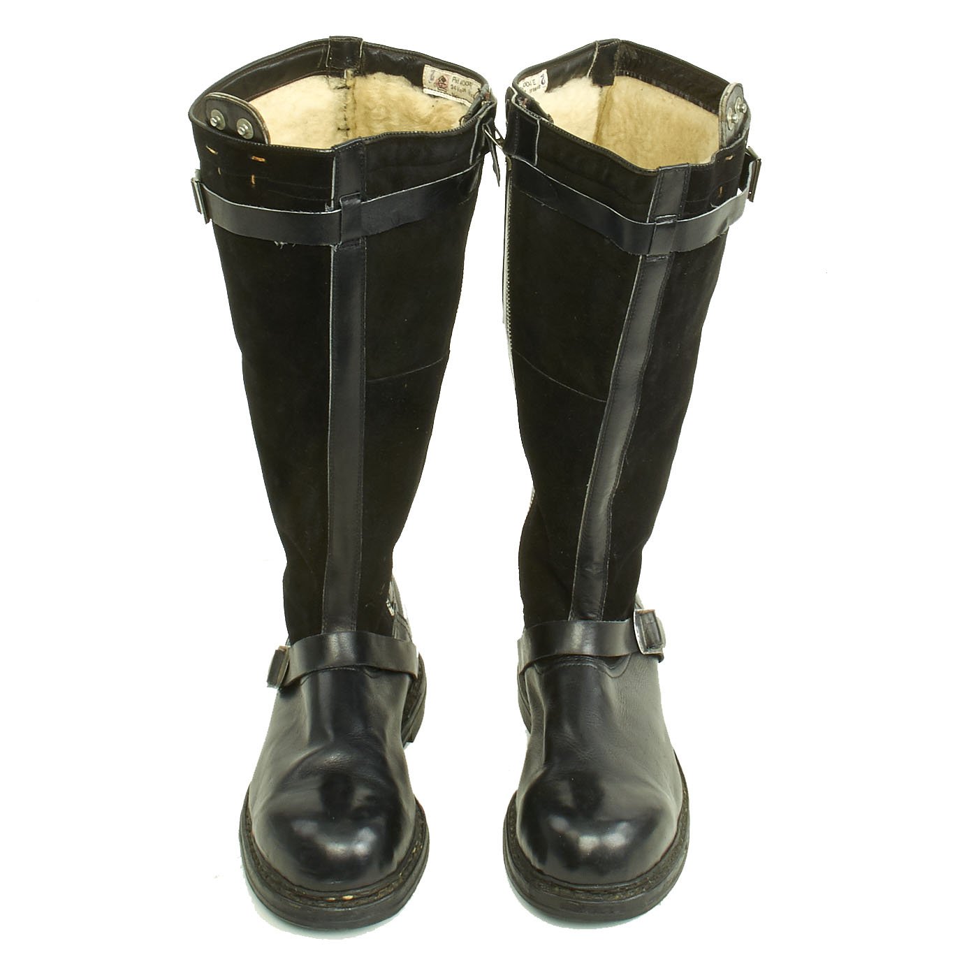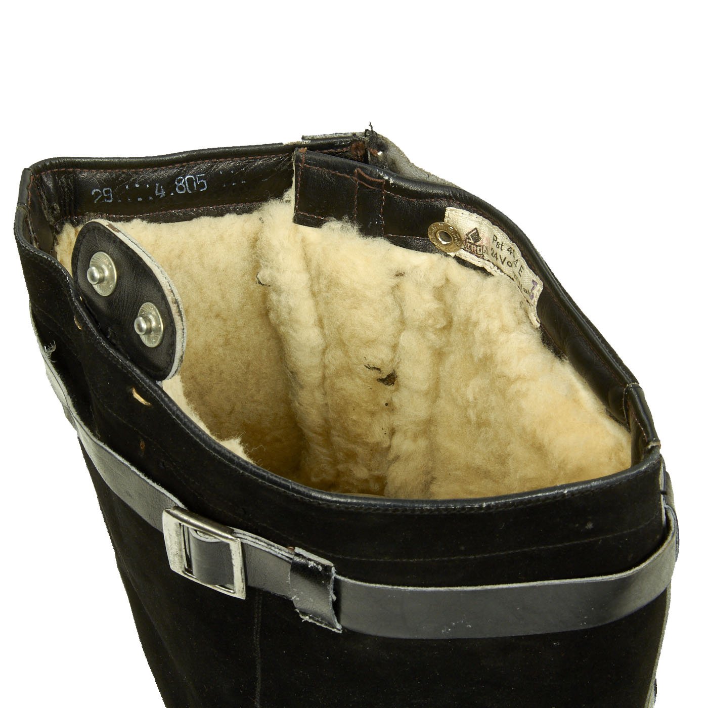 Each boot has a label inside the zipper reading 29 4 805, indicating a size 29 cm. The original Rapid zippers are in excellent condition. The snaps and buckles are excellent and perfectly functional. The fleece lining is fantastic as are the soles. Black rubber soles feature a hand logo with "SG" and also "W.O." Perfect to complement any heated flight suit, or a great piece on their own.